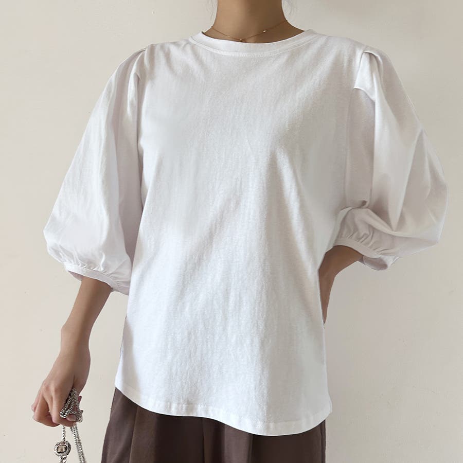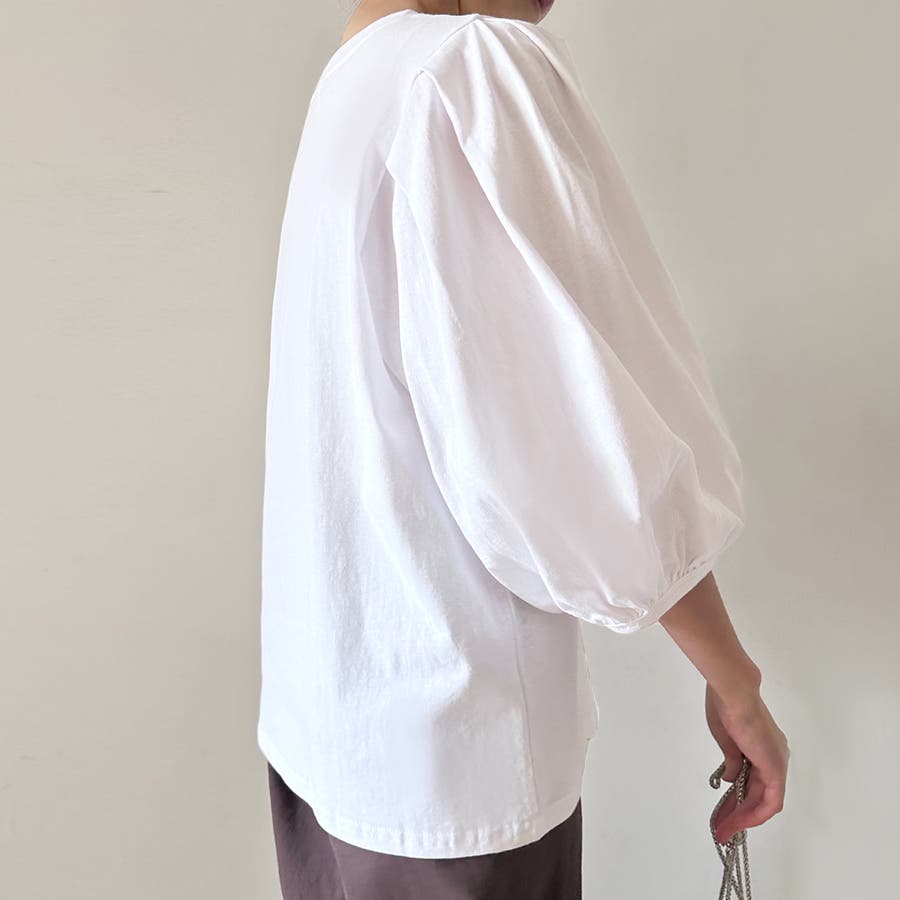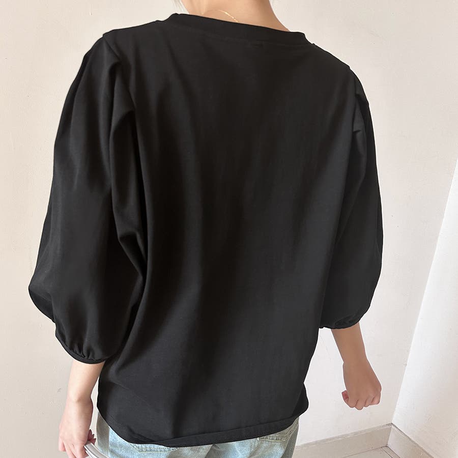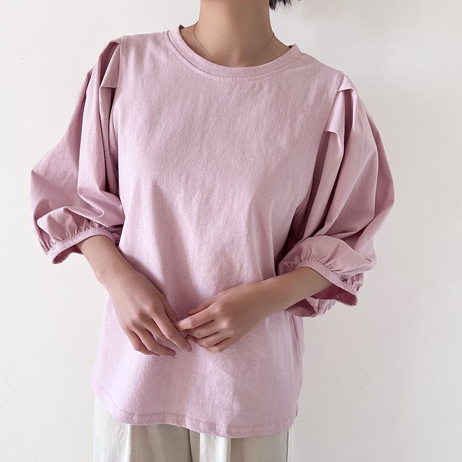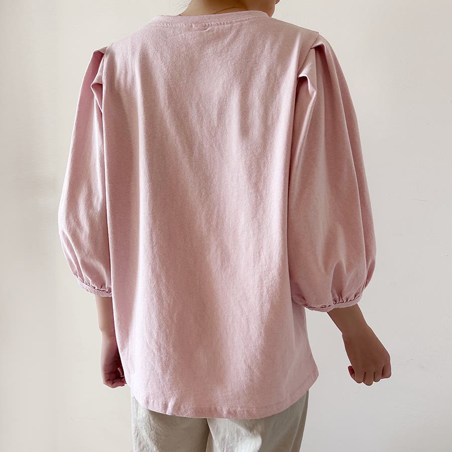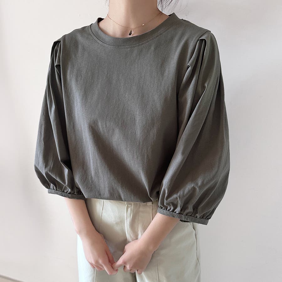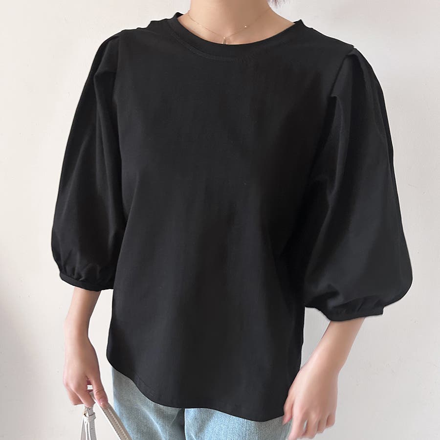 ボリュームスリーブでややボリューム感がありながら、ラウンドネックでスッキリ綺麗めに仕上げました。