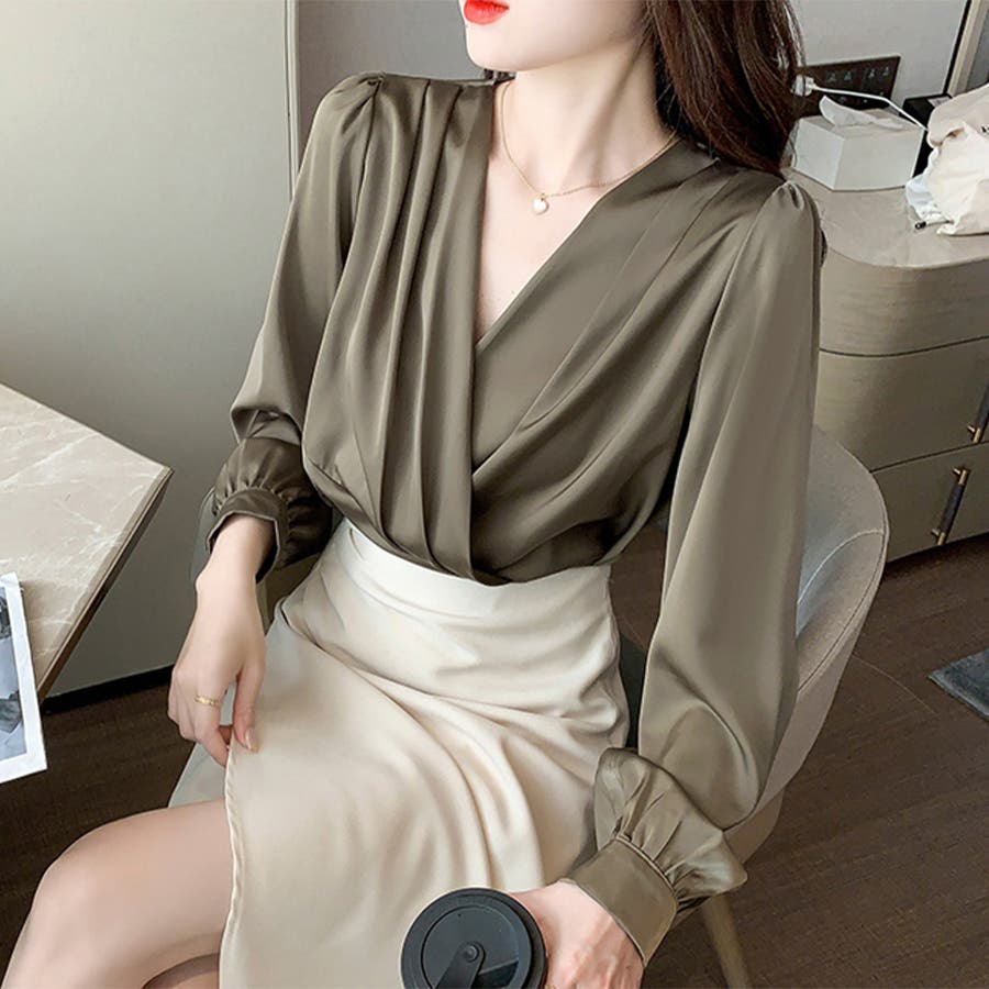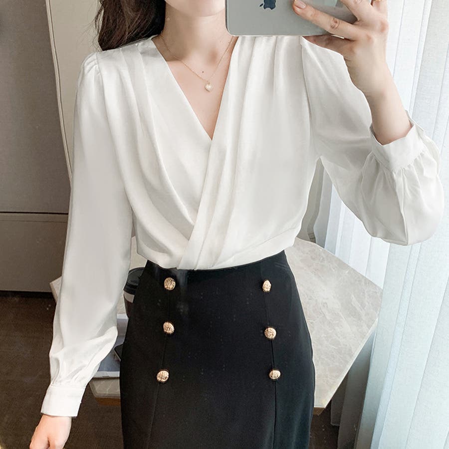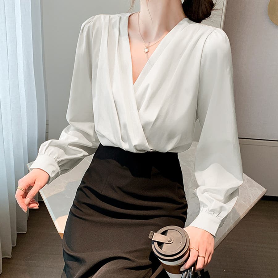 ラップ風のVネックデザインが顔まわりをすっきり見せる、上品な長袖ブラウス。