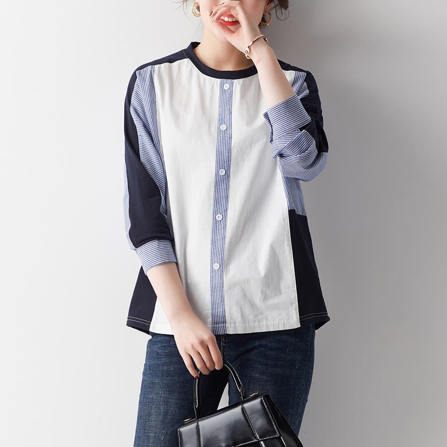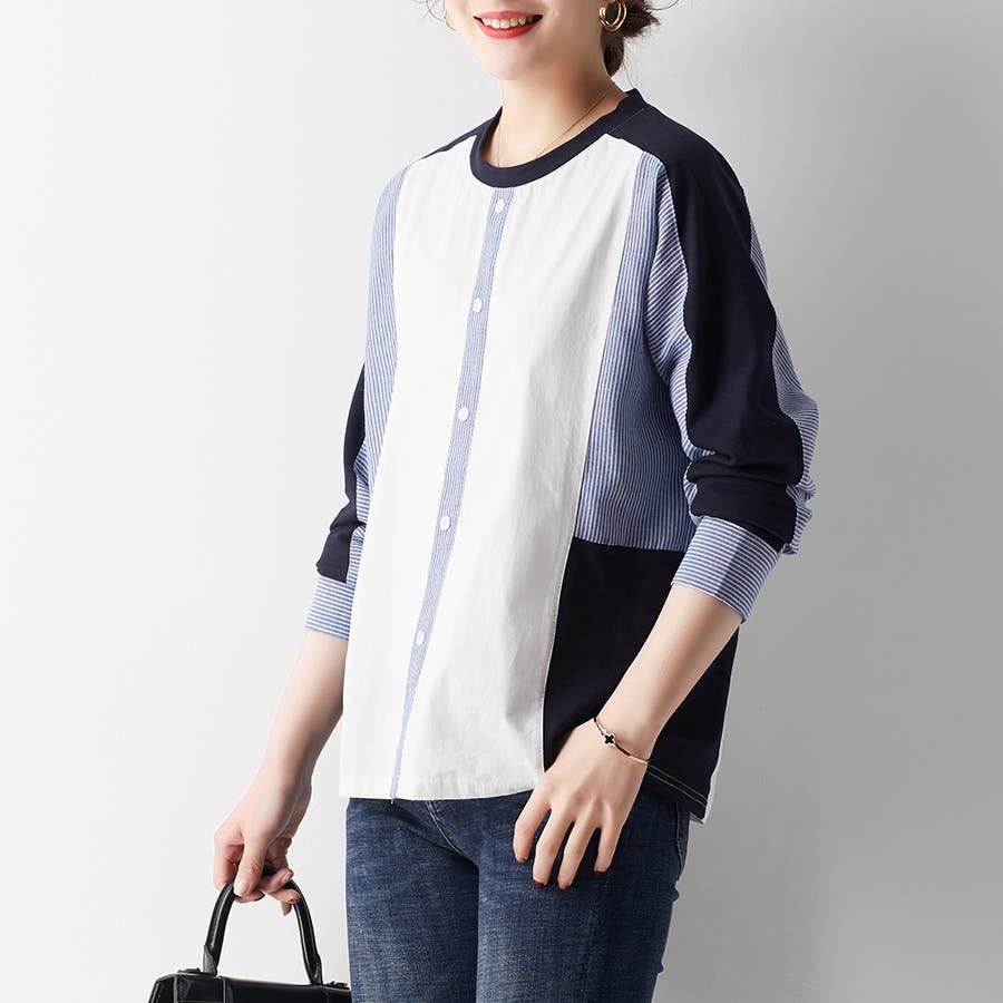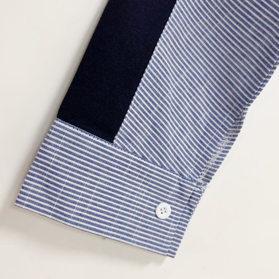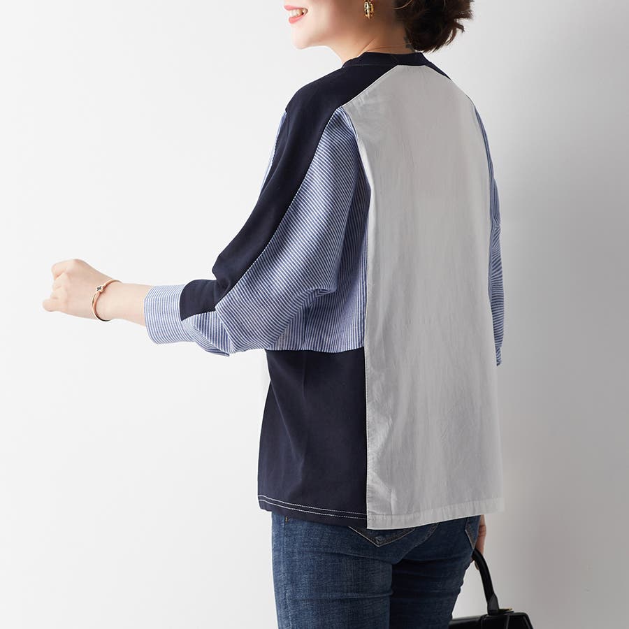異素材×配色切り替えが目を惹く、パッチワーク風デザインの長袖シャツ。