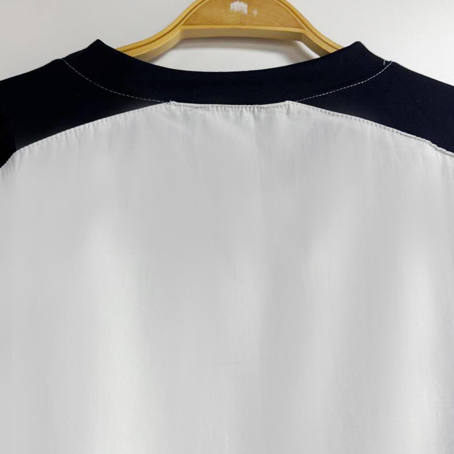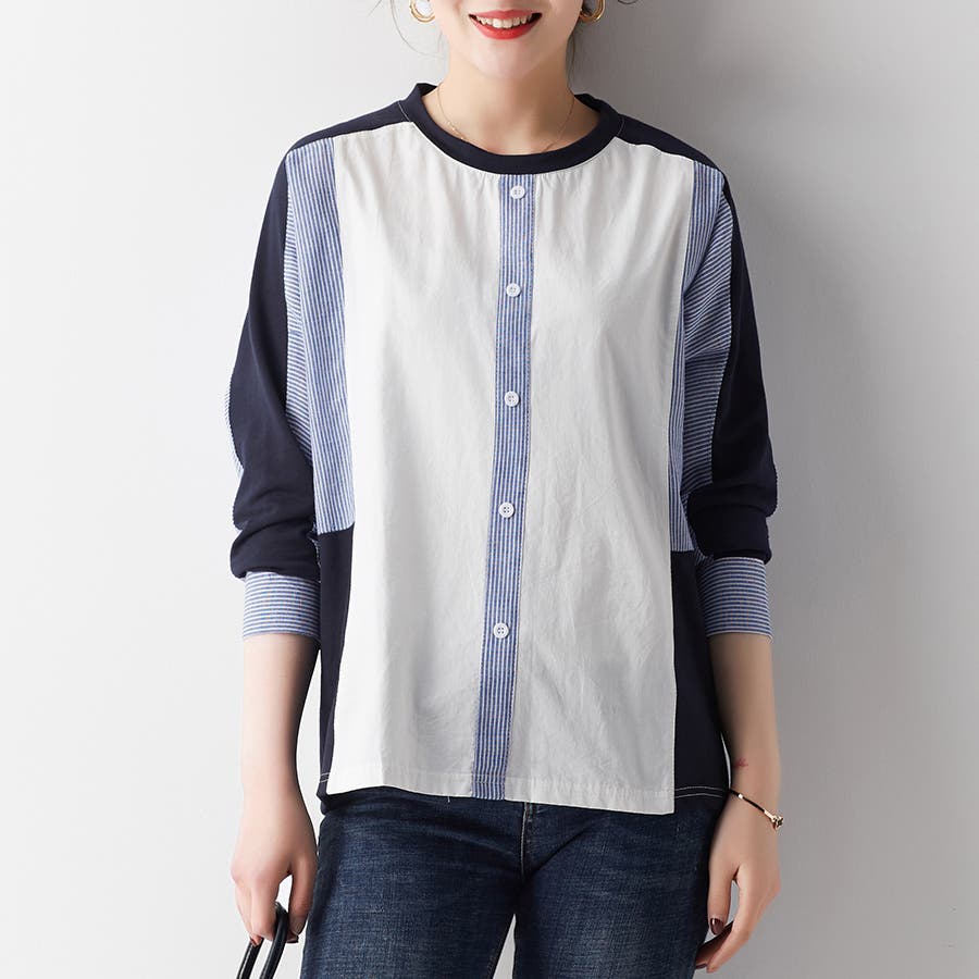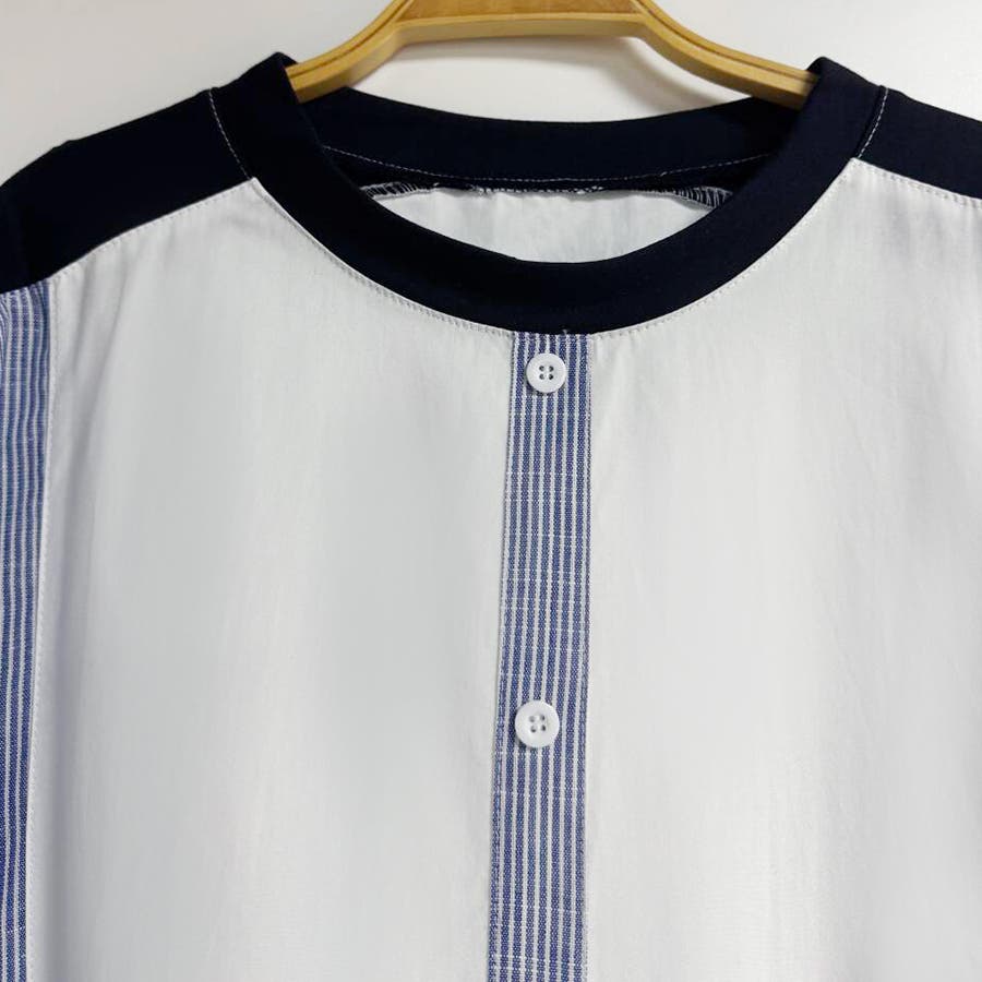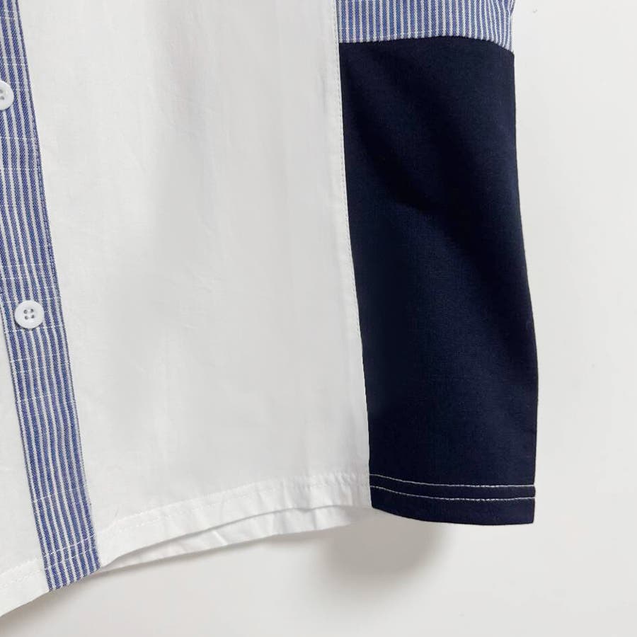 異素材×配色切り替えが目を惹く、パッチワーク風デザインの長袖シャツ。