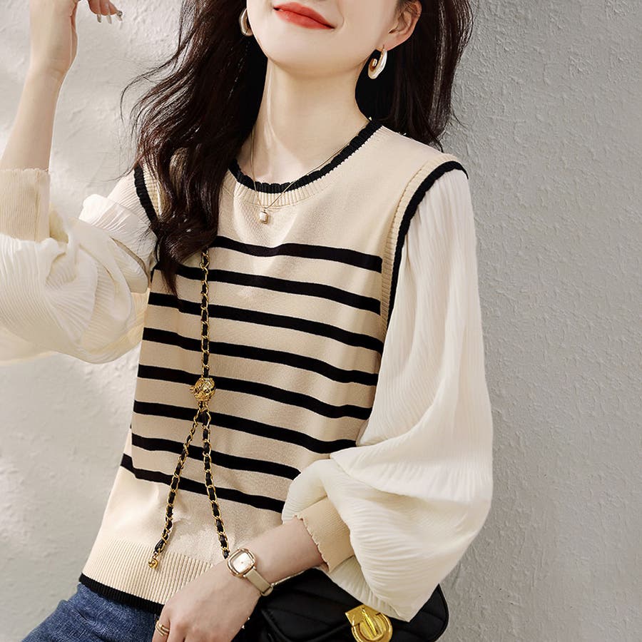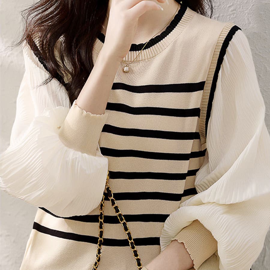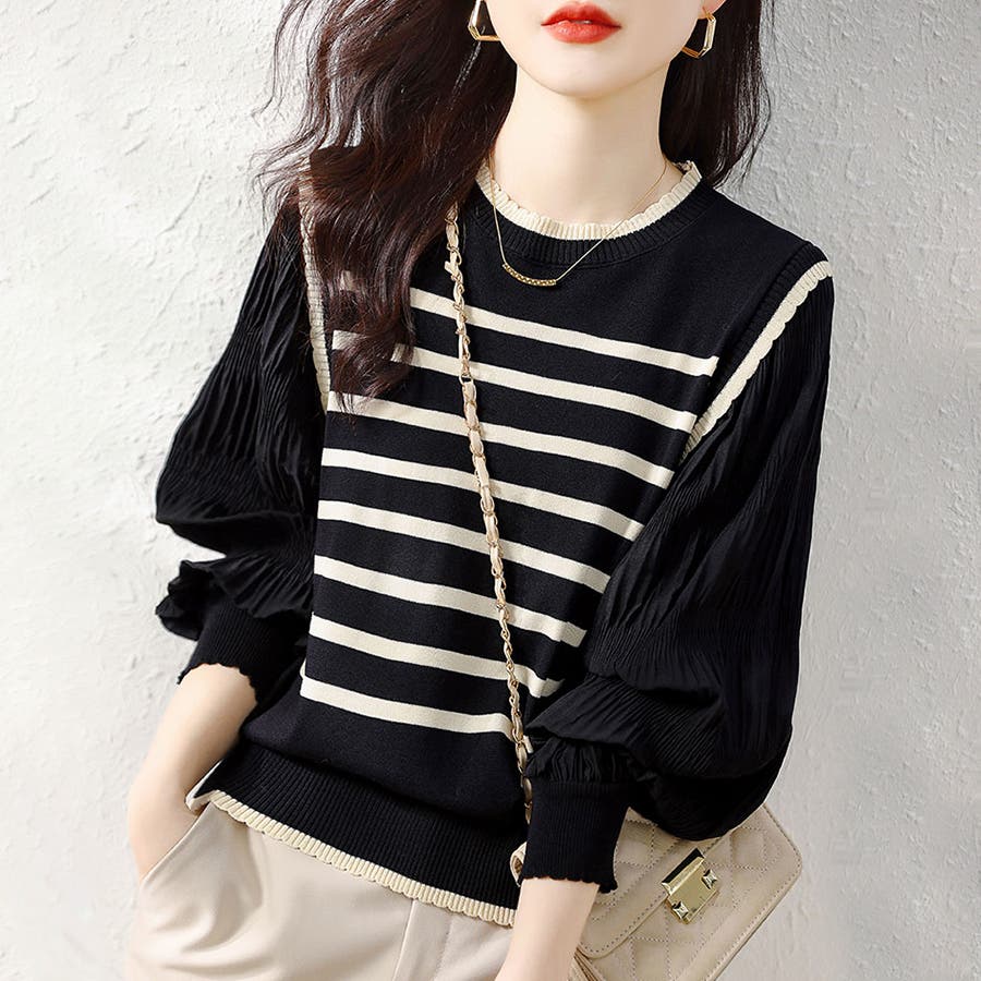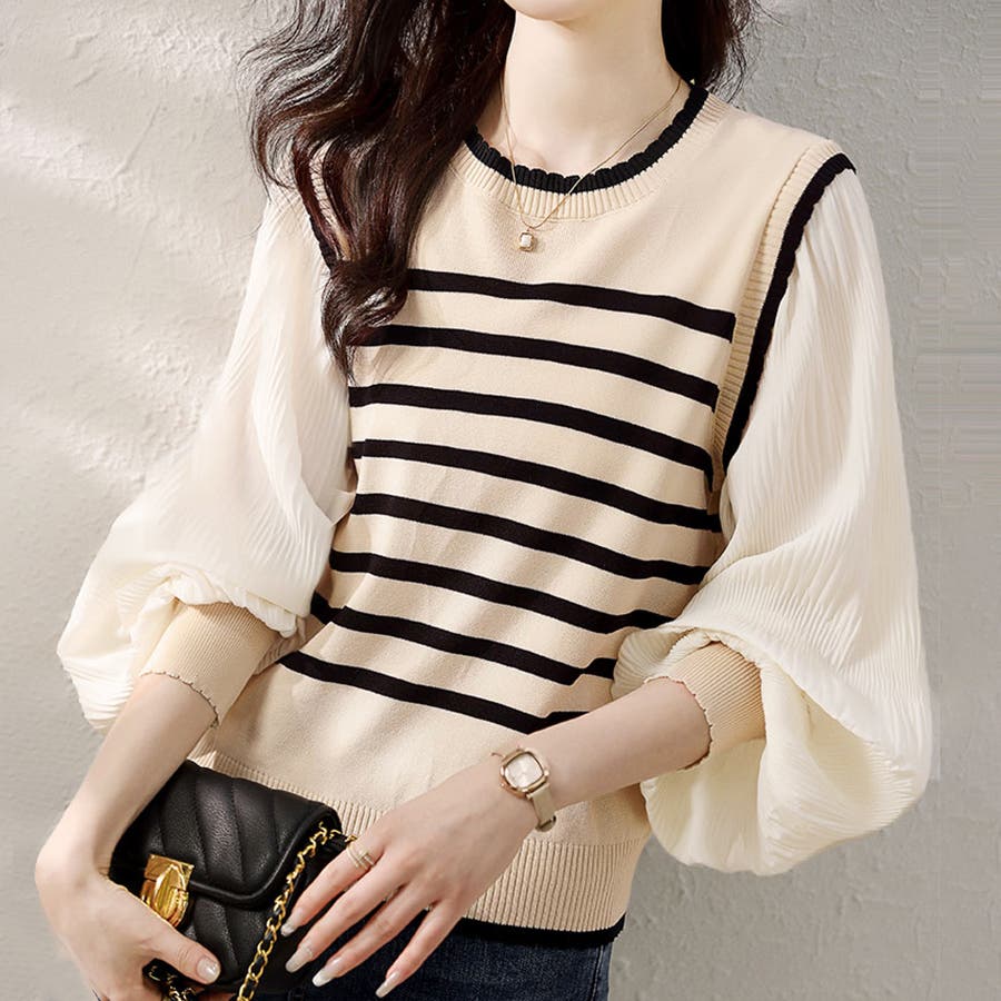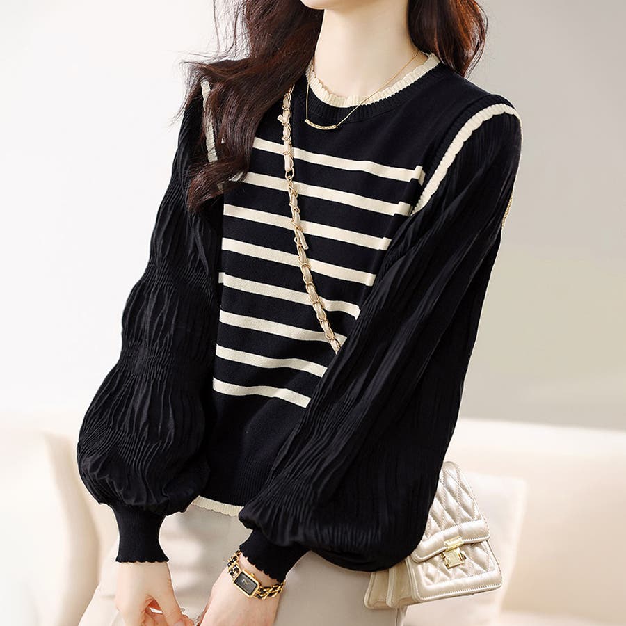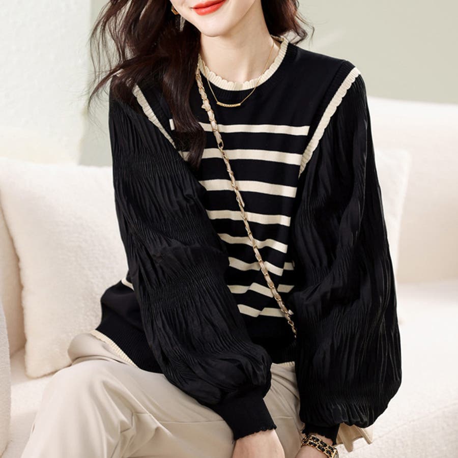 ボーダー柄とプリーツ素材を組み合わせた、異素材ドッキング風ブラウス。