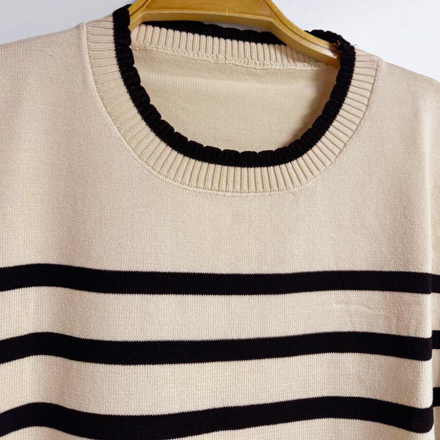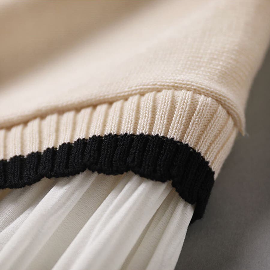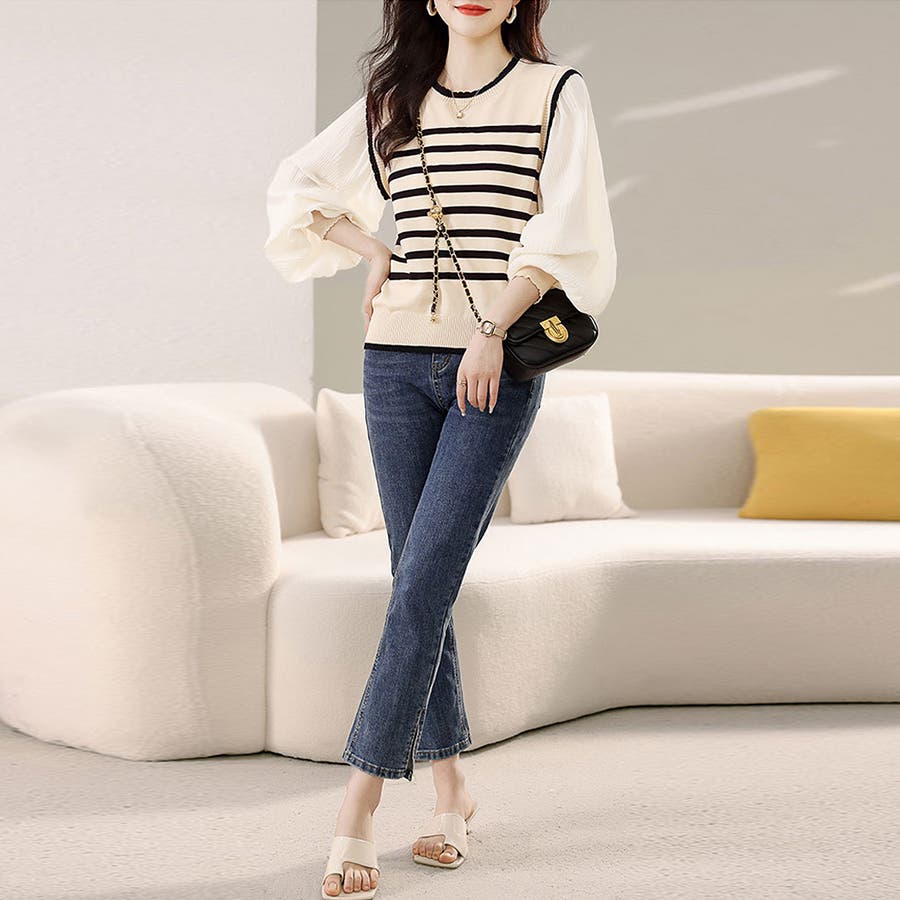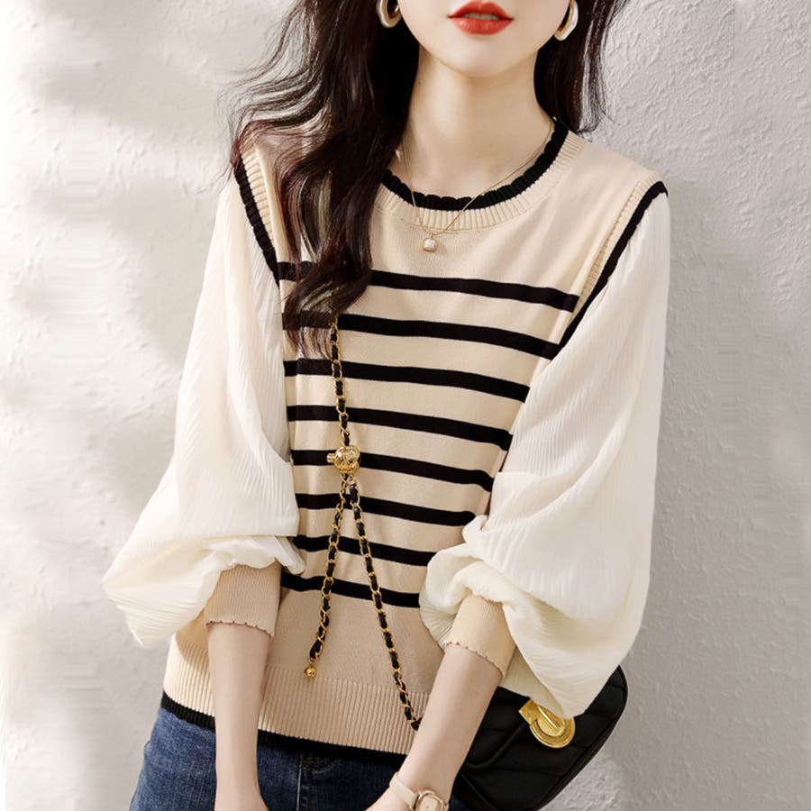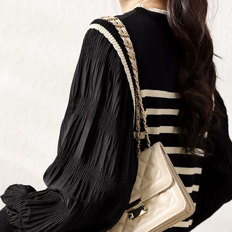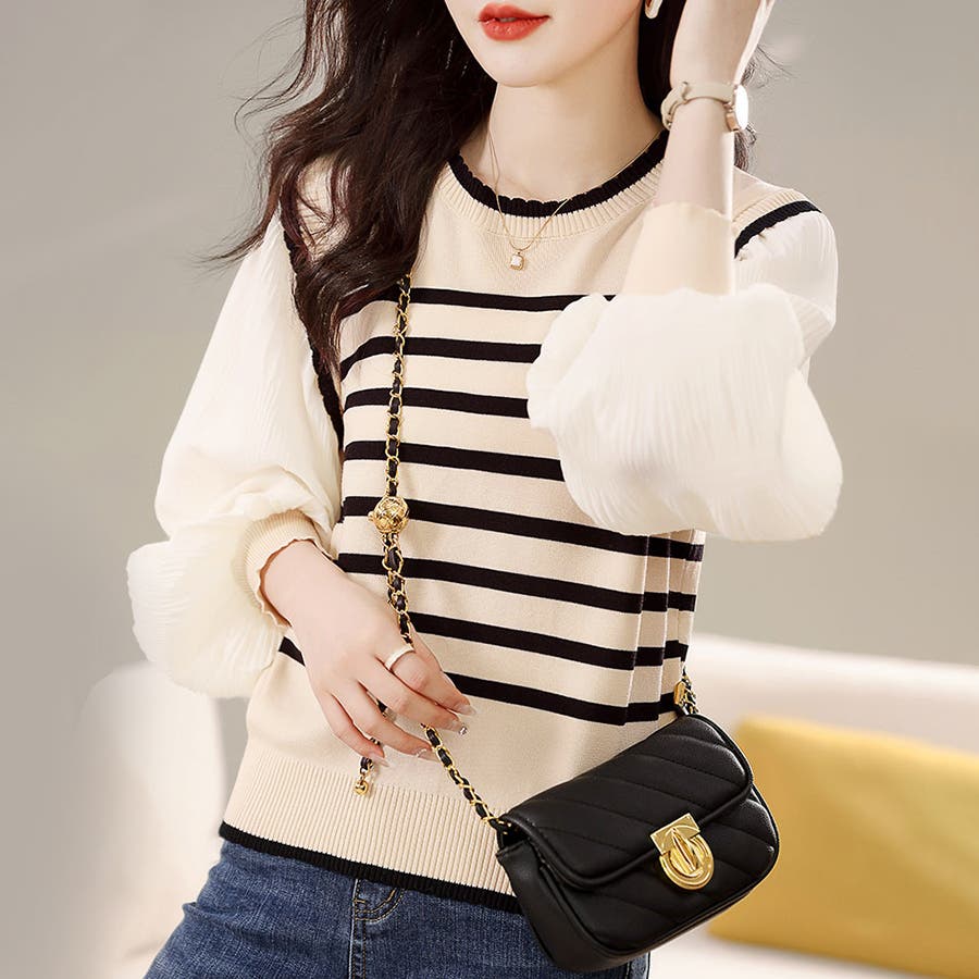 ボーダー柄とプリーツ素材を組み合わせた、異素材ドッキング風ブラウス。