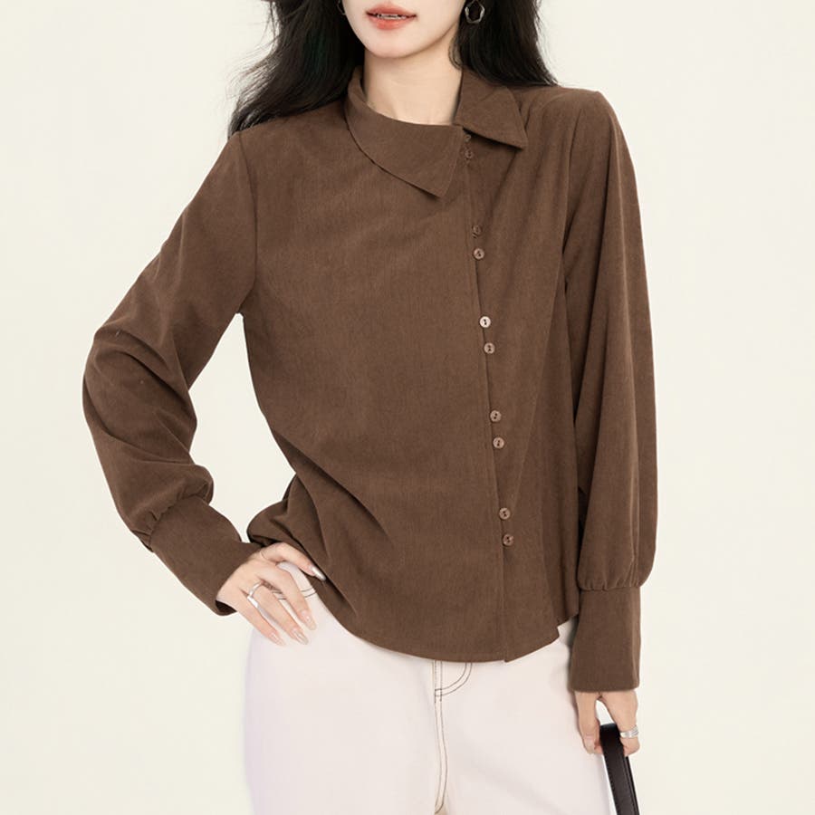 アシンメトリーに配置されたボタンが印象的な、モード感漂う長袖ブラウス。
