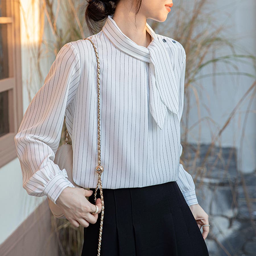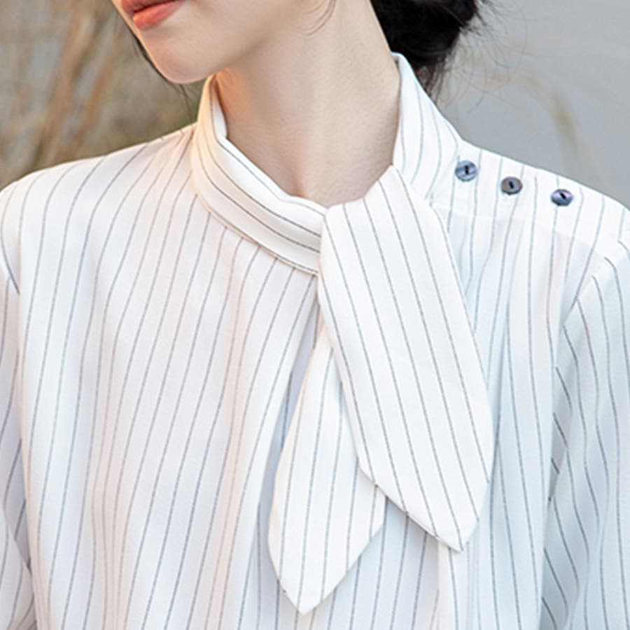 首元にはネクタイ風のデザインを施し、顔まわりに華やかさと抜け感をプラス。