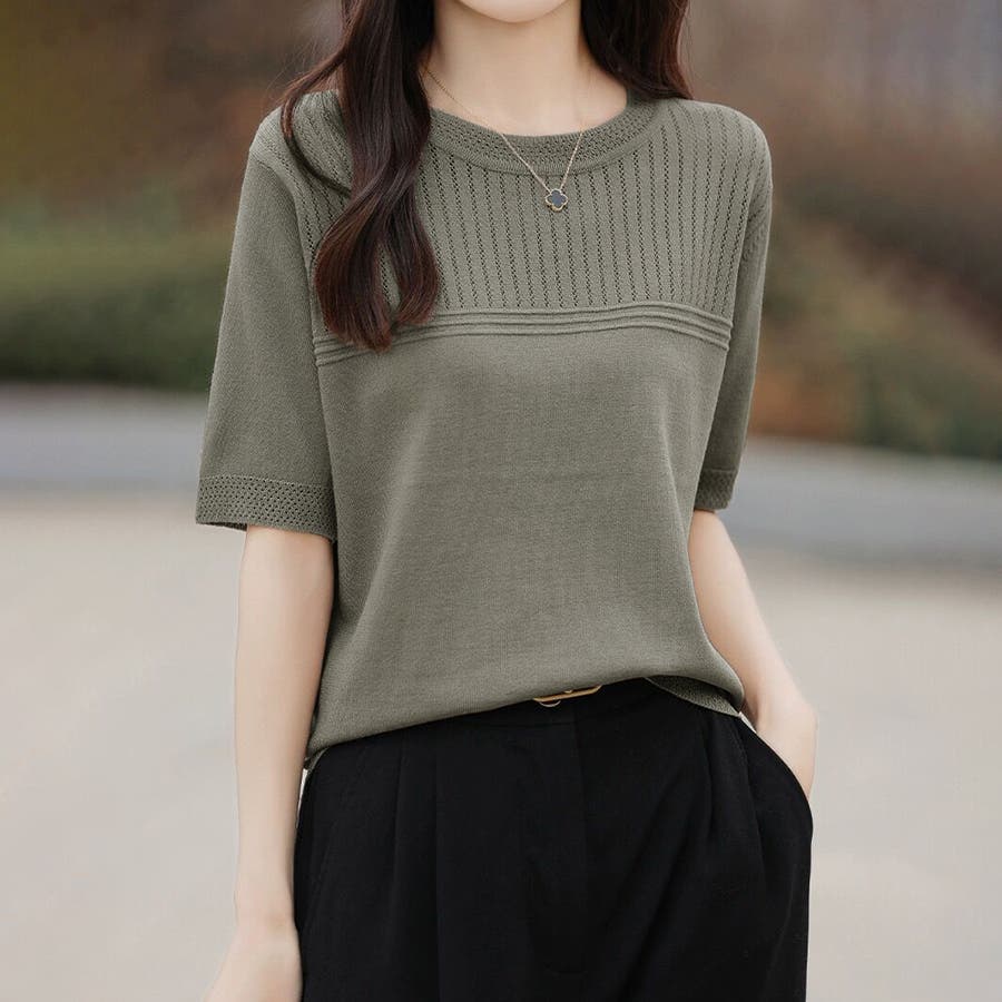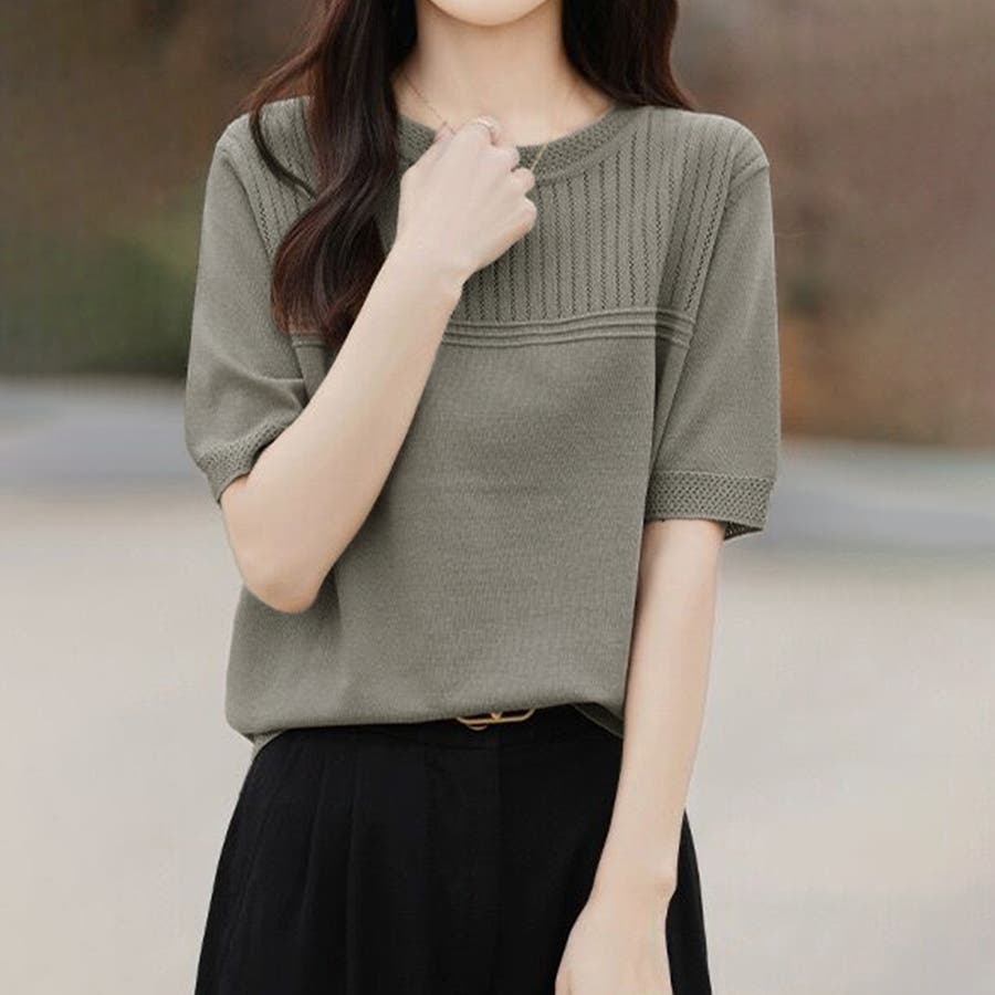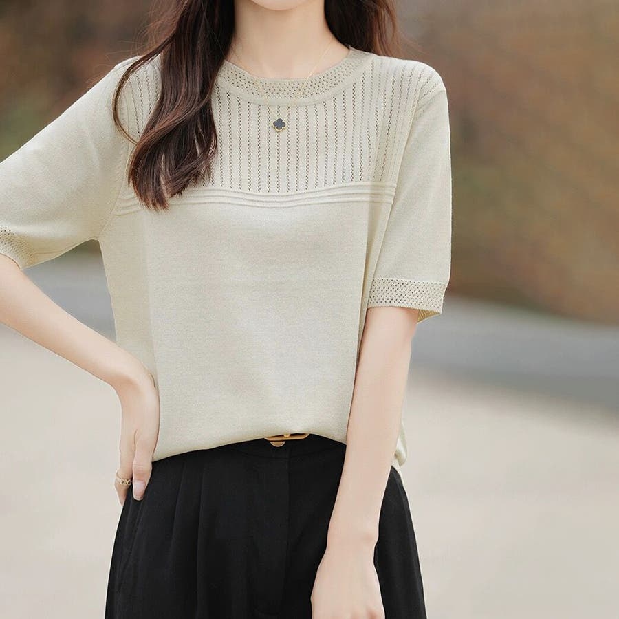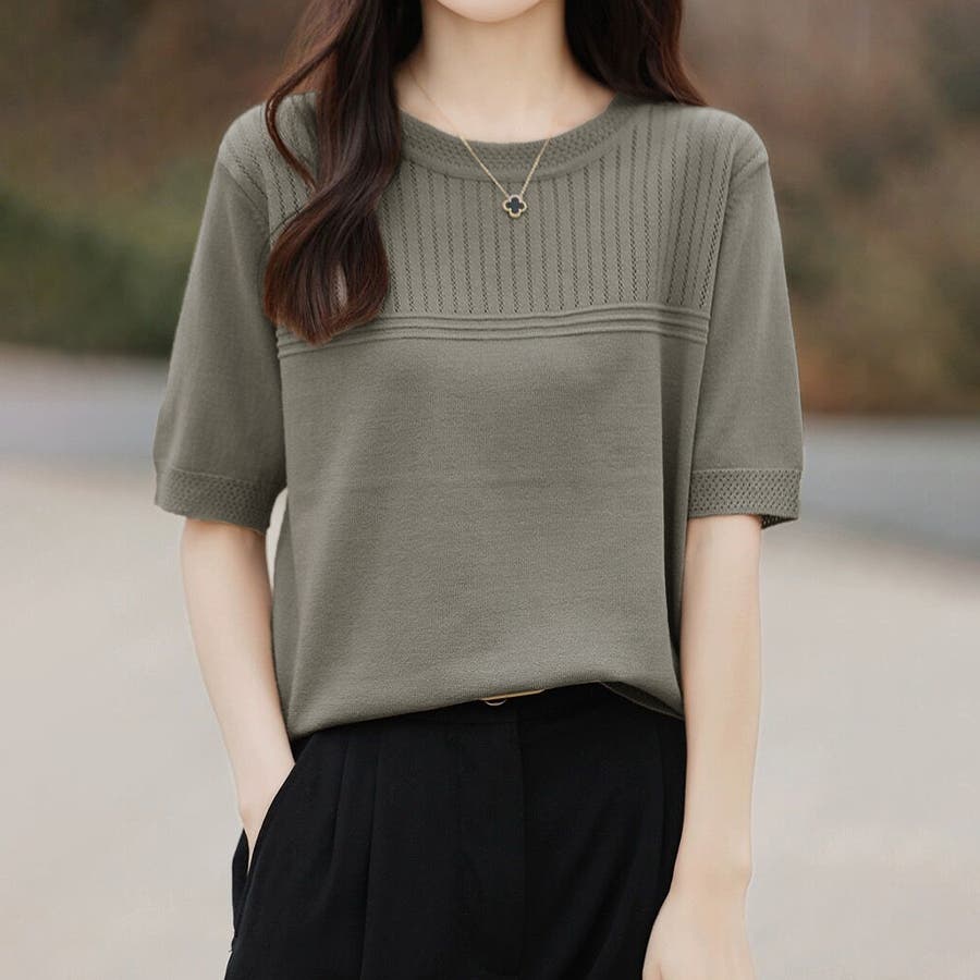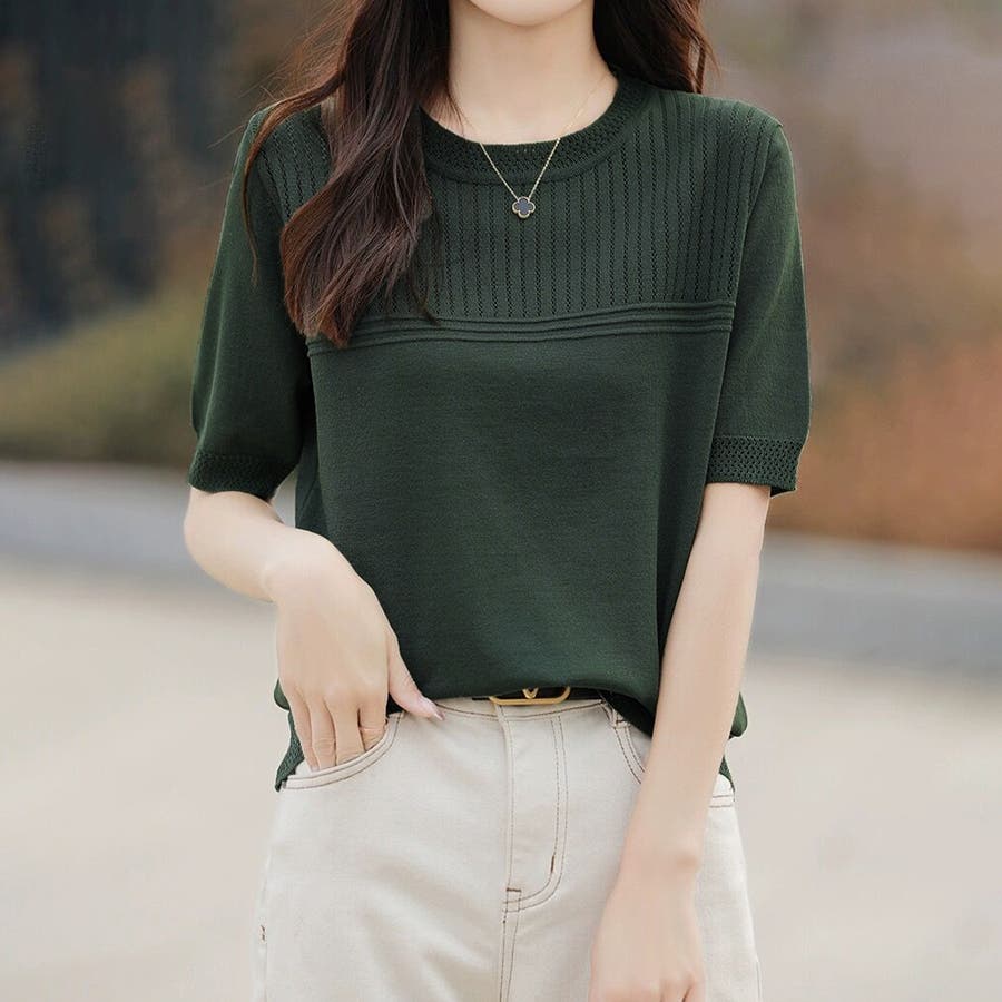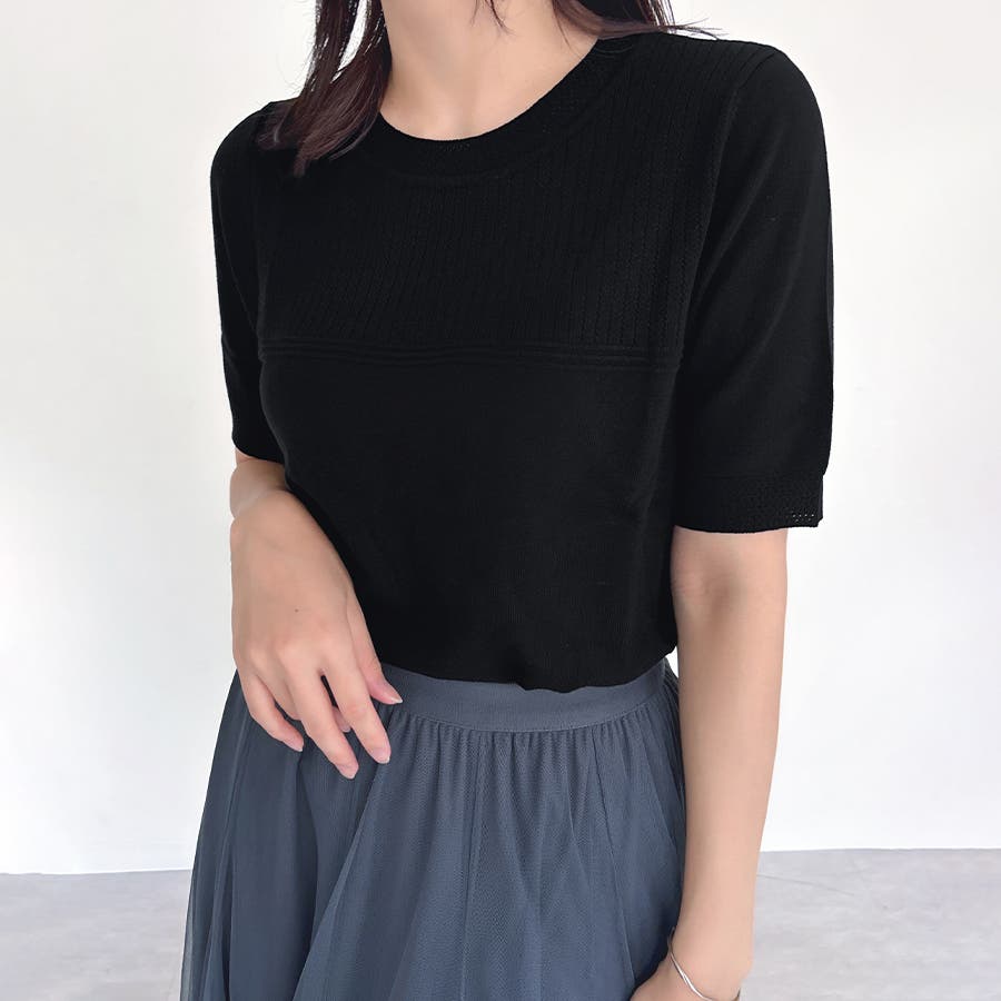 リブ切り替え×半袖ニットトップス