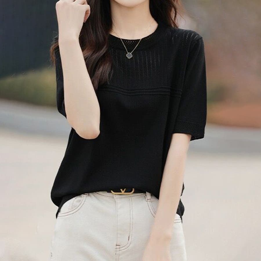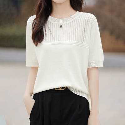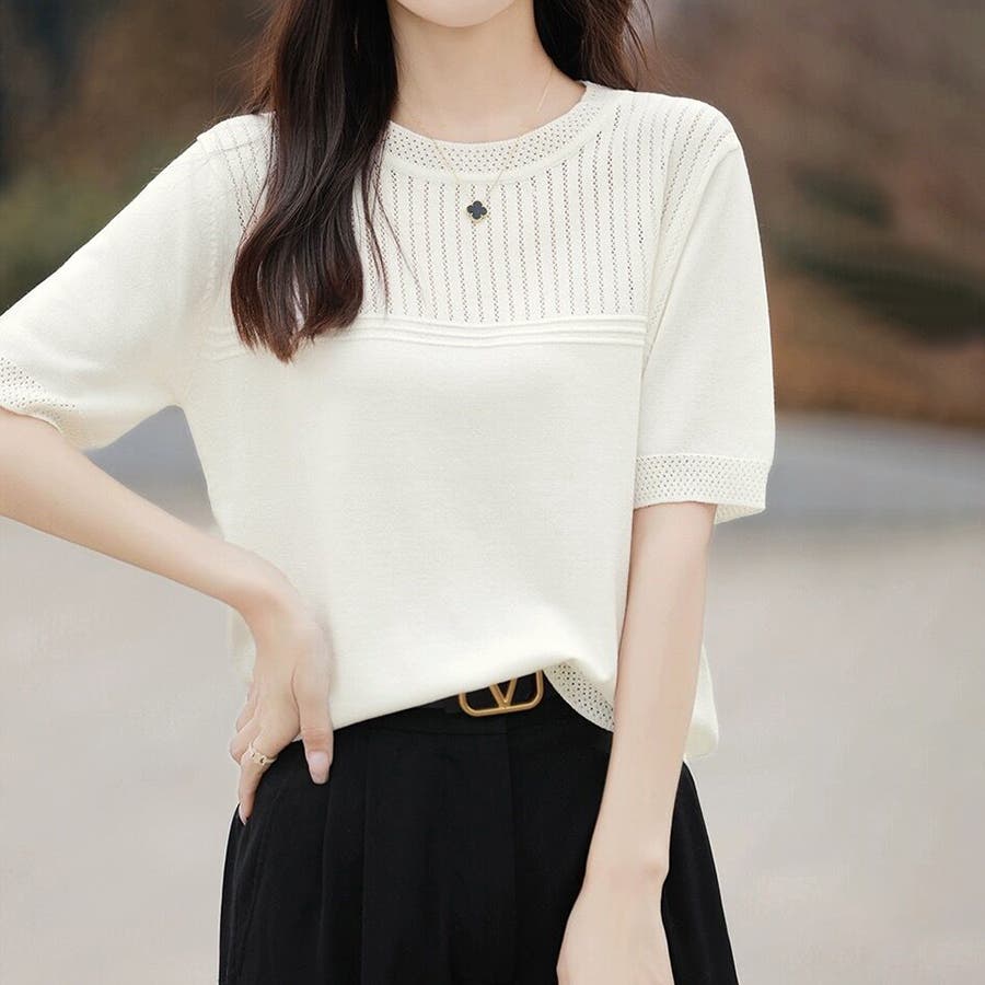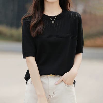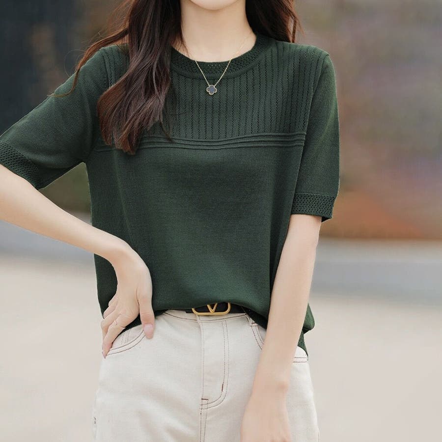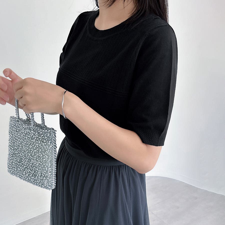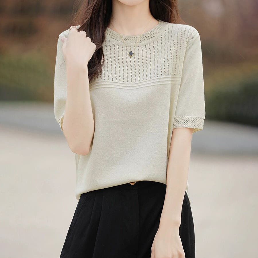 リブ切り替え×半袖ニットトップス