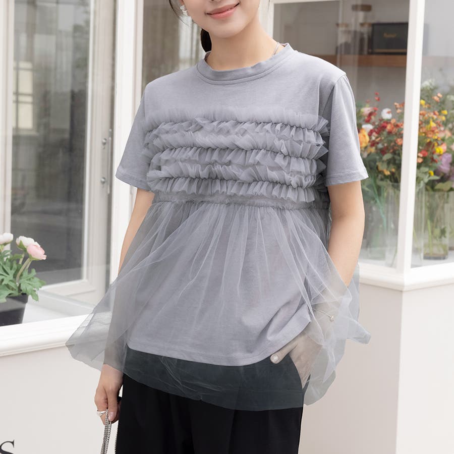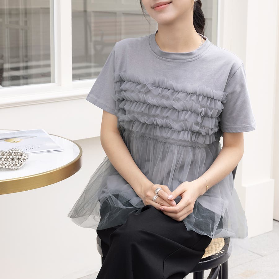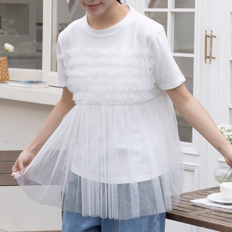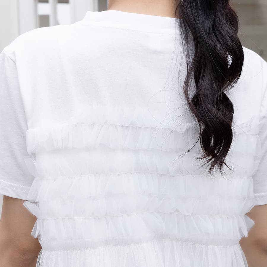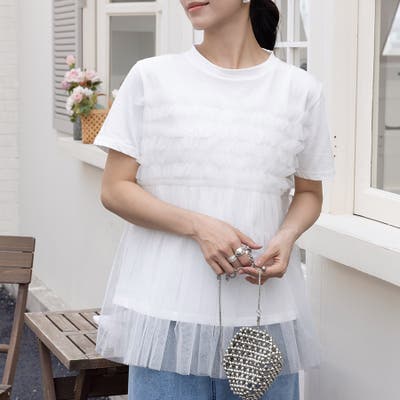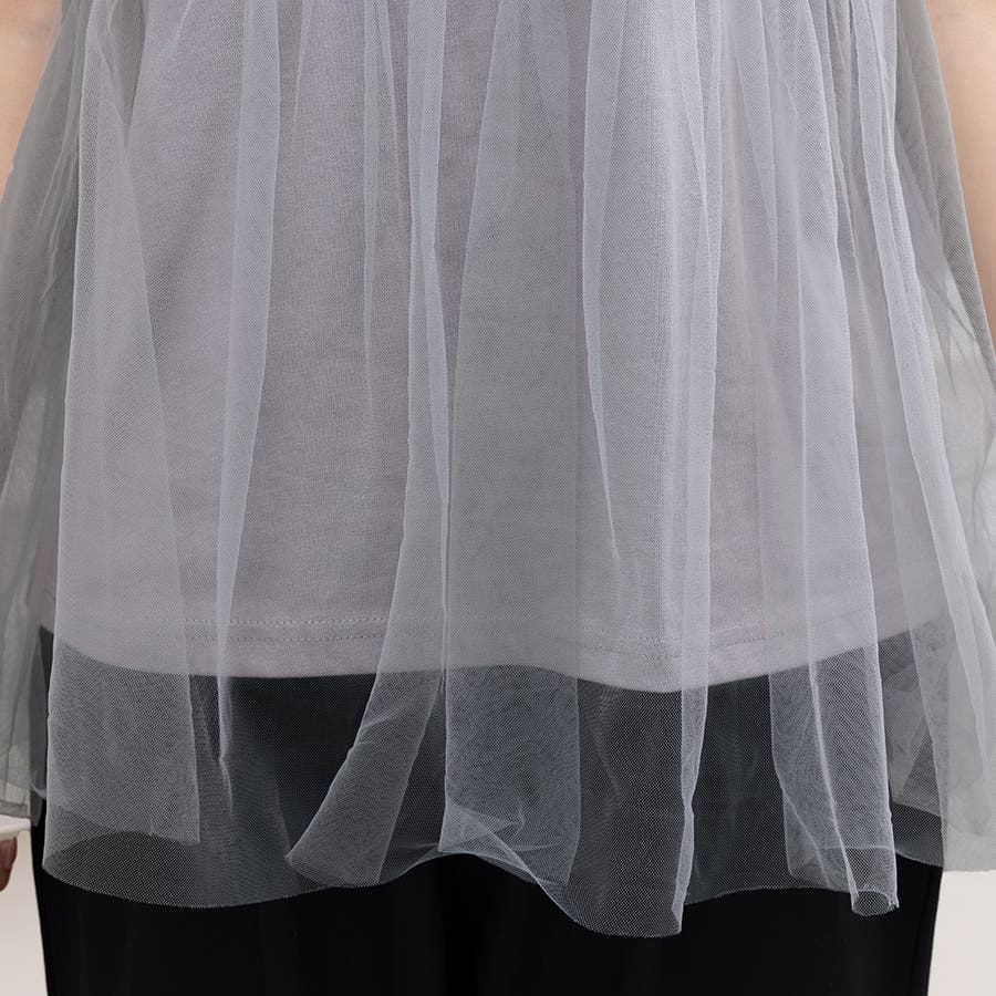 チュールドッキングがチャームポイントのガーリーなドッキング半袖Tシャツ新登場♪