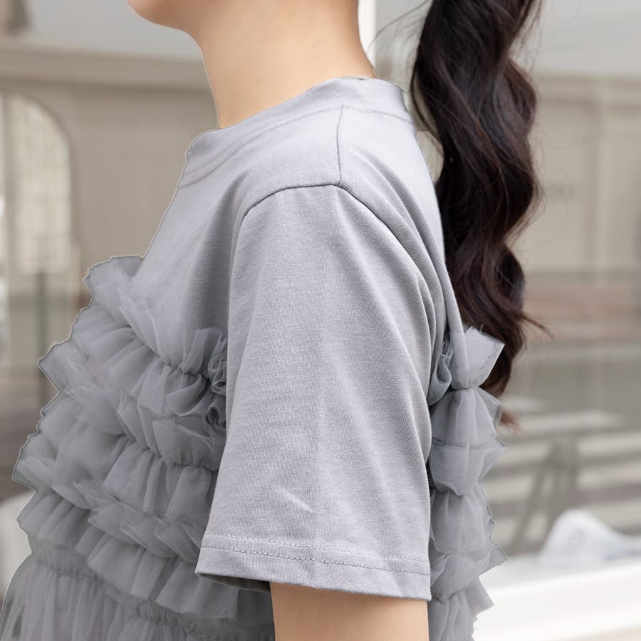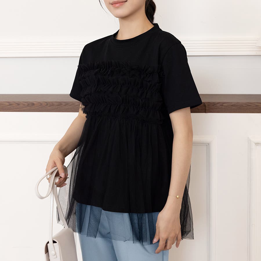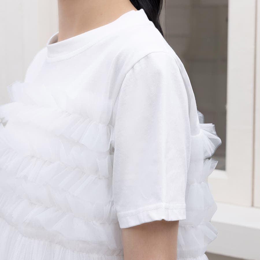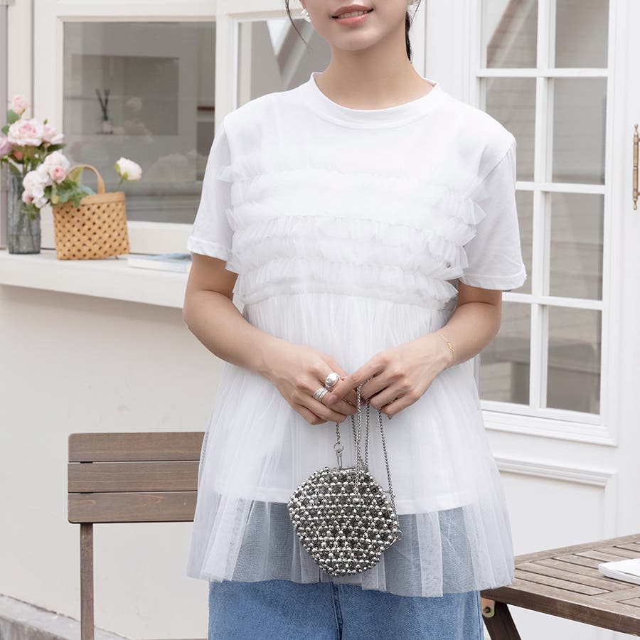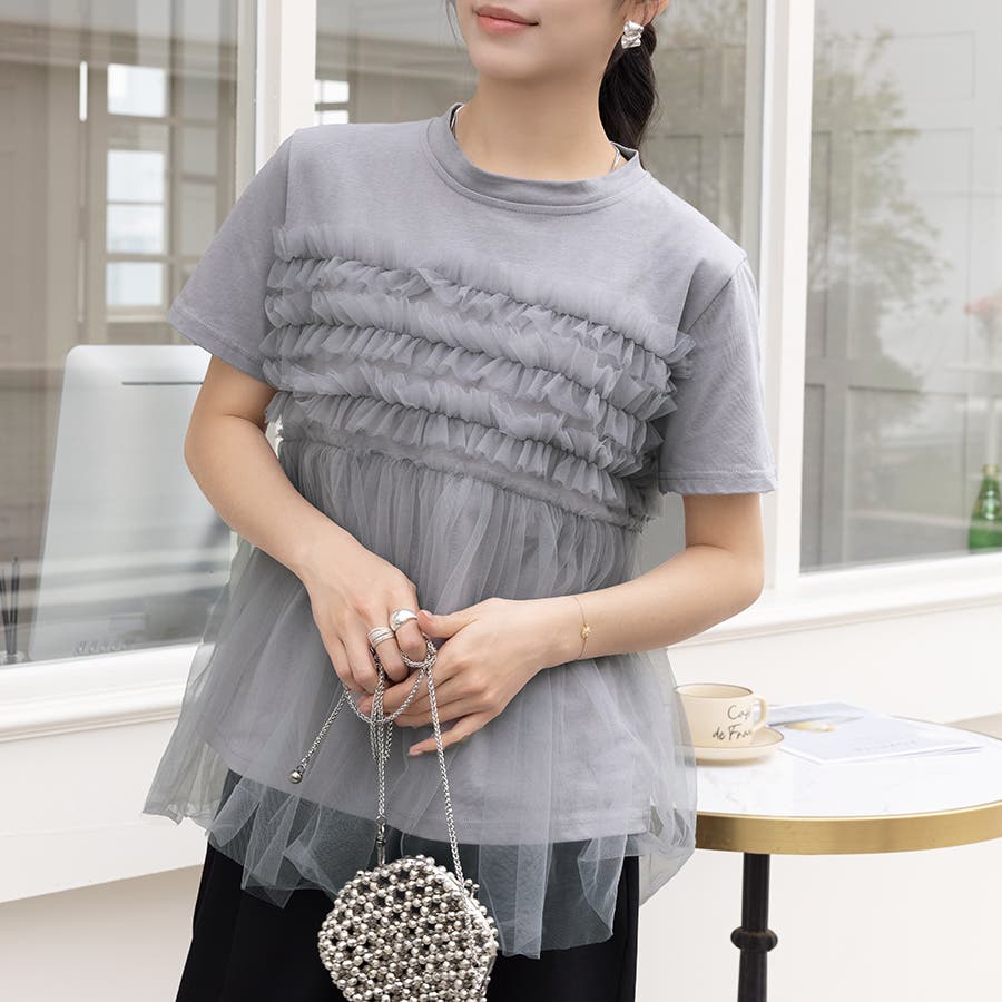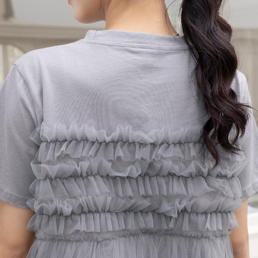 チュールドッキングがチャームポイントのガーリーなドッキング半袖Tシャツ新登場♪