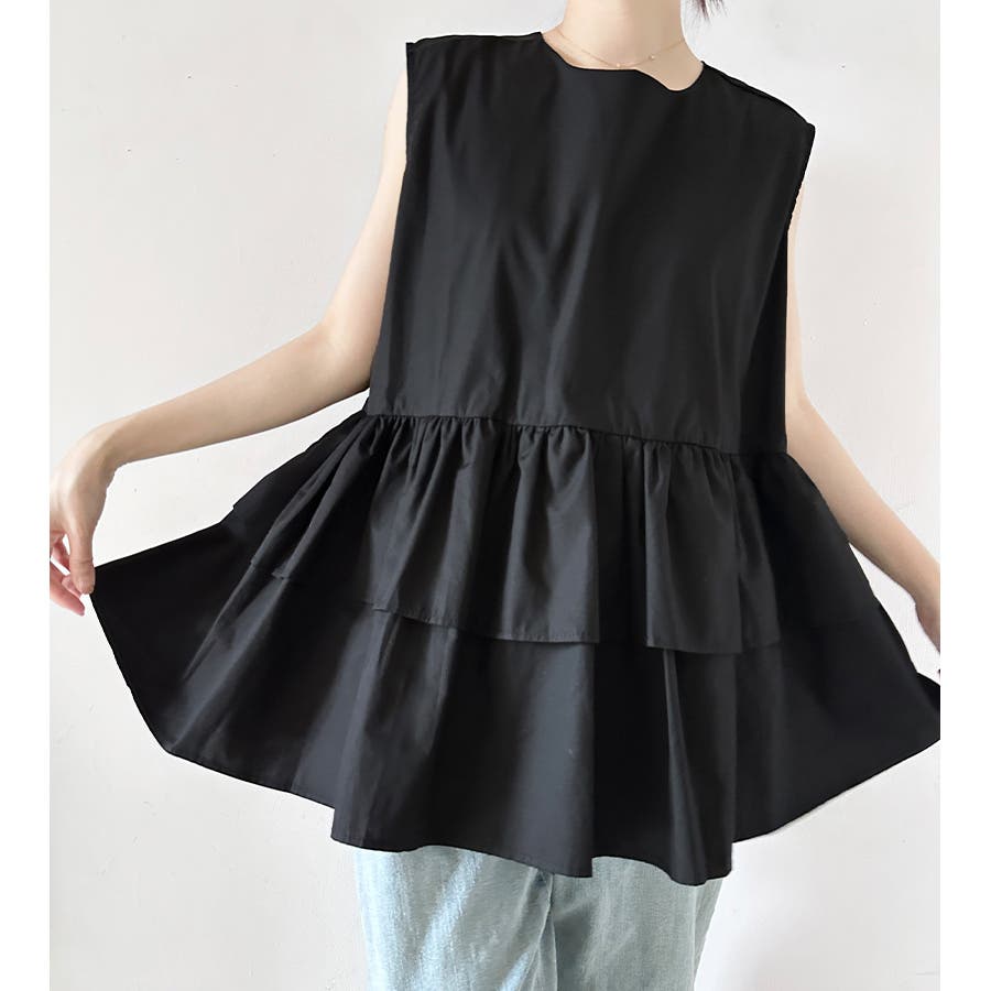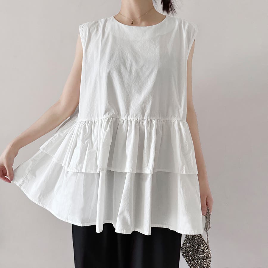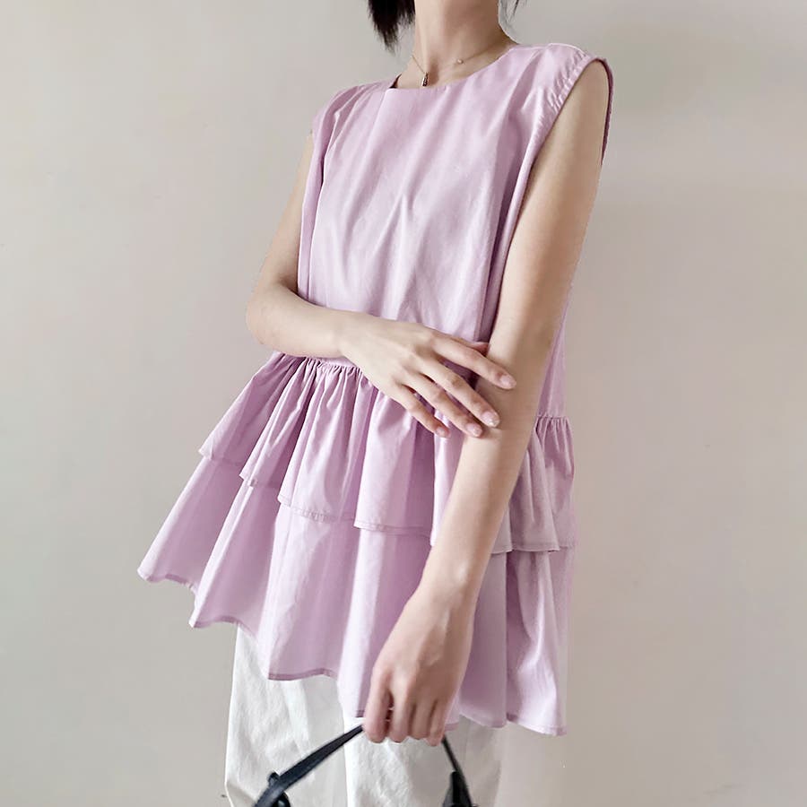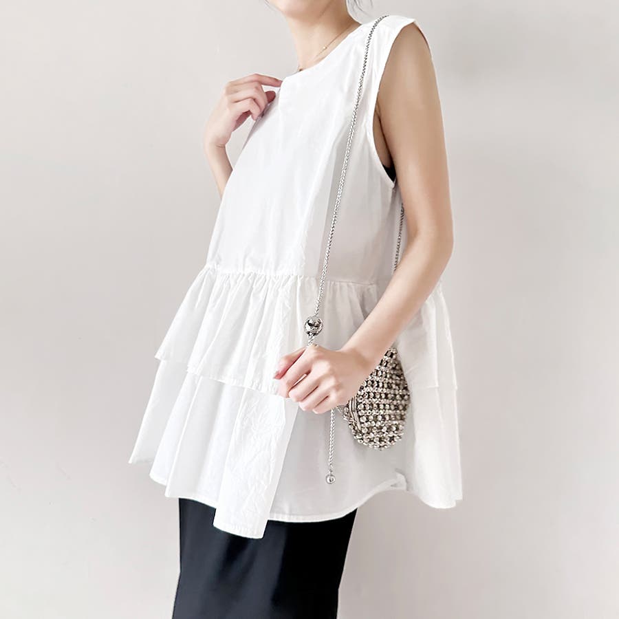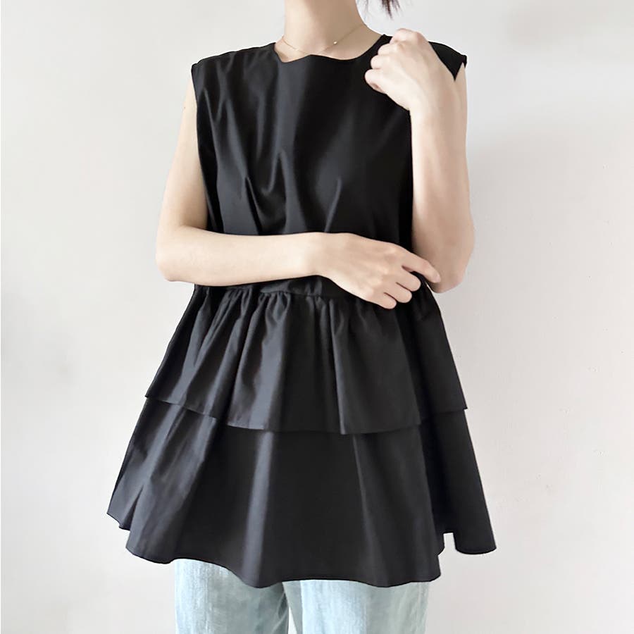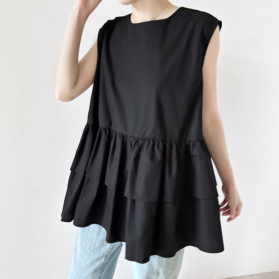 裾のフレアティアードデザインがチャームポイントの春夏おすすめのノースリーブブラウスが新登場♪