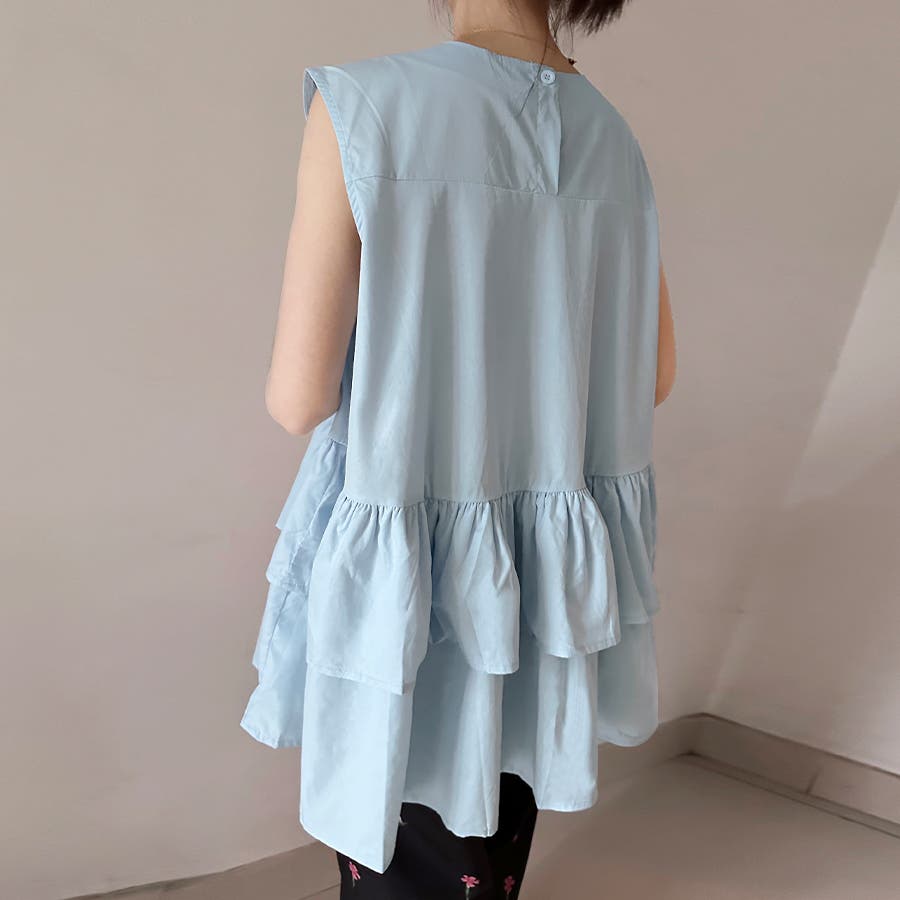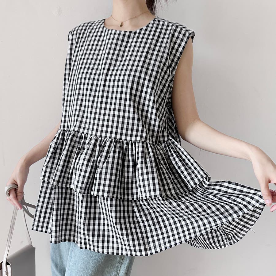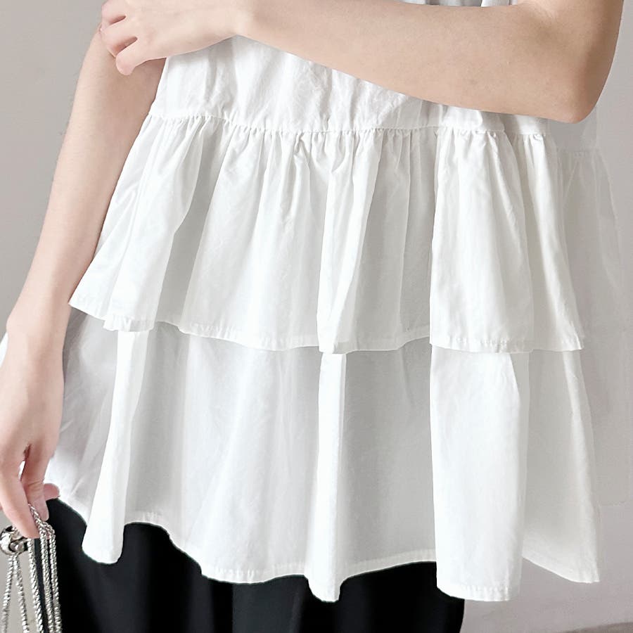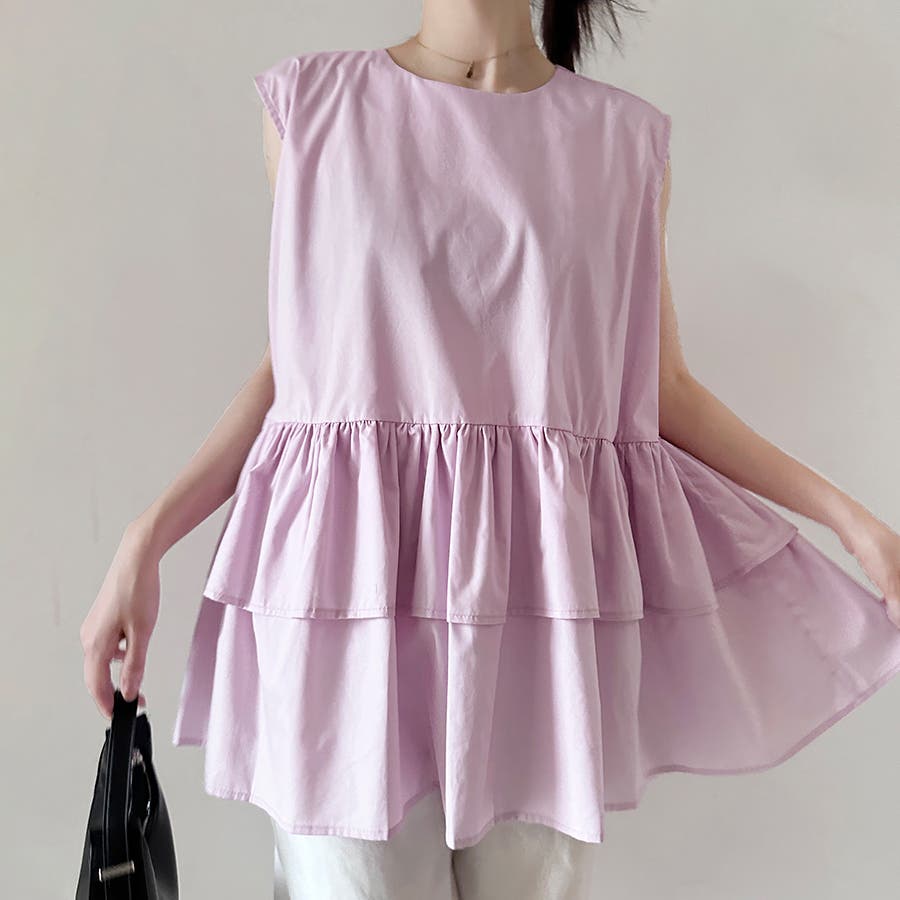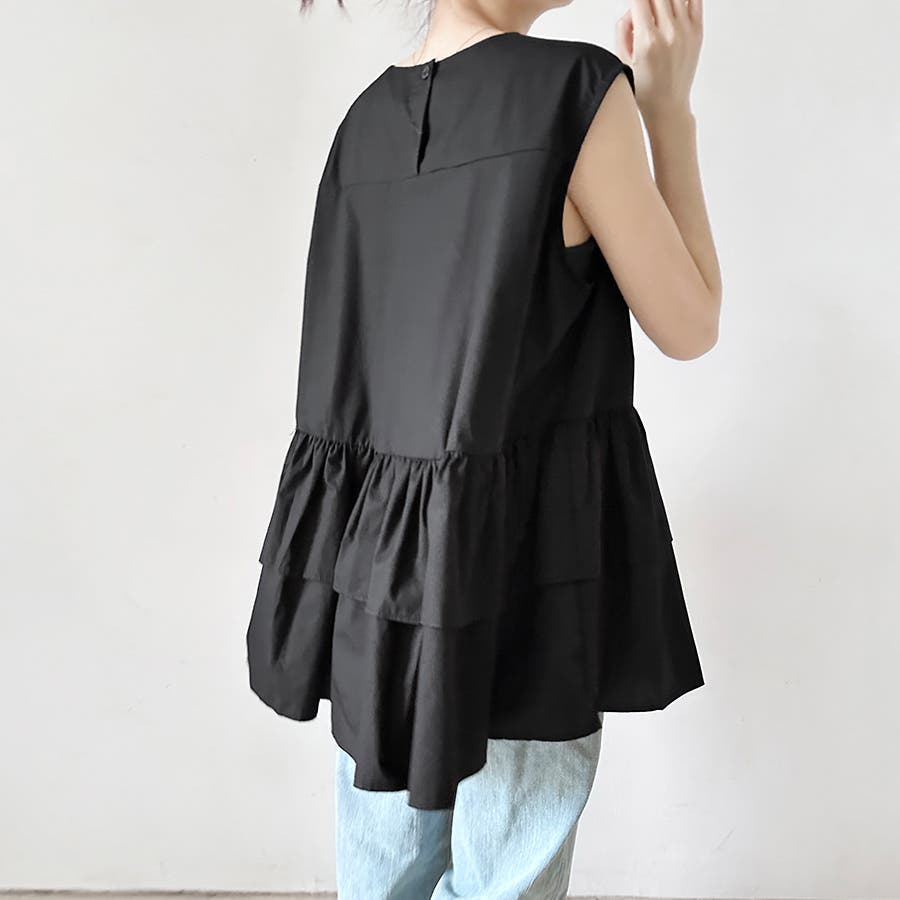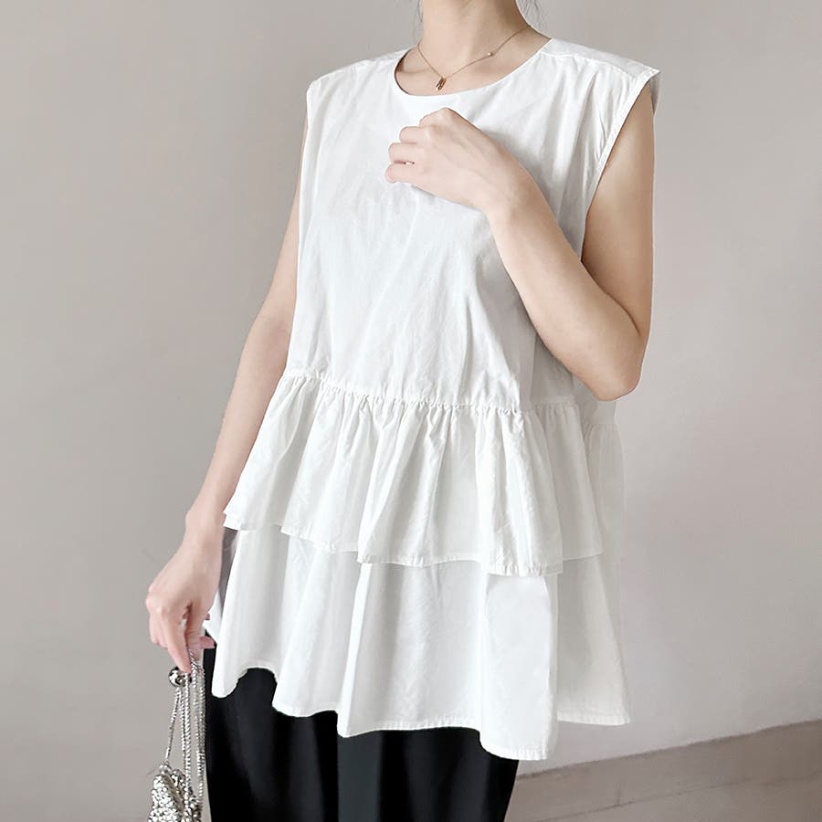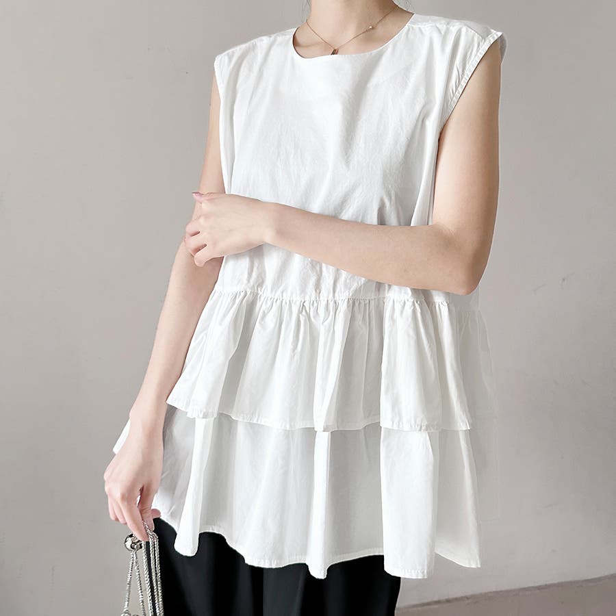 裾のフレアティアードデザインがチャームポイントの春夏おすすめのノースリーブブラウスが新登場♪