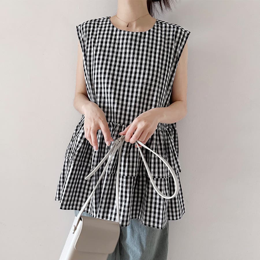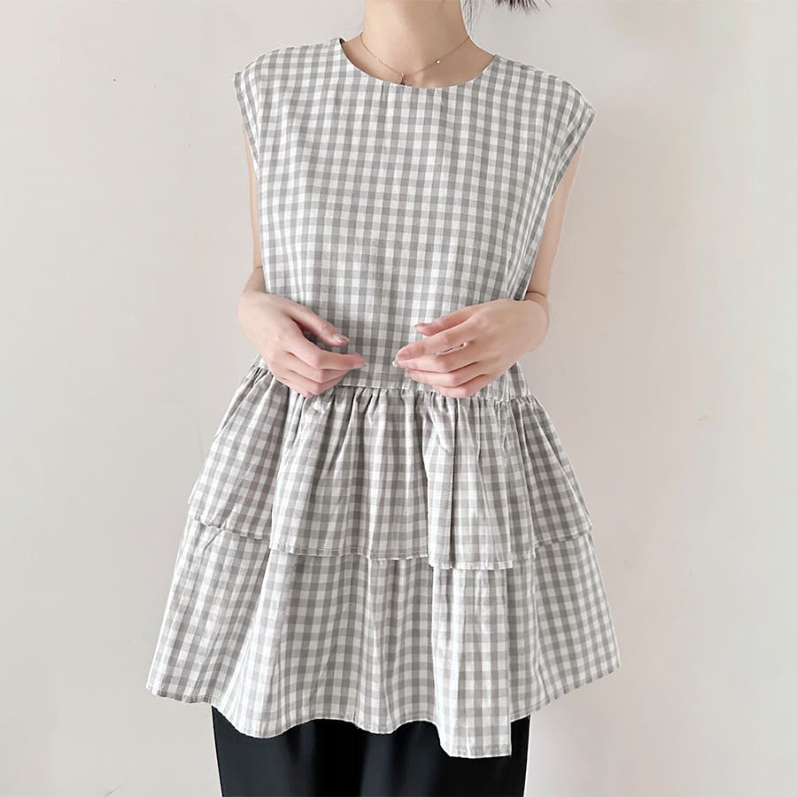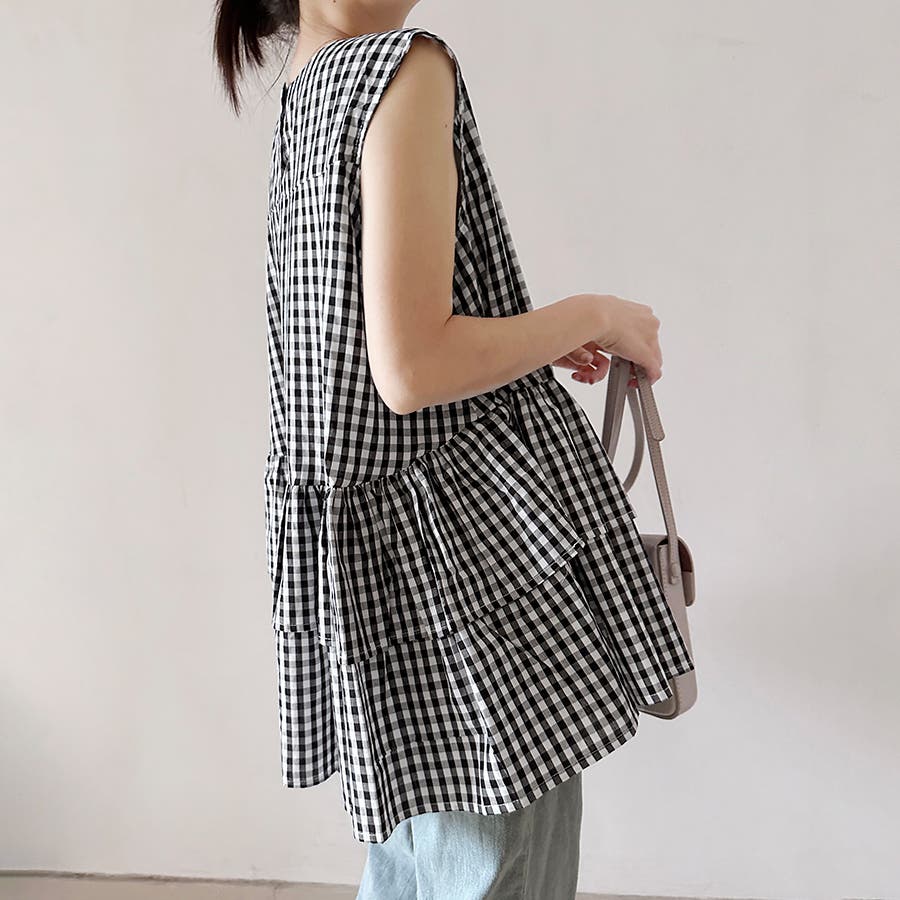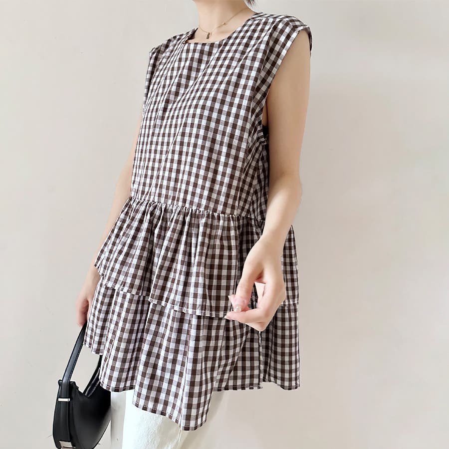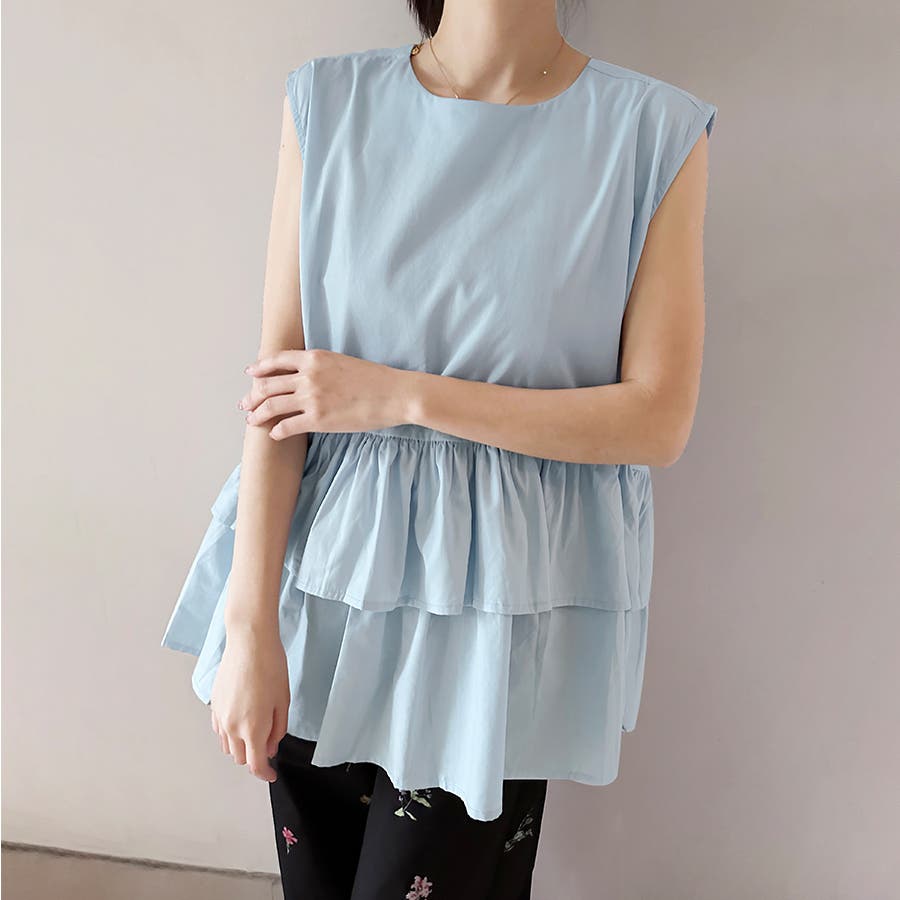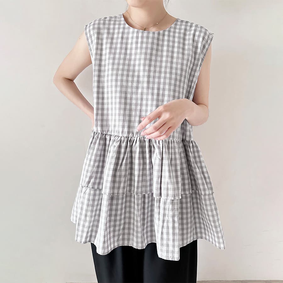 裾のフレアティアードデザインがチャームポイントの春夏おすすめのノースリーブブラウスが新登場♪