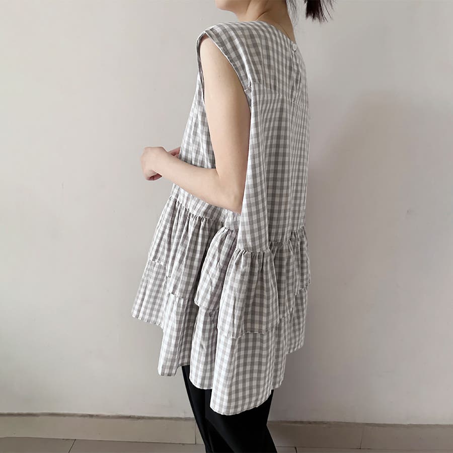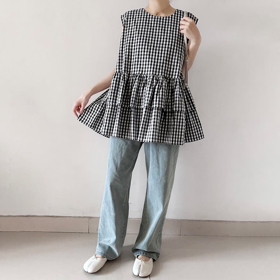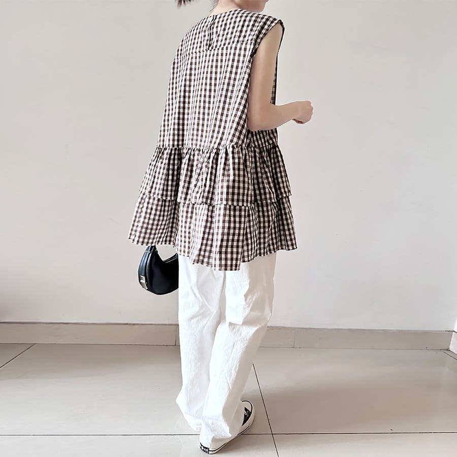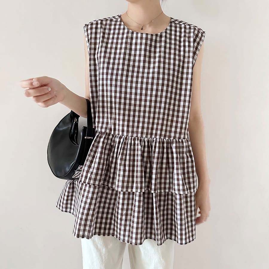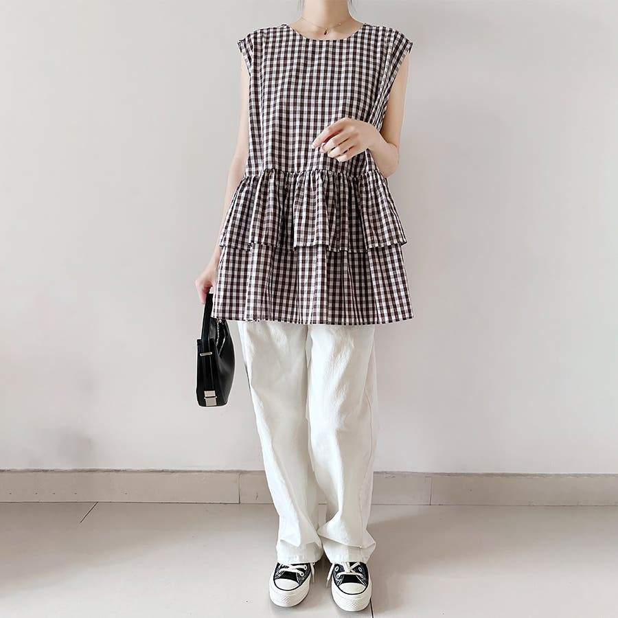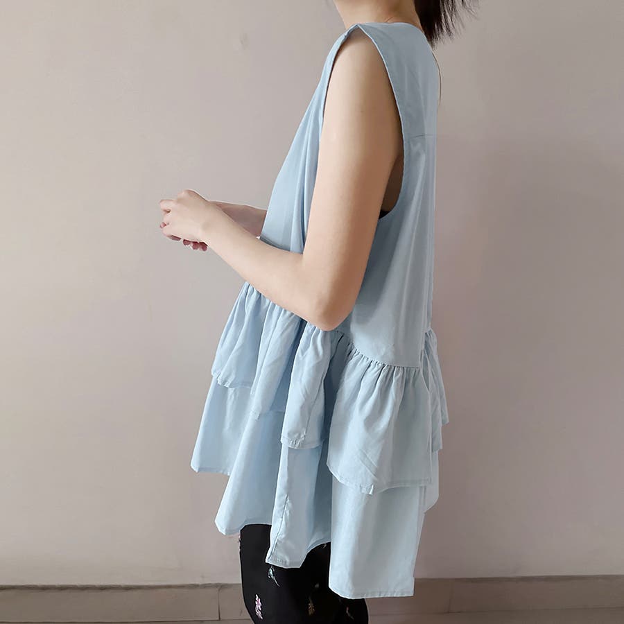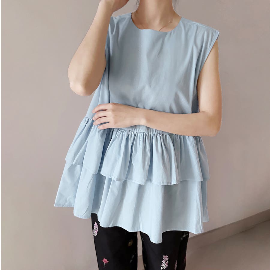 裾のフレアティアードデザインがチャームポイントの春夏おすすめのノースリーブブラウスが新登場♪