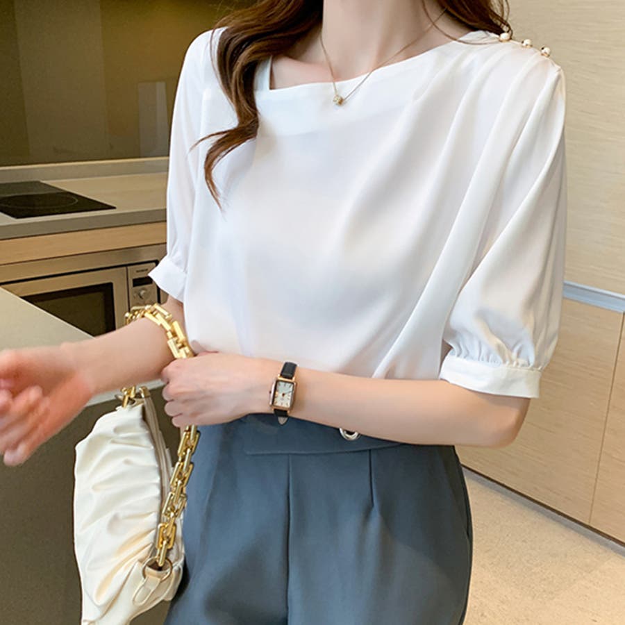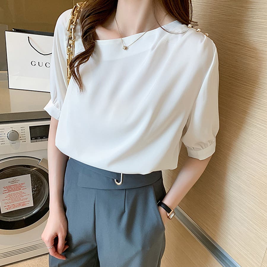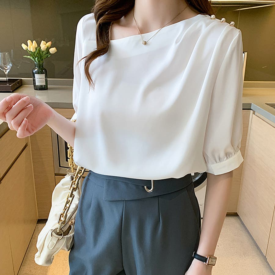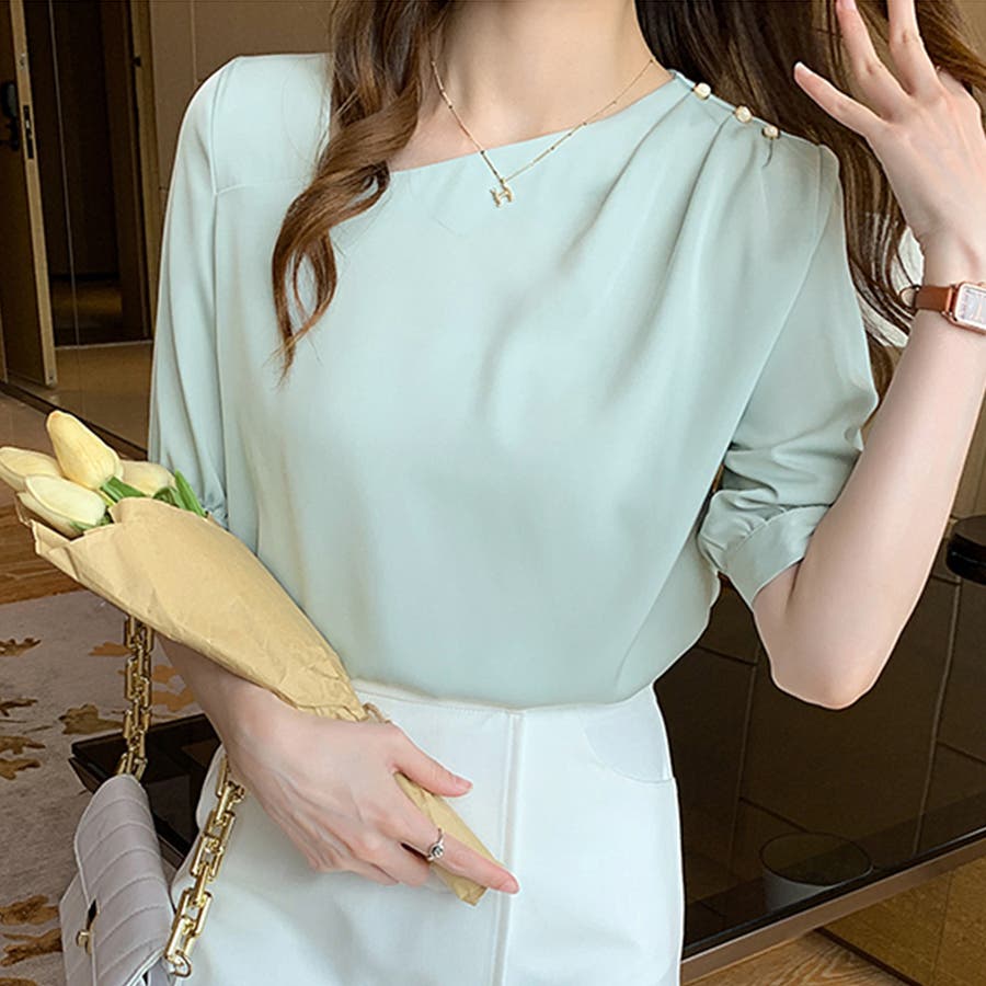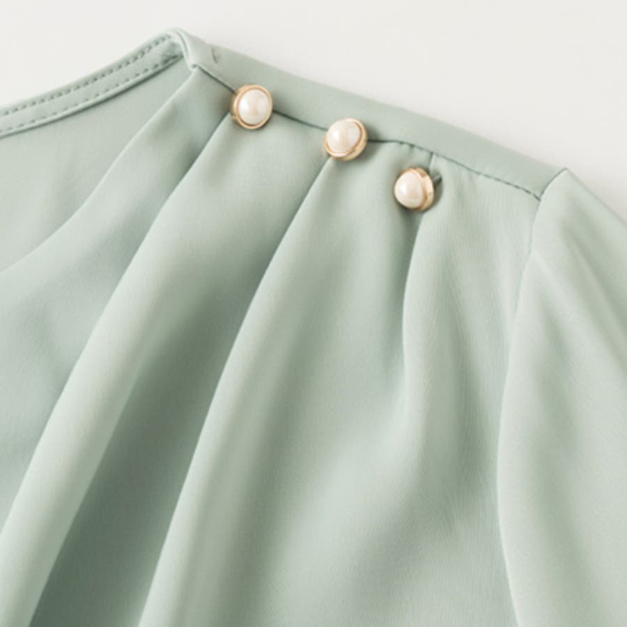 シンプルなデザインながらも、さりげないパールボタンがアクセントになり、華やかな印象を与えます。