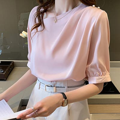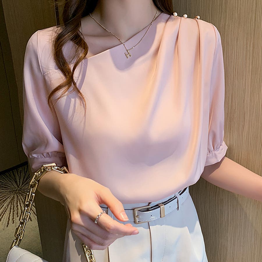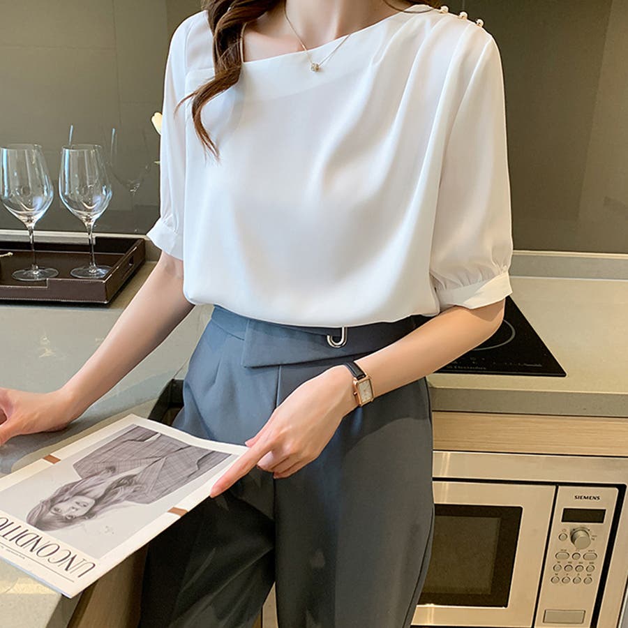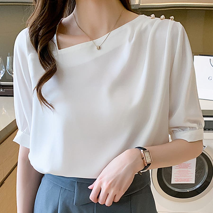 デコルテラインを美しく見せるアシメトリーなVネックデザインが、上品な女性らしさを演出するシフォンブラウス。
