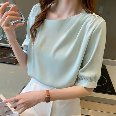 パールボタン付きスタンドカラーブラウス