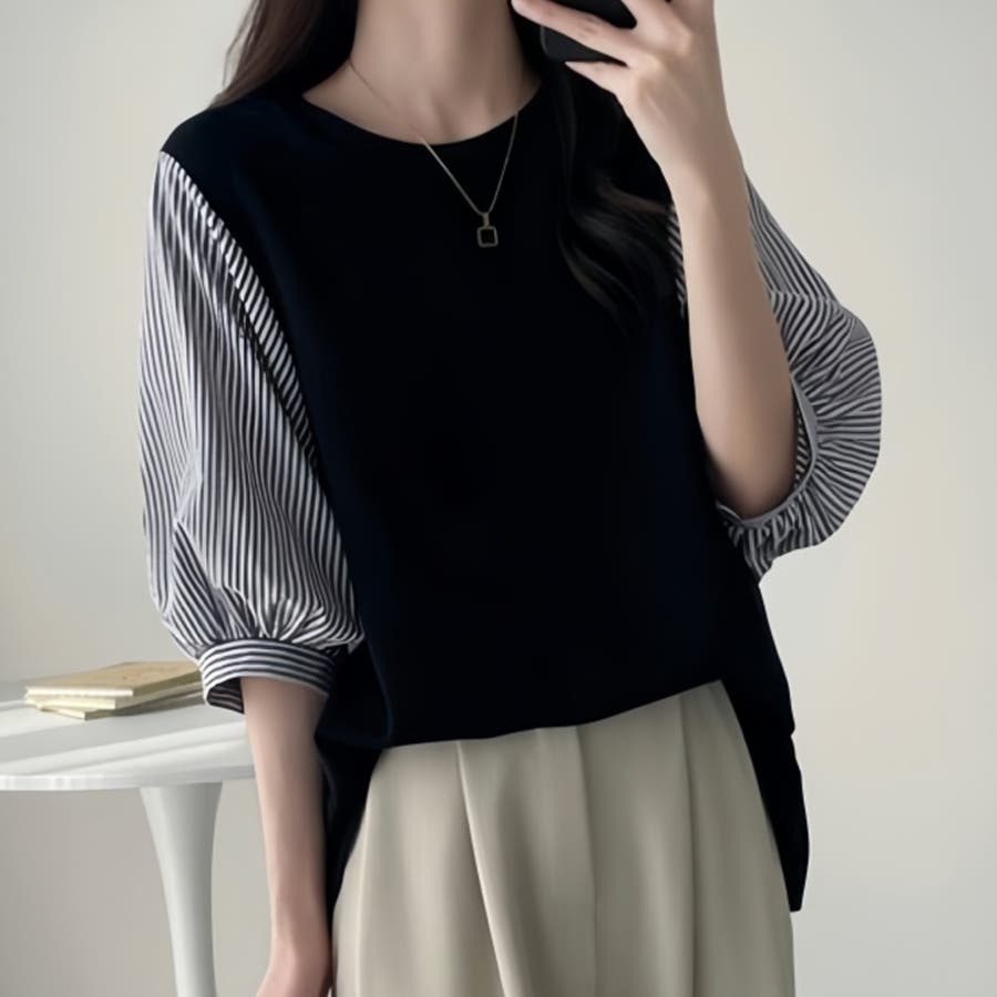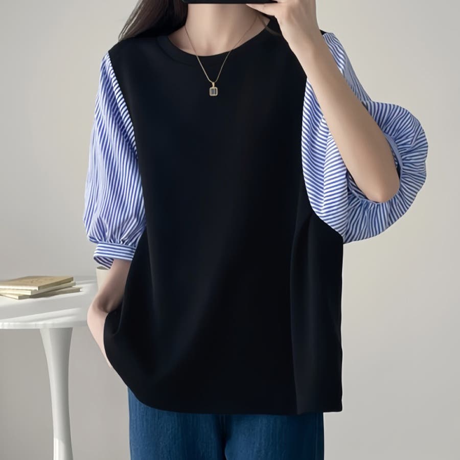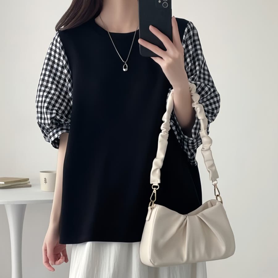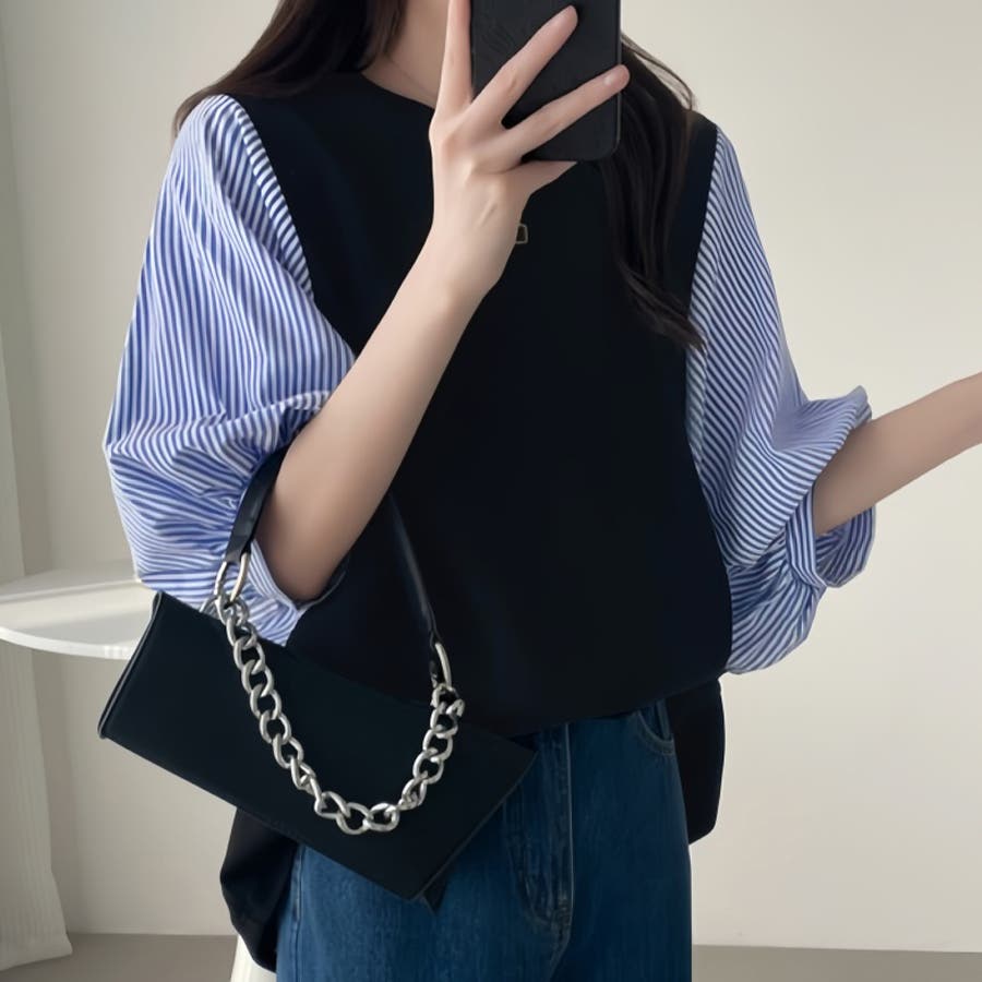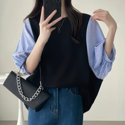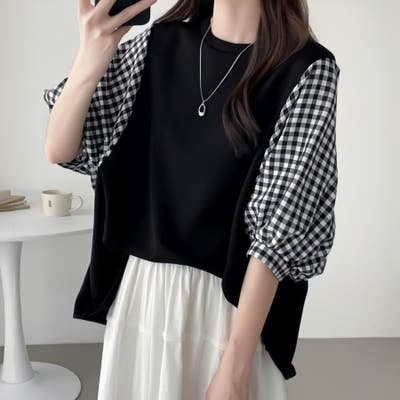 ボリュームスリーブでボリューム感がありながら、ラウンドネックでスッキリ綺麗めに仕上げました。