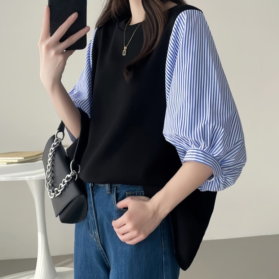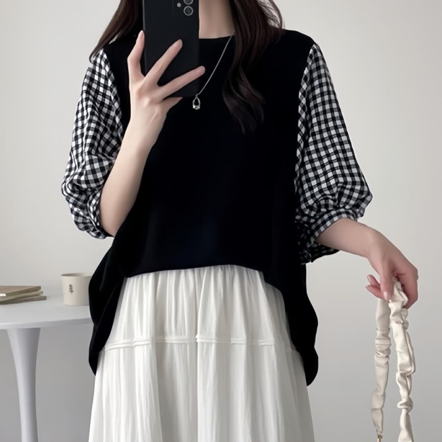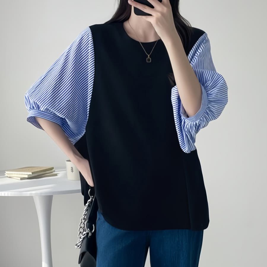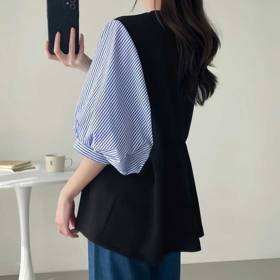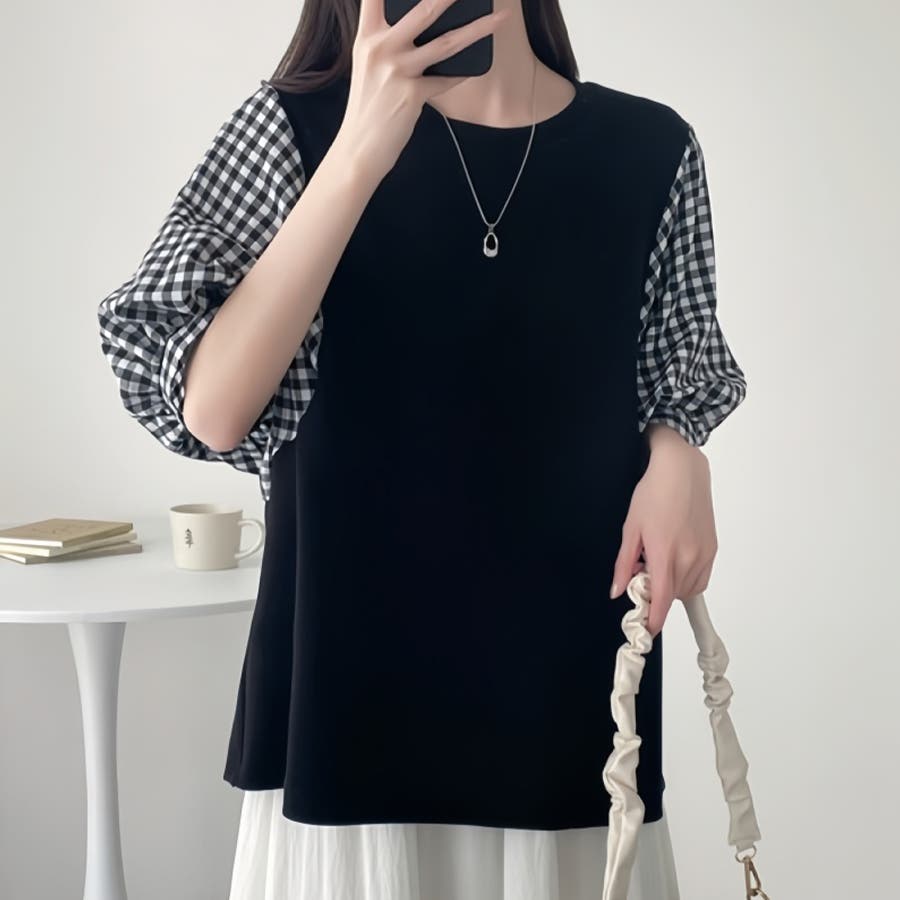 ボリュームスリーブでボリューム感がありながら、ラウンドネックでスッキリ綺麗めに仕上げました。