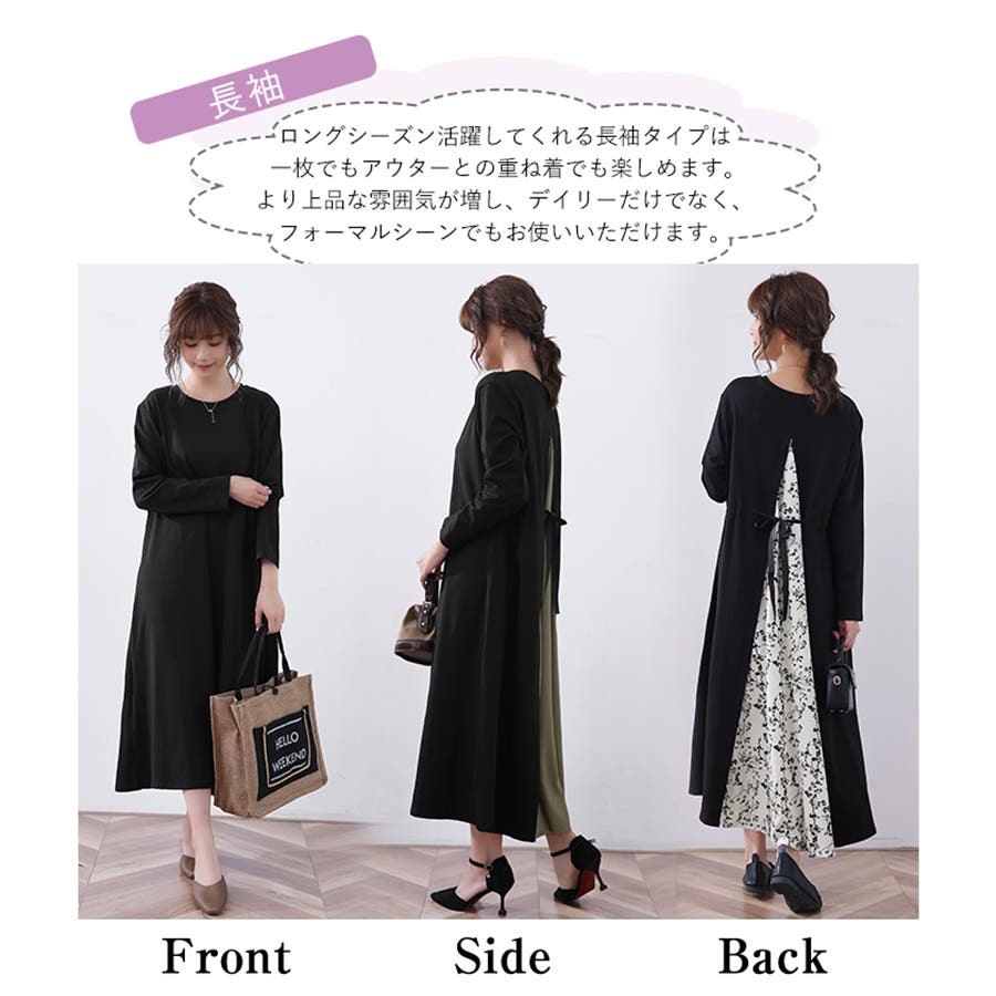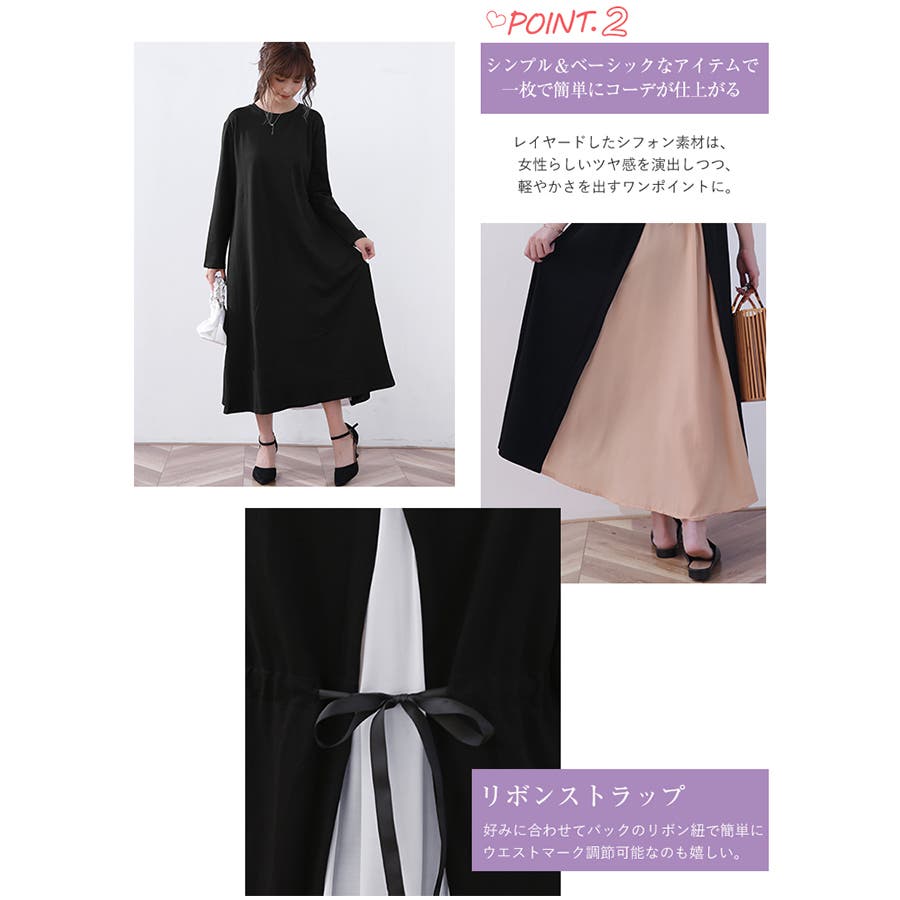 後ろ姿も抜かりなく、レイヤードしたシフォン素材が女性らしいツヤ感を演出し、デイリーにもお出かけにも使えるワンピースです。