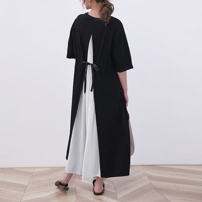 カジュアルな印象になりやすいTシャツワンピでも、バックスリットから異素材をレイヤードさせることで、シンプルながらもこなれ感を醸します。