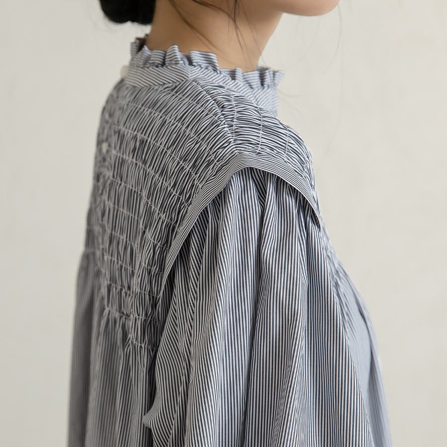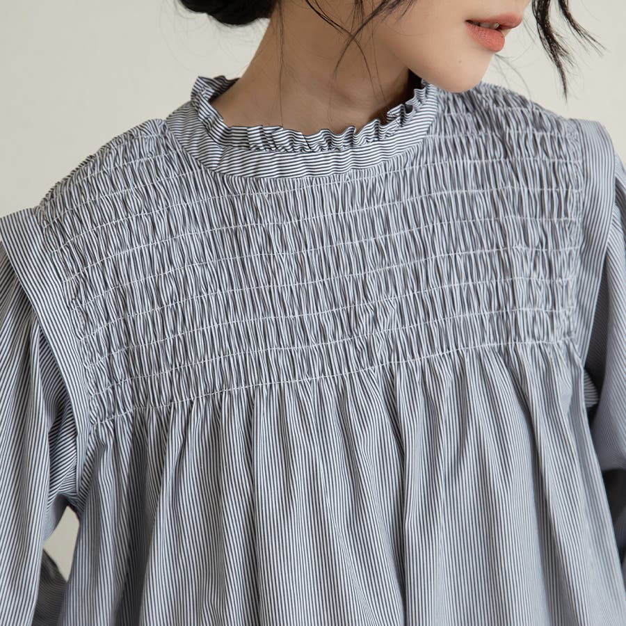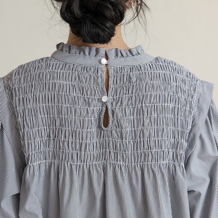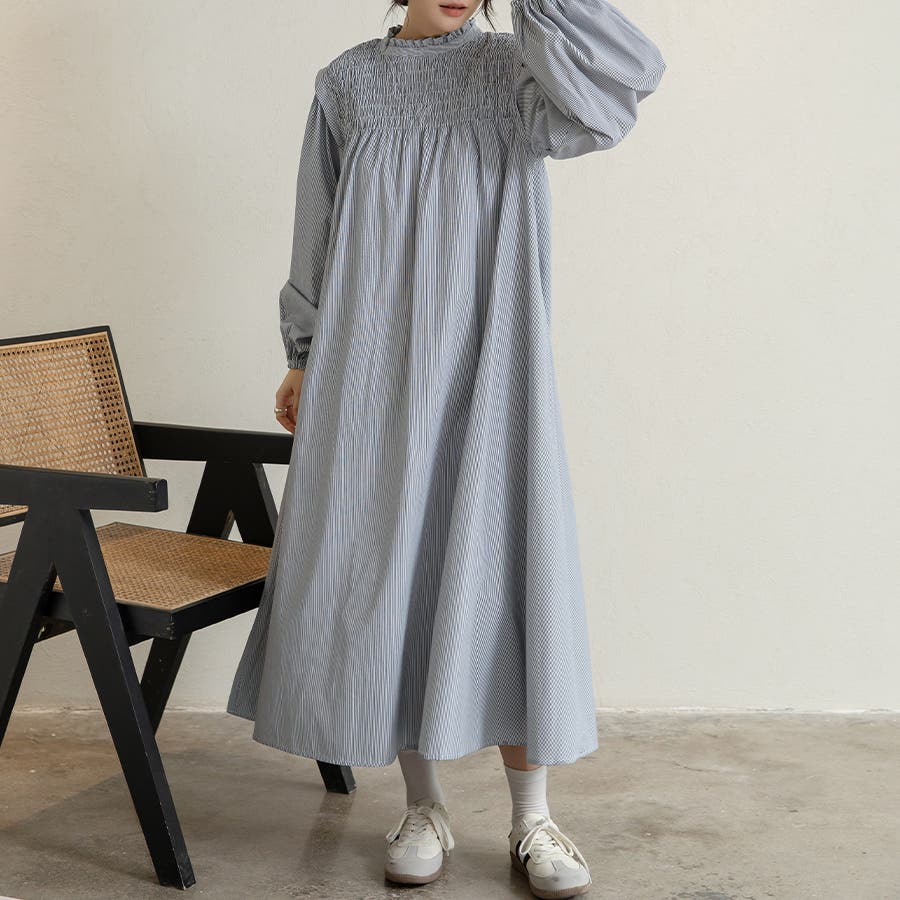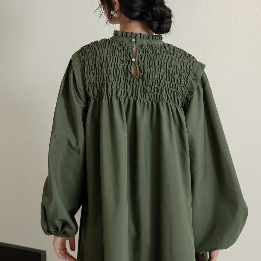 スモッキングギャザー仕様は華やかな印象とゆったりとしたフレアシルエットに。