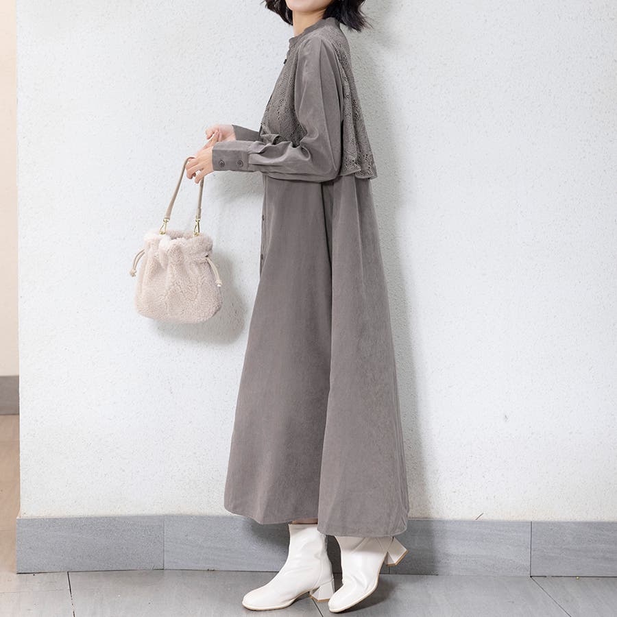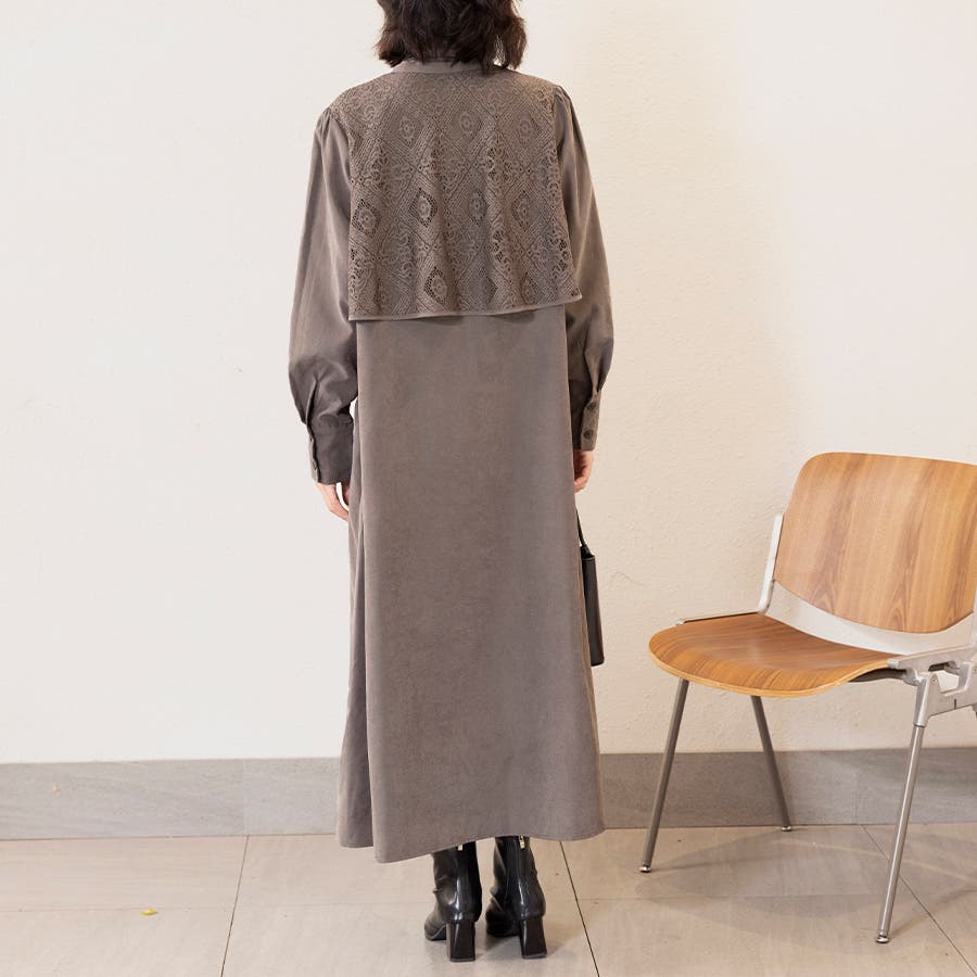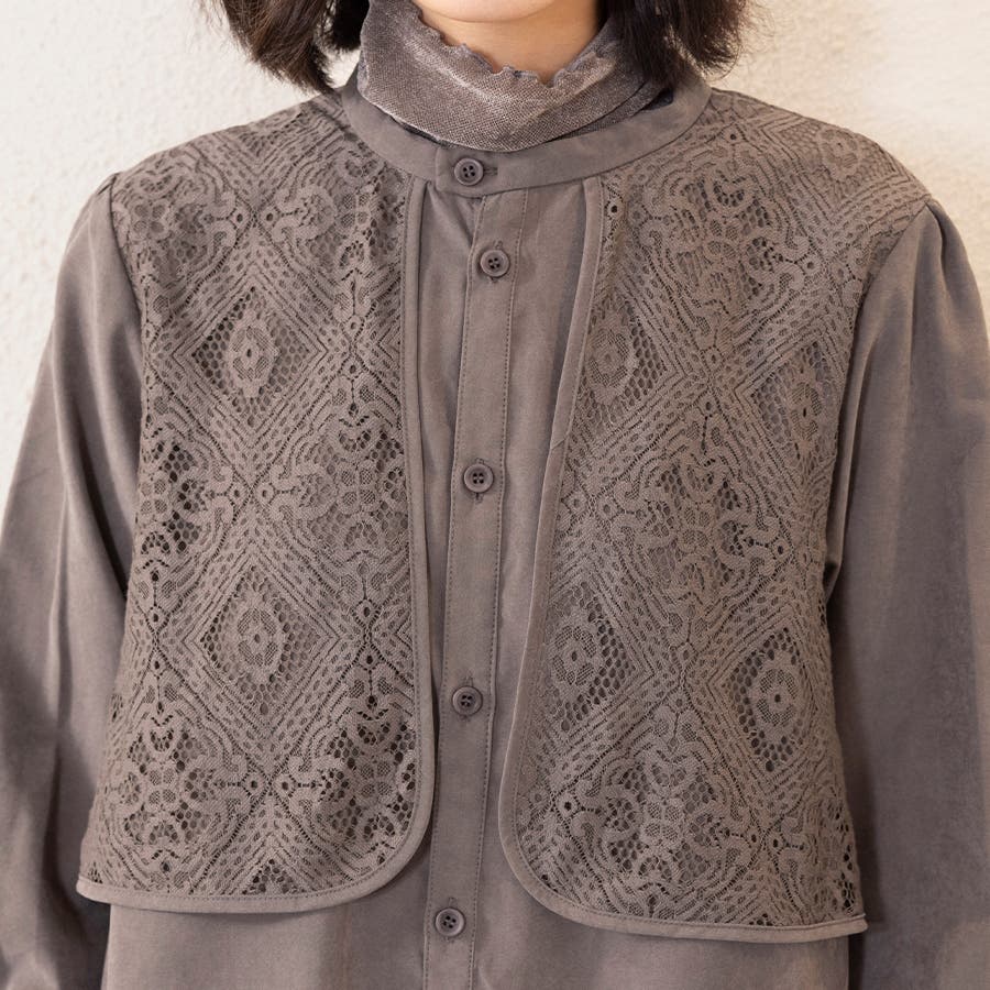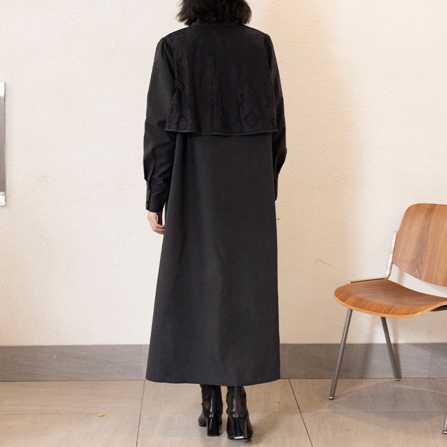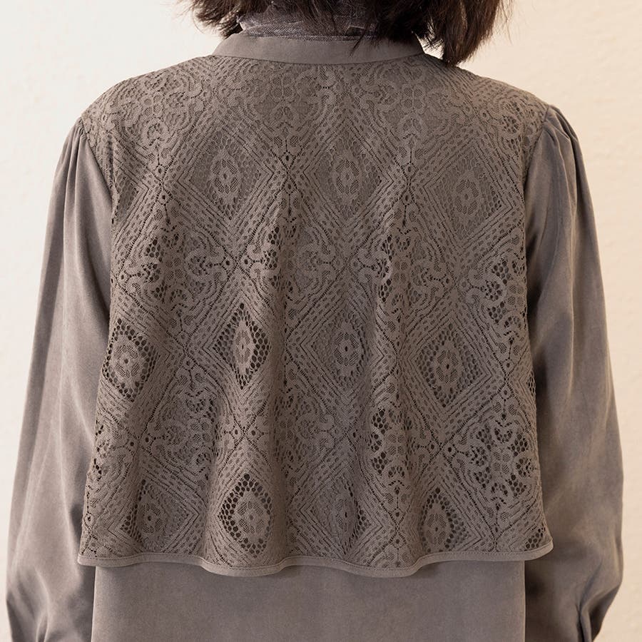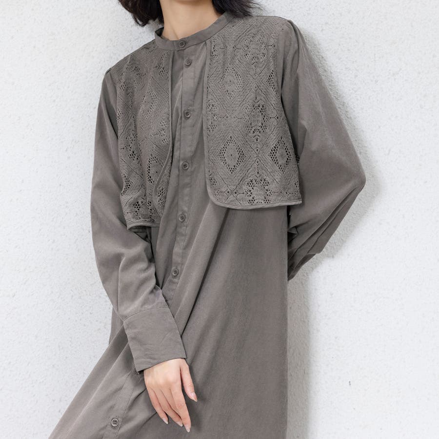 レースの切り替えが上品さを引き立て、バンドカラーがモダンな印象を与えます。