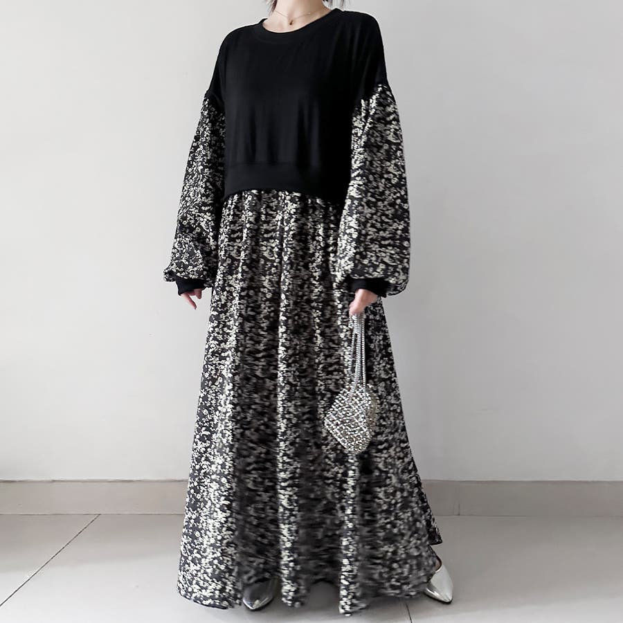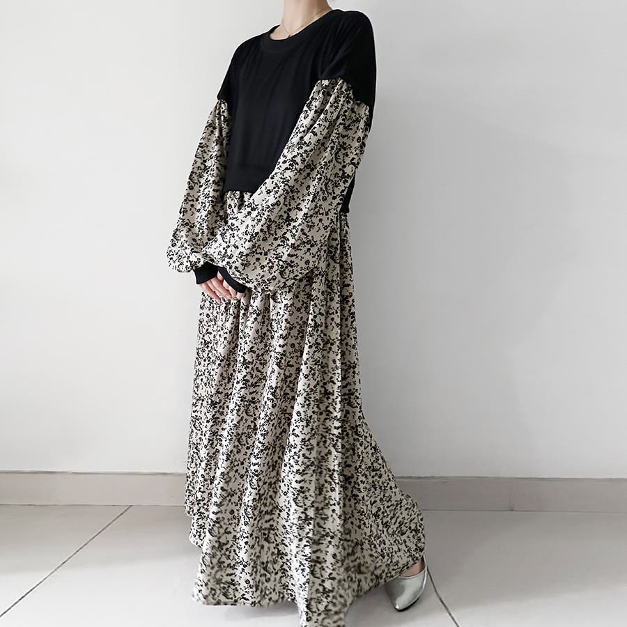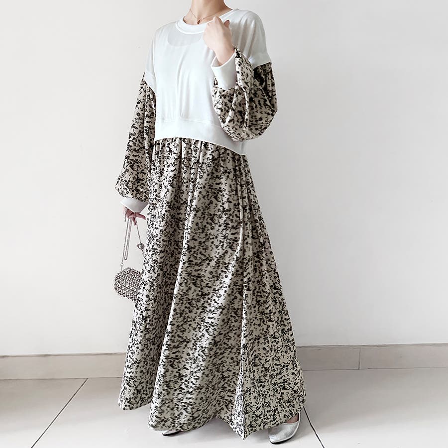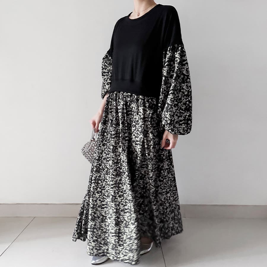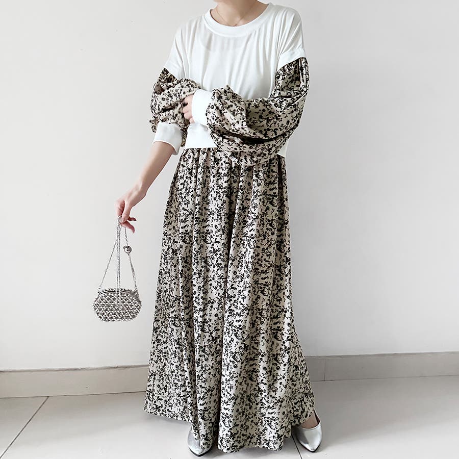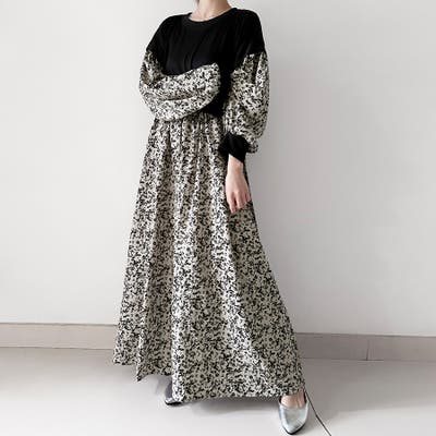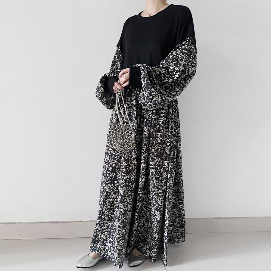 ゆったり着心地抜群なのに綺麗見えするドッキング花柄ロングワンピース♪