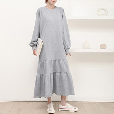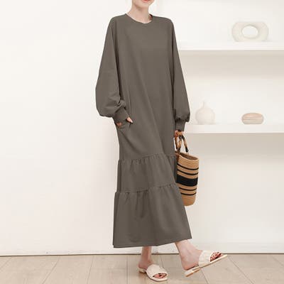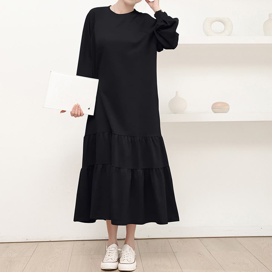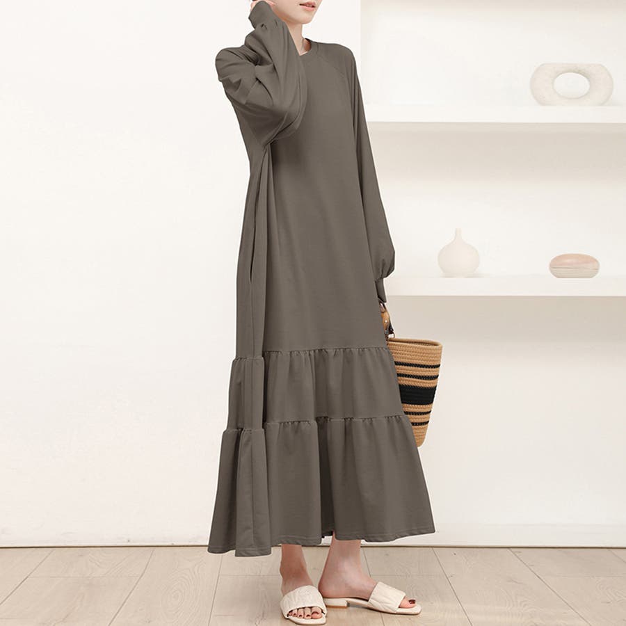ふんわりと広がるティアードデザインが魅力のロング丈ワンピース。
