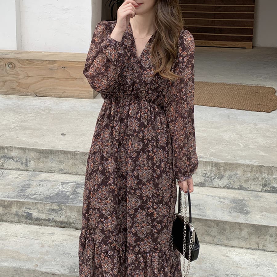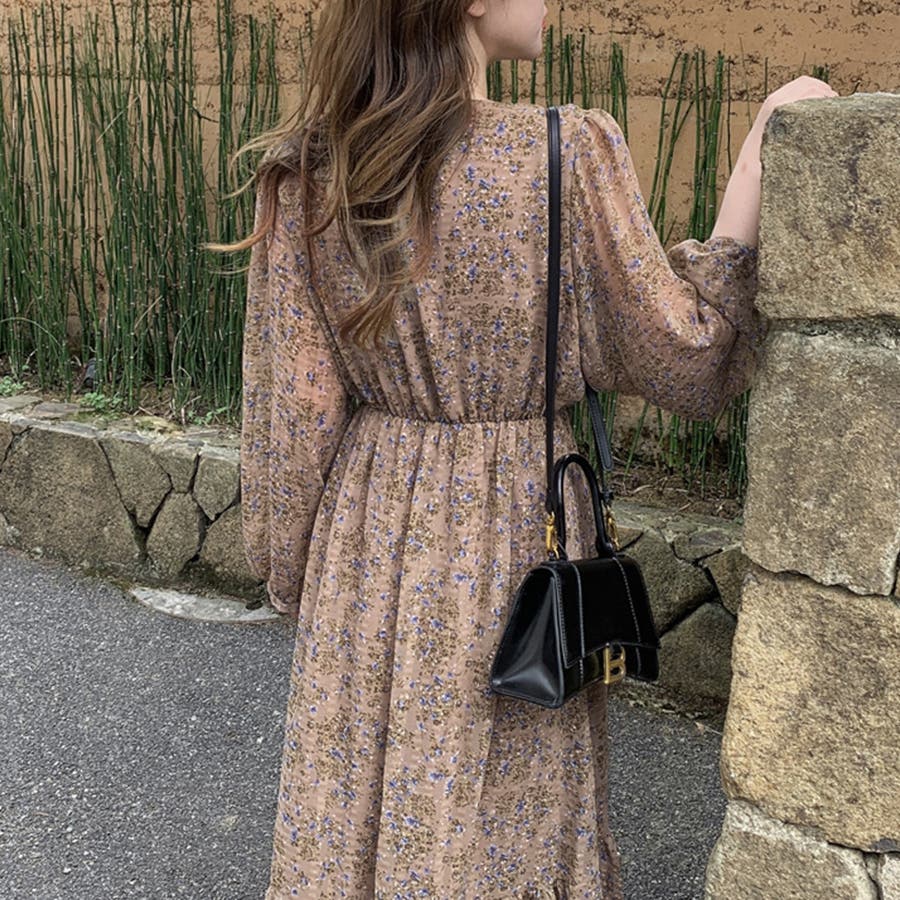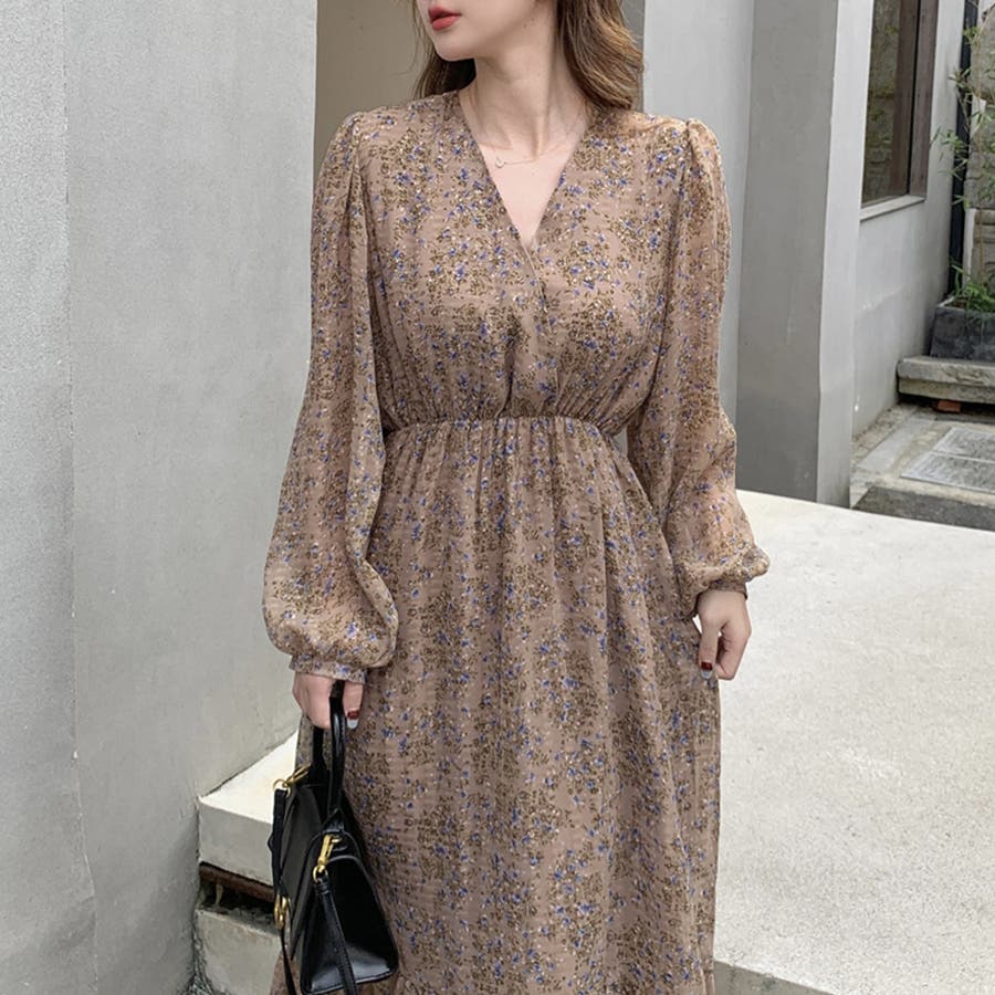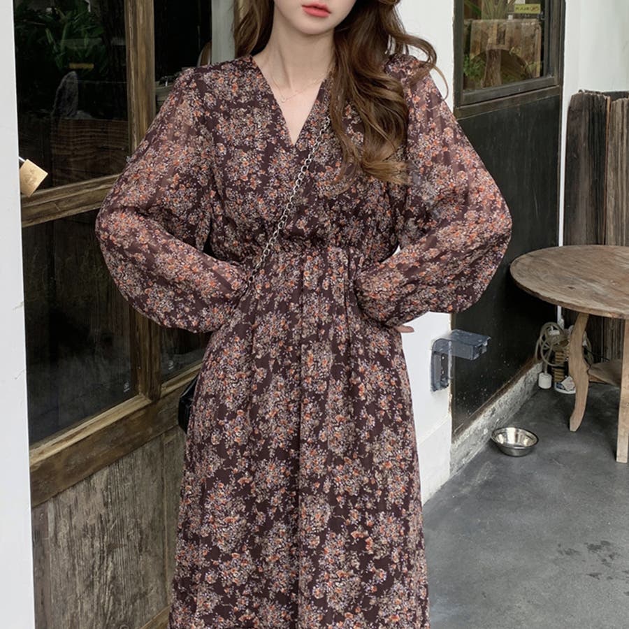 繊細な花柄とシアー素材が軽やかに揺れる、フェミニンな長袖ワンピース。
