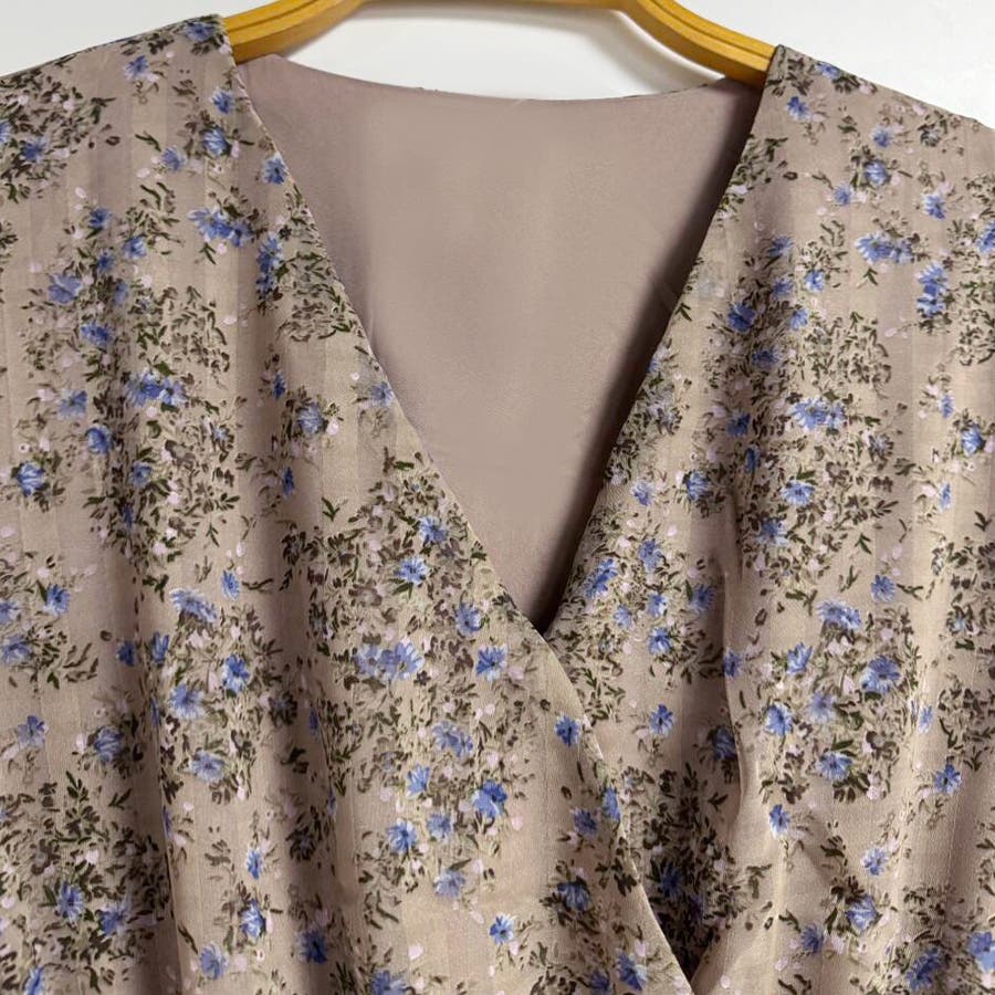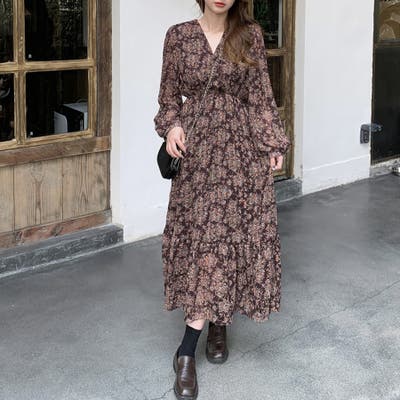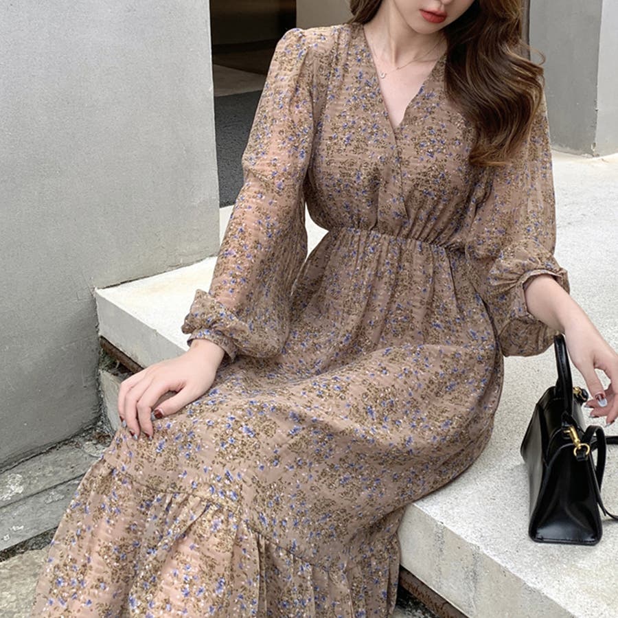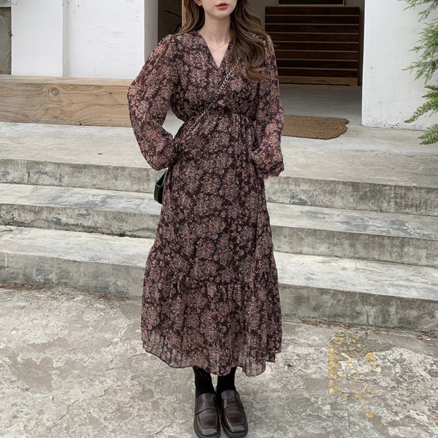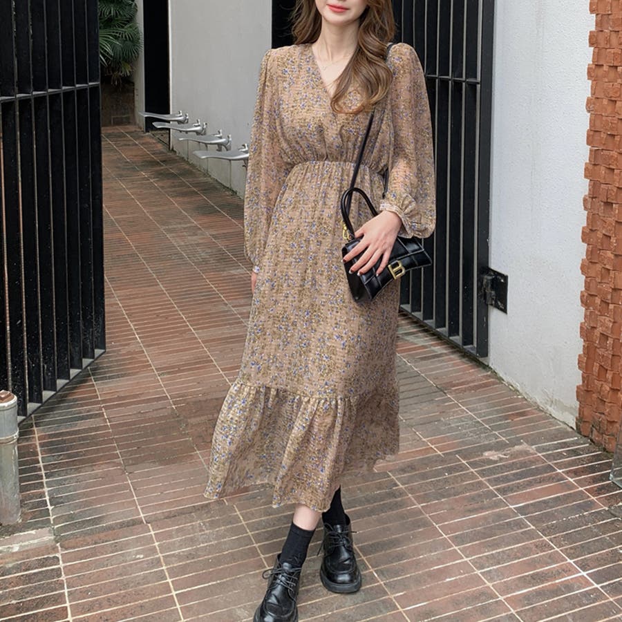 繊細な花柄とシアー素材が軽やかに揺れる、フェミニンな長袖ワンピース。