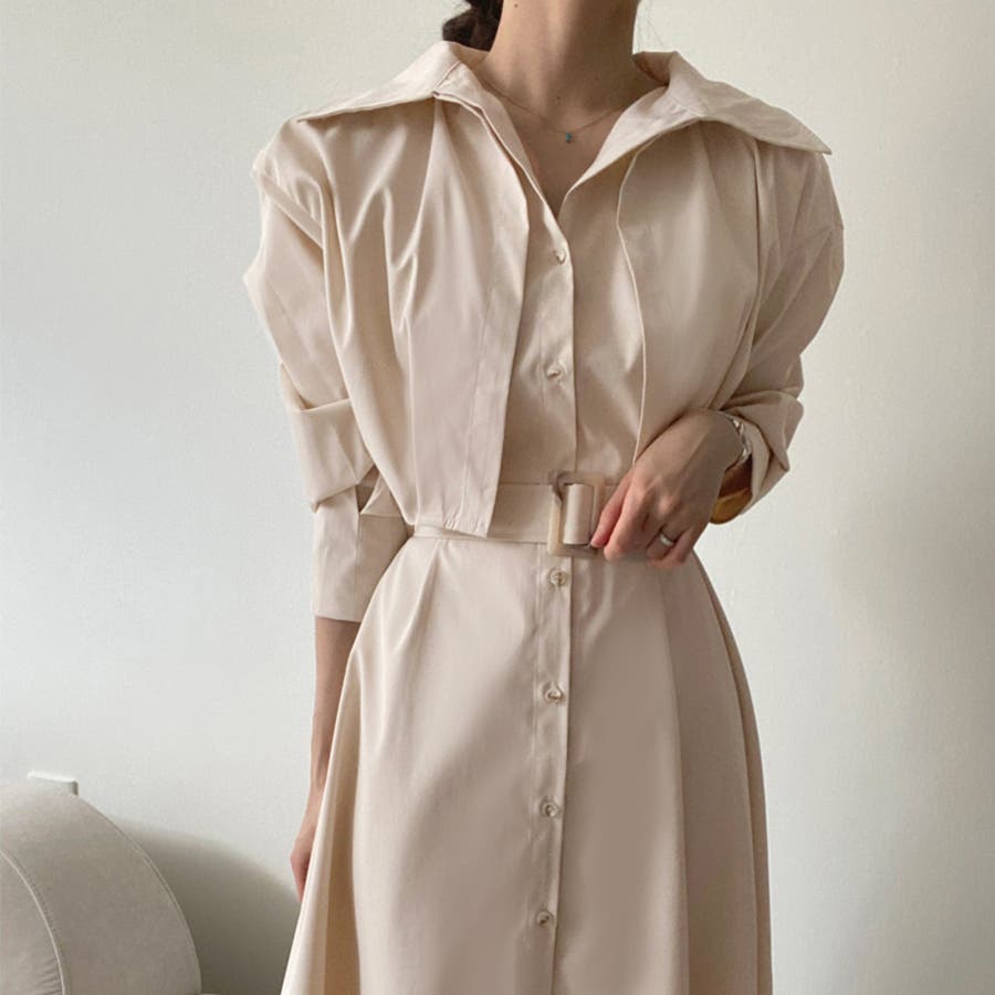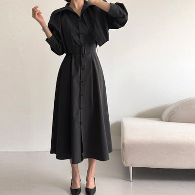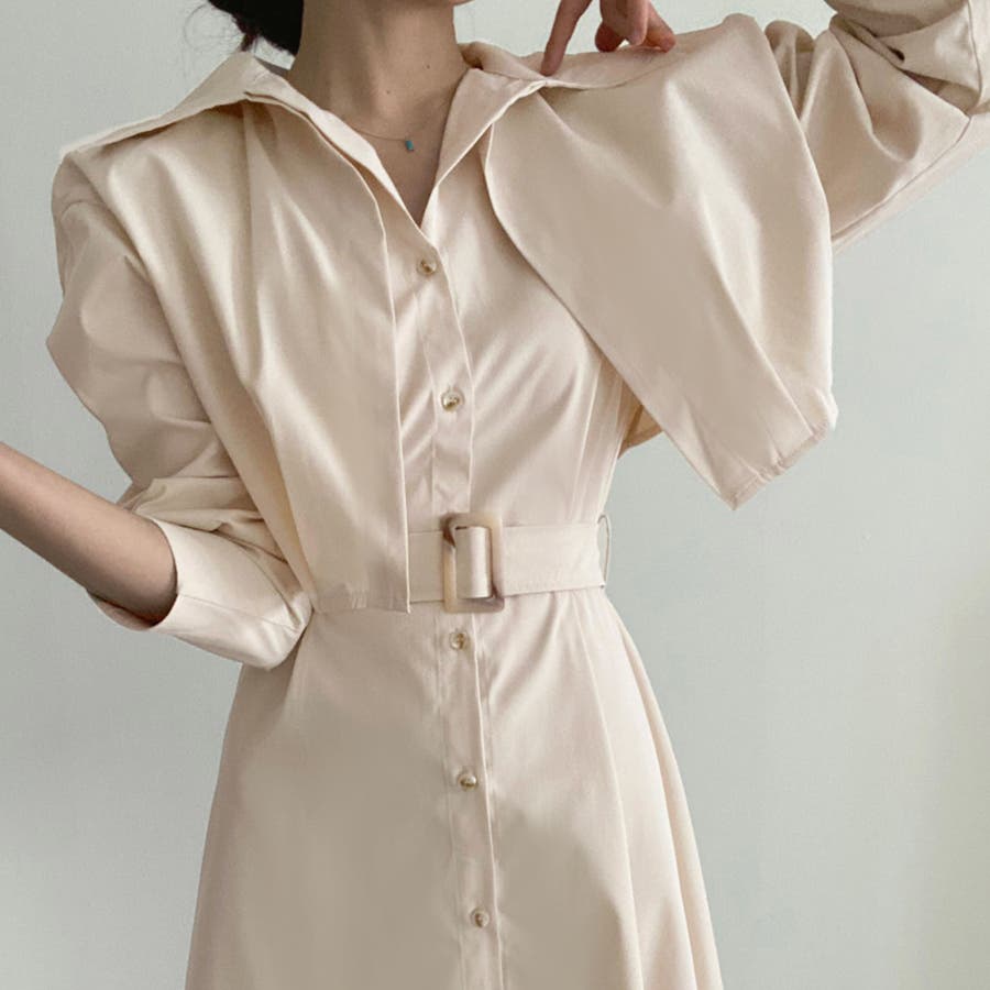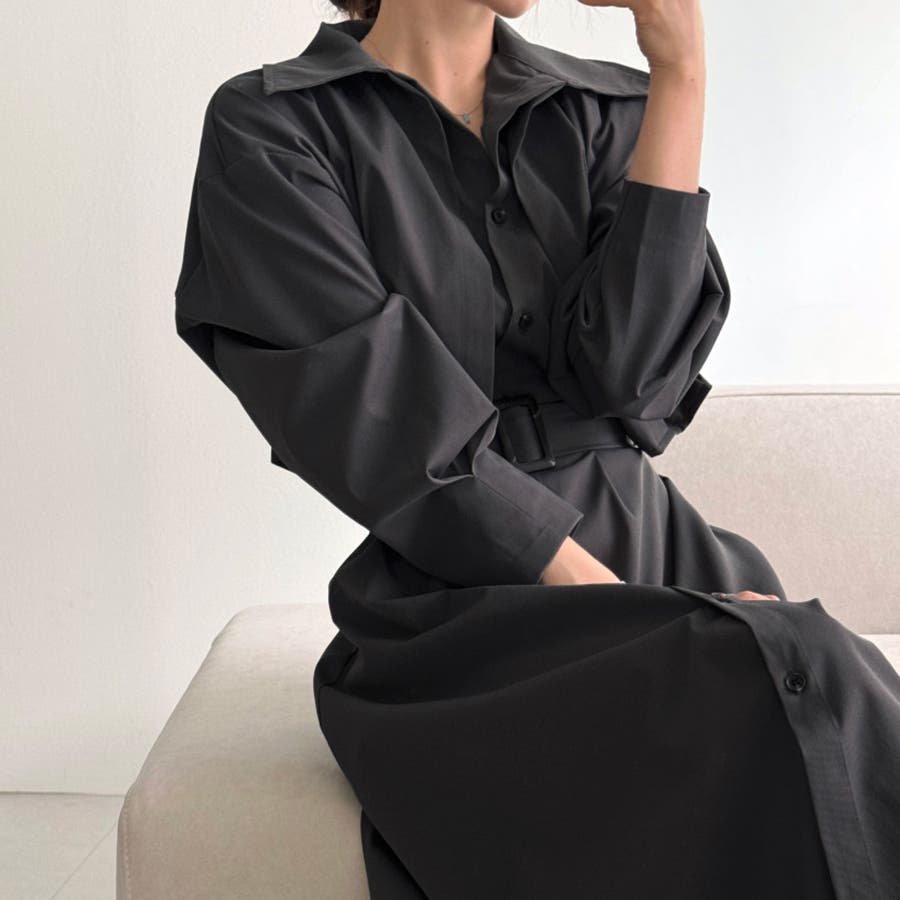 フロントボタンとウエストベルトが印象的な、ミディ丈シャツワンピース。