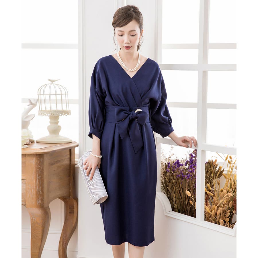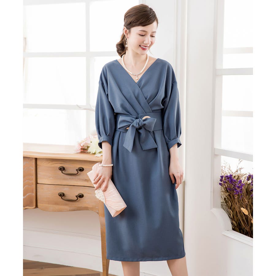 デザイン性に富んだ、ウエストリボン×カシュクールのほの甘ドレス。