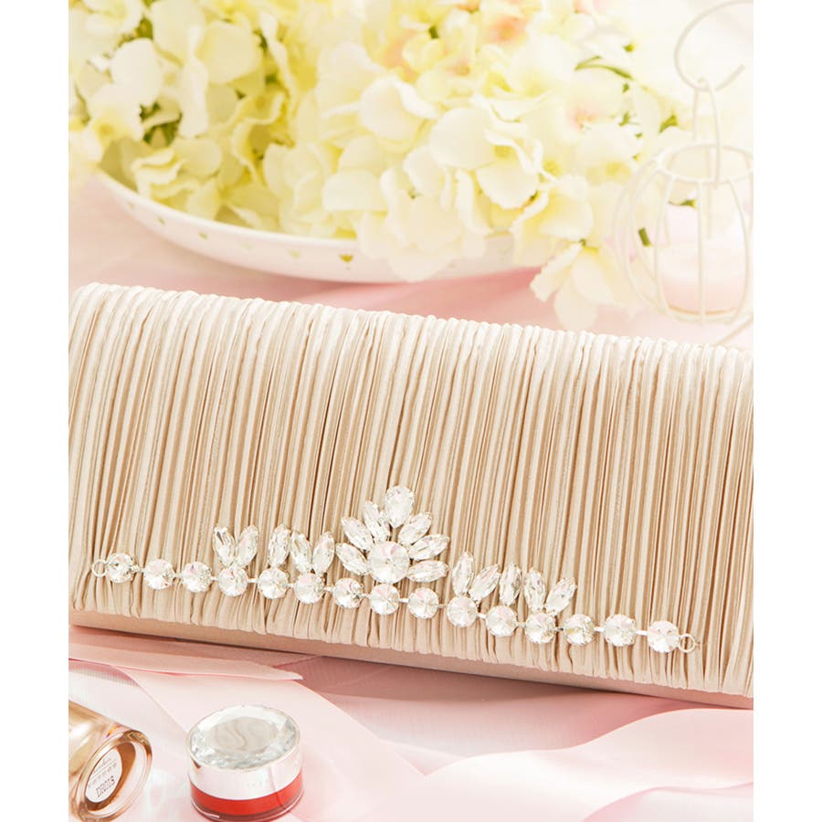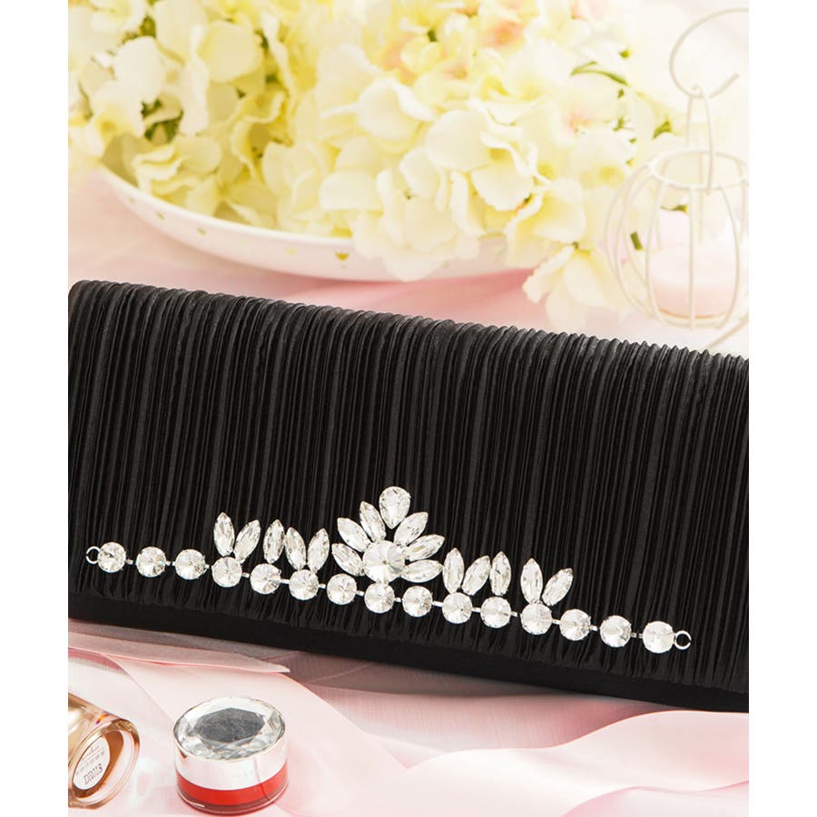 フラップのプリーツの上に上品なクリスタルビジューが施されているクラッチバッグ,周りとの差を付く斬新なビジュ使いが特徴です,大ぶりビジューが輝きを放つ華やかなゴージャスな印象,手に持ちやすいフォルム×必需品もしっかり収まるタイプ,気分に合わせて付属のチェーンを付けて、,スタイルチェンジもできます商品カテゴリ:#結婚式 バッグ #2次会 バッグ #結婚式 クラッチバッグ #パーティー バッグ #女子会 バッグバッグ バック パーティーバッグ パーティーバック クラッチバッグ クラッチバック ショルダーバッグ ハンドバッグ チェーンバッグポシェット 大容量 ポケット 小さめ 持ち手 収納 ポーチ 2way 3way A4 肩掛け 斜めがけ サブバッグ フォーマルバッグセカンドバッグ お呼ばれ パーティ パーティー パーティードレス パーティドレス フォーマル レディース レディス ワンピ ワンピース大人 かわいい シンプル 個性的 新作 人気 大きい 大きめ 20代 30代 40代 50代 秋冬 春夏 2次会 オフィス お宮参り結婚式 謝恩会 食事会 女子会 成人式 卒園式 デート 同窓会 二次会 入園式 入学式 発表会 披露宴 演奏会 冠婚葬祭 婚活 七五三卒業式 通勤 ミニ セット グリーン ゴールド シルバー ネイビー バイカラー ピンク ブラック ブルー ベージュ ボーダー ホワイトレッド 花柄 黒 青 赤 白 サテン シフォン ナイロン パール ビーズ ビジュー プリーツ フリル リボン レース レーヨン 刺繍総レース 綿 裏地 衣装 ギフト コーディネート セレブ ファッション 服 服装