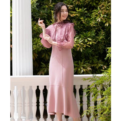 女性らしい柔らかなシルエットを惹きたてるマーメードラインのノースリーブワンピースと、ビッグカラーレースボレロの2点セット。