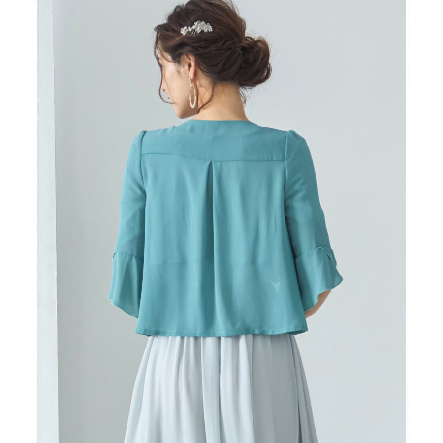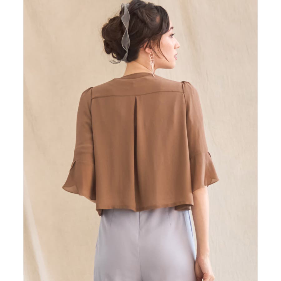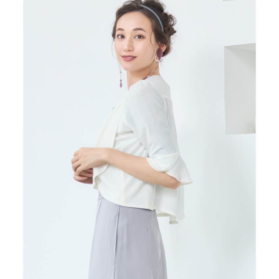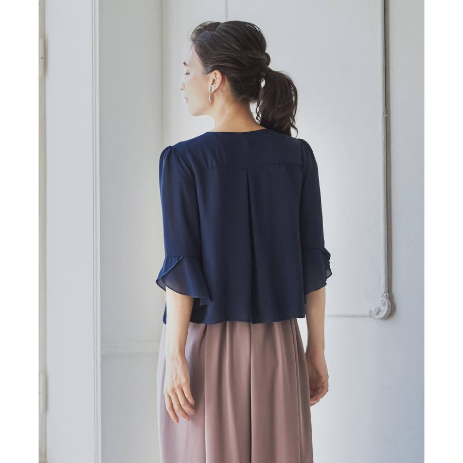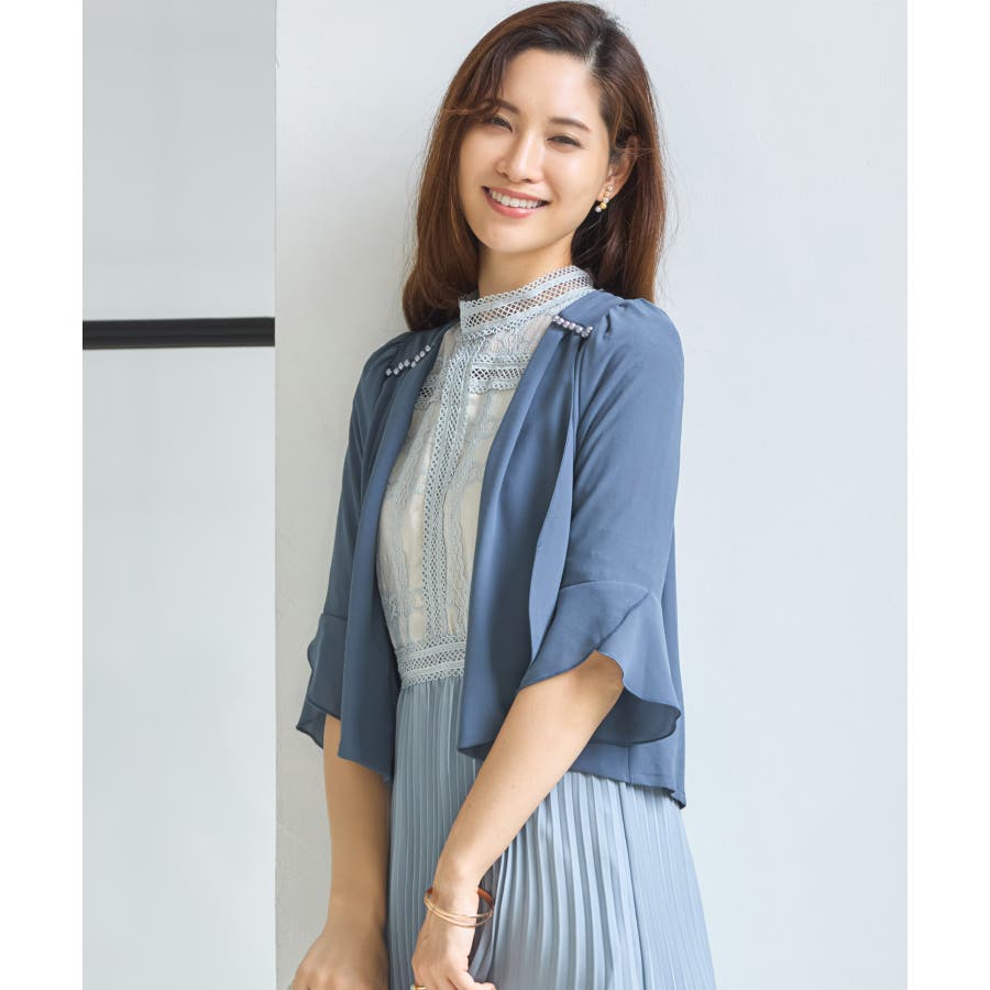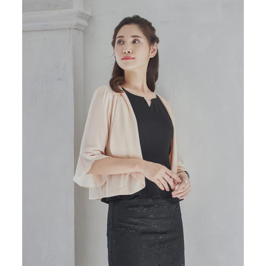 着回し力抜群のフリルシフォン風ボレロ。フリルをたっぷりとあしらった、フェミニンなボレロです。透け感のある柔らかなシフォン風素材によって、レイヤードしても重たくなりすぎず、軽やかな印象に。羽織るだけで簡単におしゃれ見えが実現できるアイテムです。フロントの大きく開いたデザインによって、胸元のアクセサリーやドレスの美しさを引き立てます。ドレスとのバランスが取りやすく、着回し力も抜群です。背面のインバーテッドプリーツによって、背中のラインにピッタリとフィット。無駄のない美しいシルエットを実現します。肩周りも動かしやすく、ノンストレスで着こなせるのもポイントです。両肩にあしらったバールビジューが、ラグジュアリー感をプラス。華やかなパーティーシーンで、繊細な輝きを放ちます。