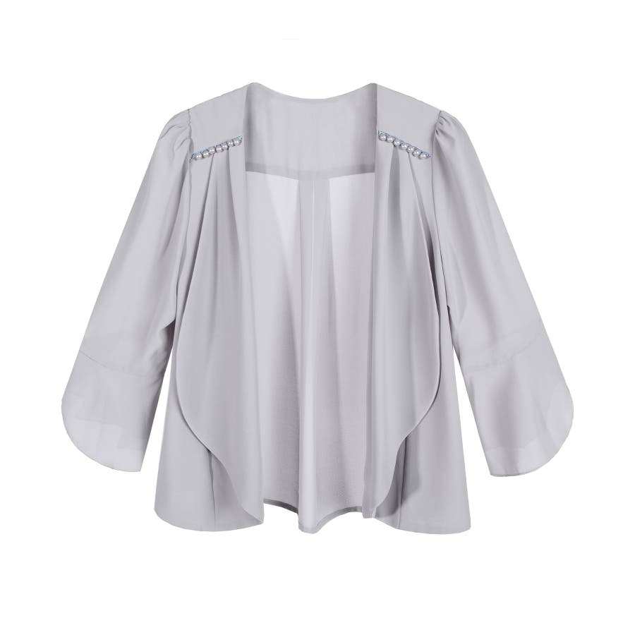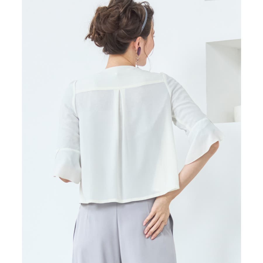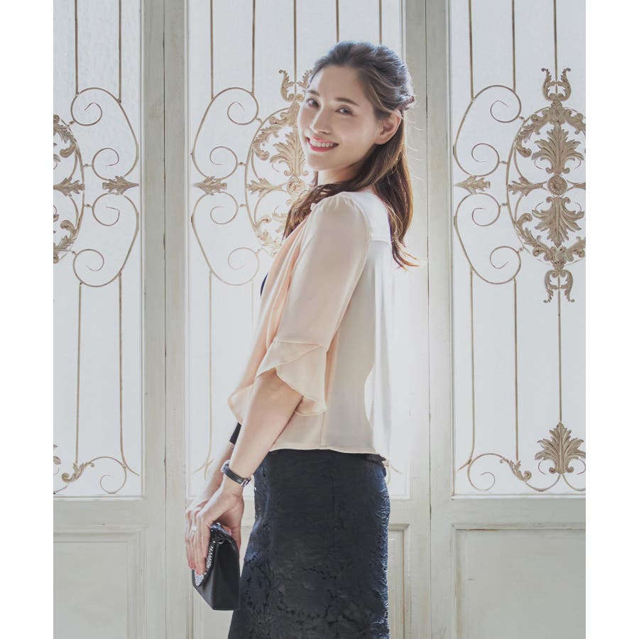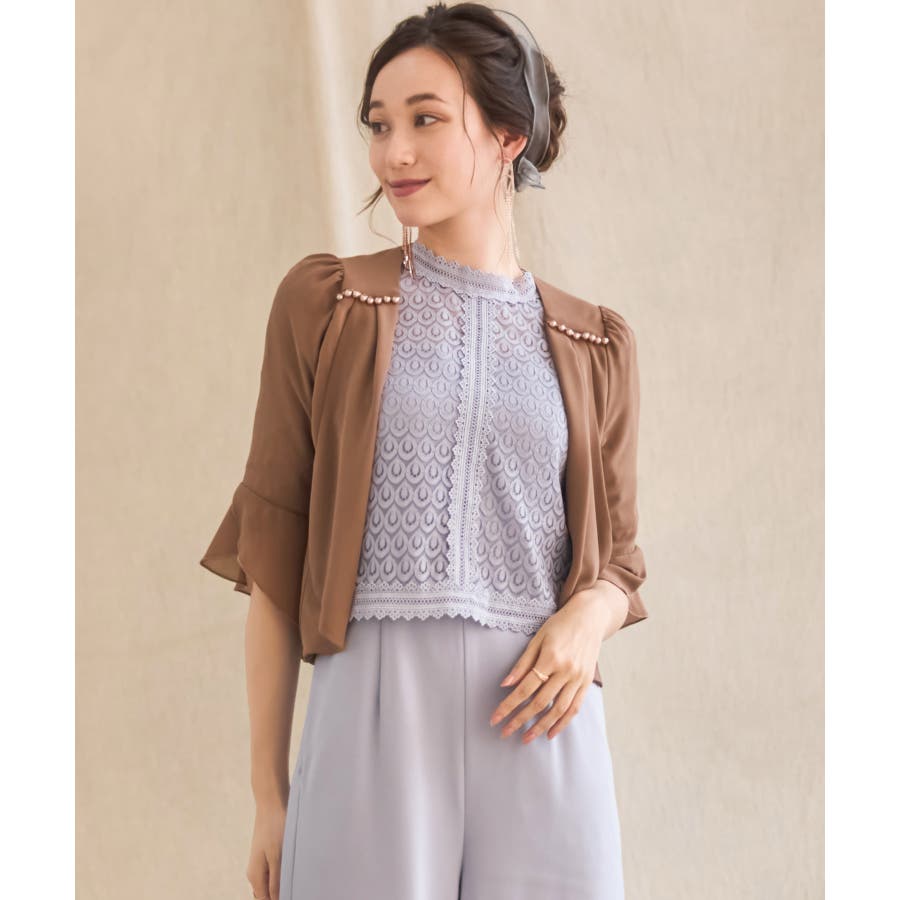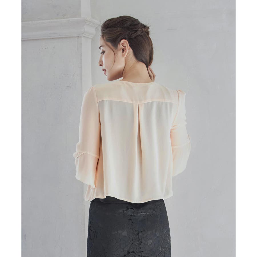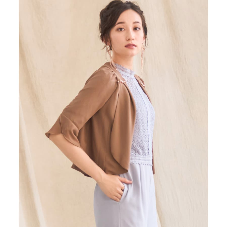 着回し力抜群のフリルシフォン風ボレロ。フリルをたっぷりとあしらった、フェミニンなボレロです。透け感のある柔らかなシフォン風素材によって、レイヤードしても重たくなりすぎず、軽やかな印象に。羽織るだけで簡単におしゃれ見えが実現できるアイテムです。フロントの大きく開いたデザインによって、胸元のアクセサリーやドレスの美しさを引き立てます。ドレスとのバランスが取りやすく、着回し力も抜群です。背面のインバーテッドプリーツによって、背中のラインにピッタリとフィット。無駄のない美しいシルエットを実現します。肩周りも動かしやすく、ノンストレスで着こなせるのもポイントです。両肩にあしらったバールビジューが、ラグジュアリー感をプラス。華やかなパーティーシーンで、繊細な輝きを放ちます。