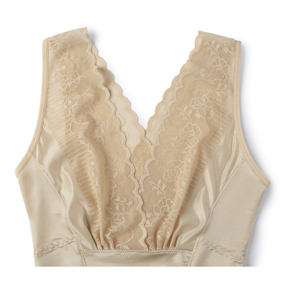 花柄レースが肩とバスト、ヒップ周りに施されたデザインです。ウエスト周りを引き締めながらセクシーな印象をプラス。ラインが出ないので、外からの見た目も好印象です。