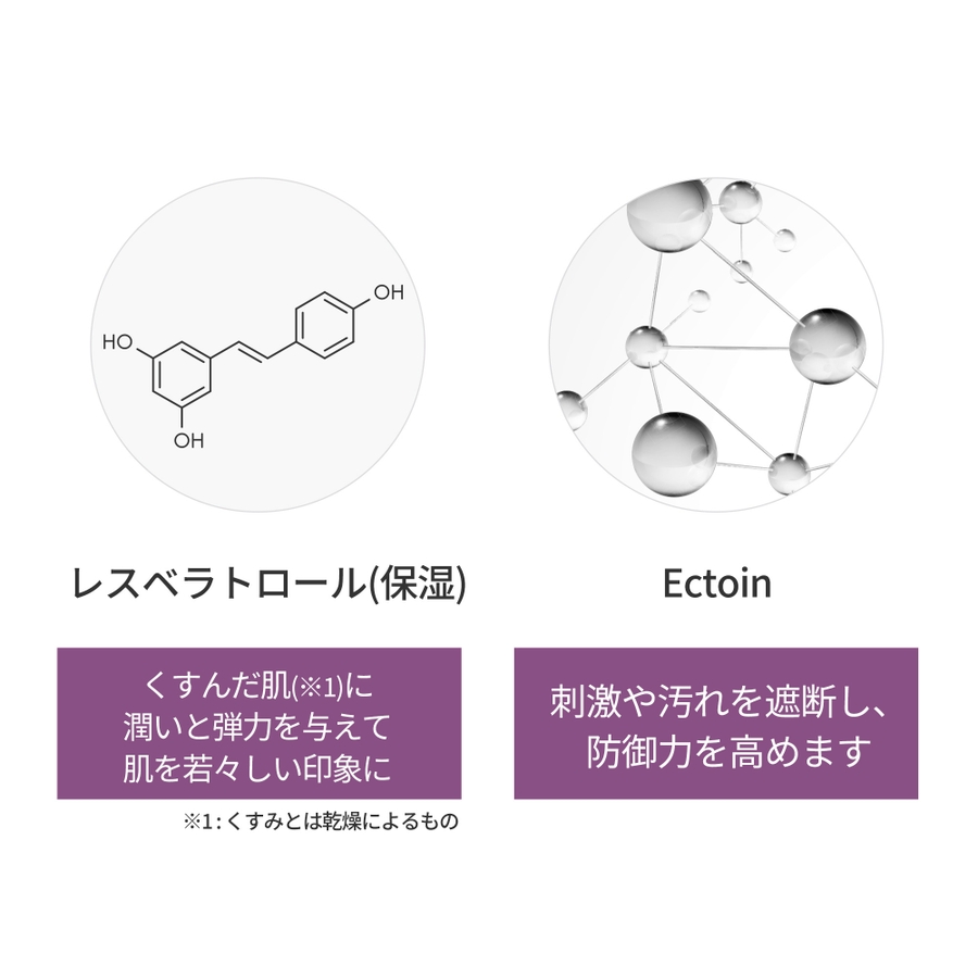 エスベラトロール・エクトインによって潤いと弾力を与えて肌を若々しい印象にしてくれます。