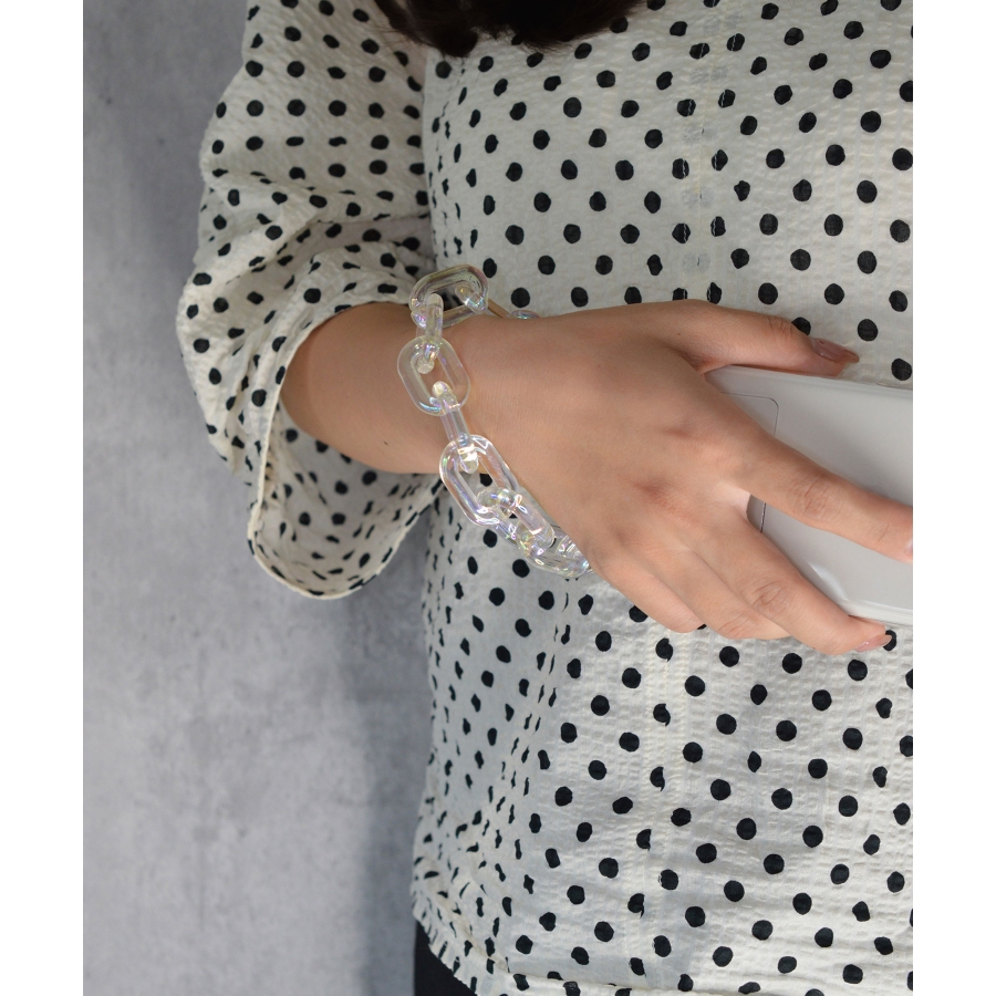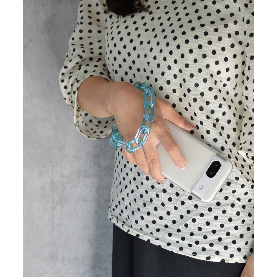 透明感あふれるアクリルに、オーロラのような輝きをプラスする**「AB加工(Aurora Borealis加工)」**を施したリストストラップ。角度や光の加減でブルー・ピンク・イエローなど多彩にきらめき、まるでアクセサリーのように手元を彩ります。