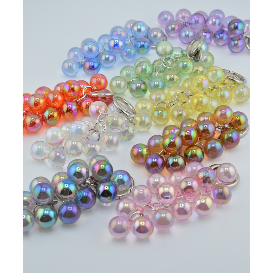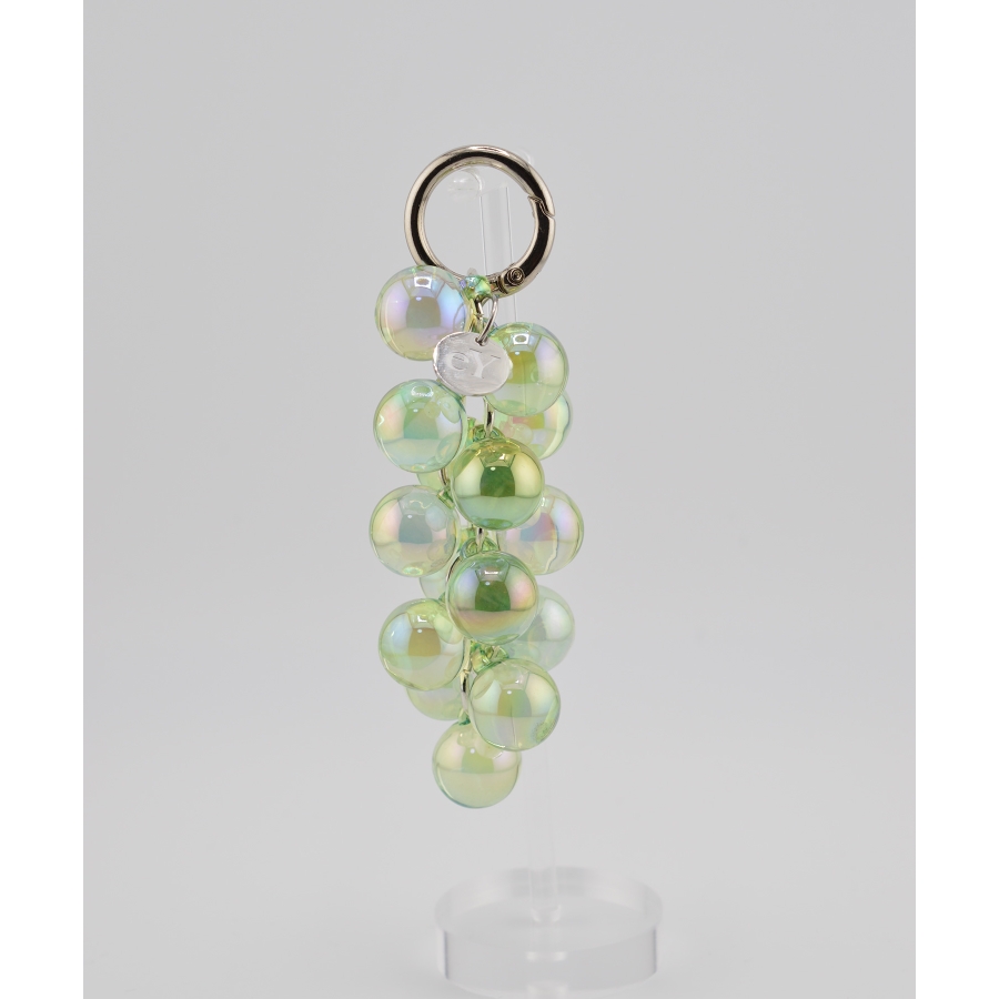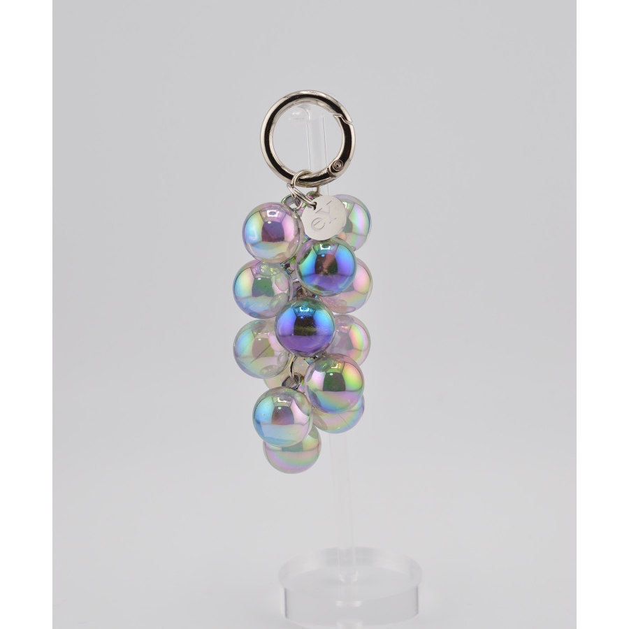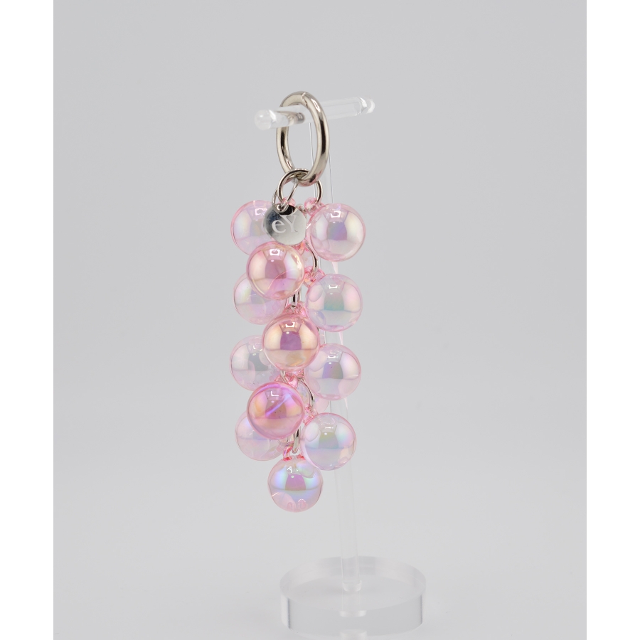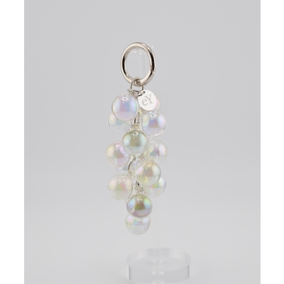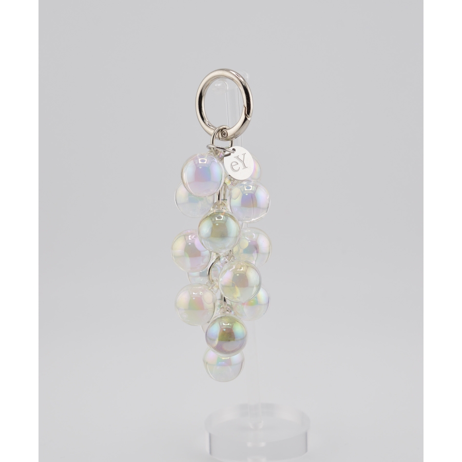 きらめく泡が弾けるような、透明感あふれる“ぶどうモチーフチャーム”。光の角度によって表情を変えるガラス調のビーズが、まるでバブルの粒が集まってできた宝石のよう。シルバーパーツとの組み合わせがほどよくモードで、バッグやスマホ、キーにプラスするだけで一気に華やかな印象に。eYロゴチャームがアクセントになり、日常に小さなときめきを添えてくれます。