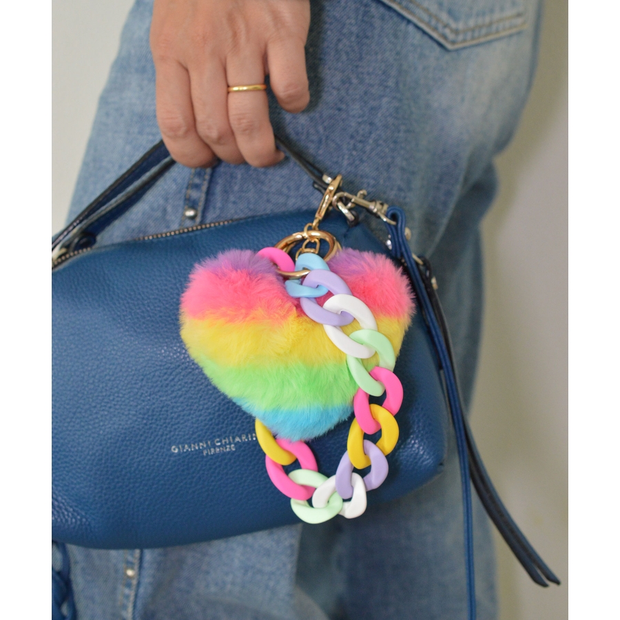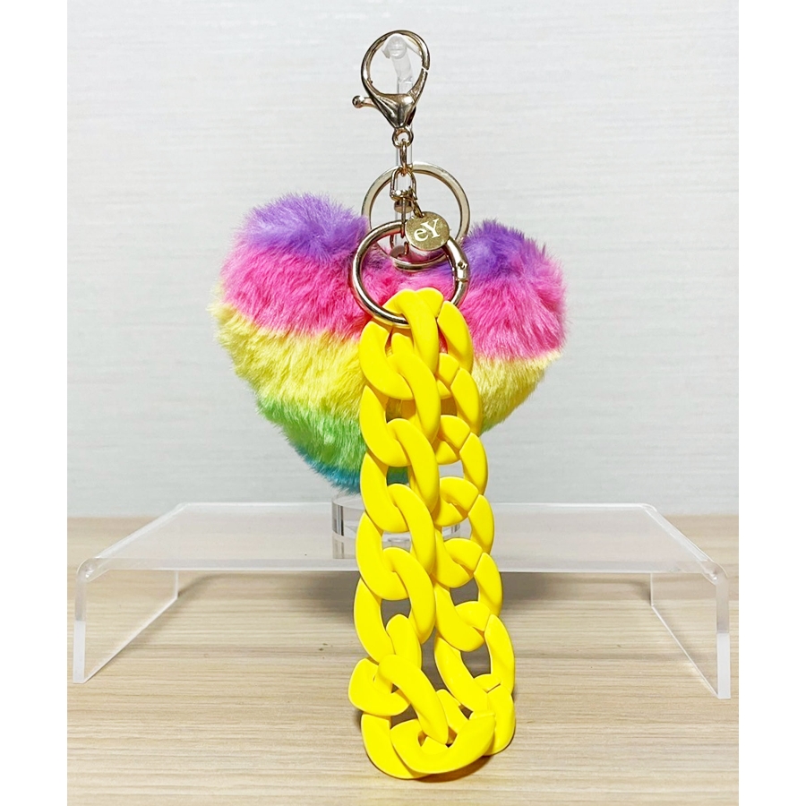 ふわふわのレインボーハートと、マットカラーのチェーンストラップがリンクしたPOPなチャーム。カラフルなトーンが視線を惹きつけ、手元やバッグに思わず笑顔をくれるアイテムです。存在感抜群のチェーンストラップは手首にも通せる2WAY仕様。“Cutting Loose”なeYらしさが溢れる、キッチュでハッピーなアクセントをあなたに。