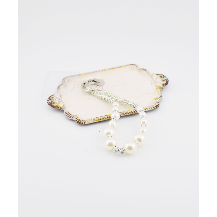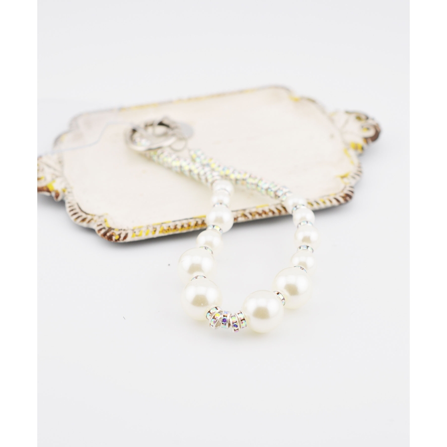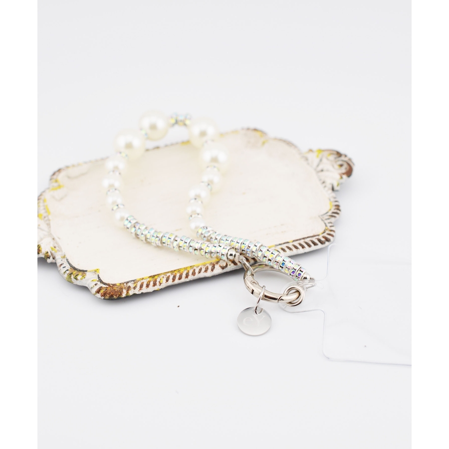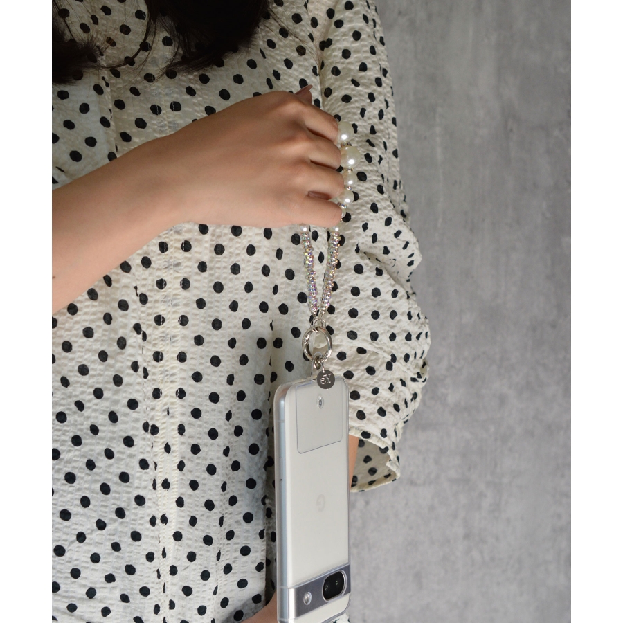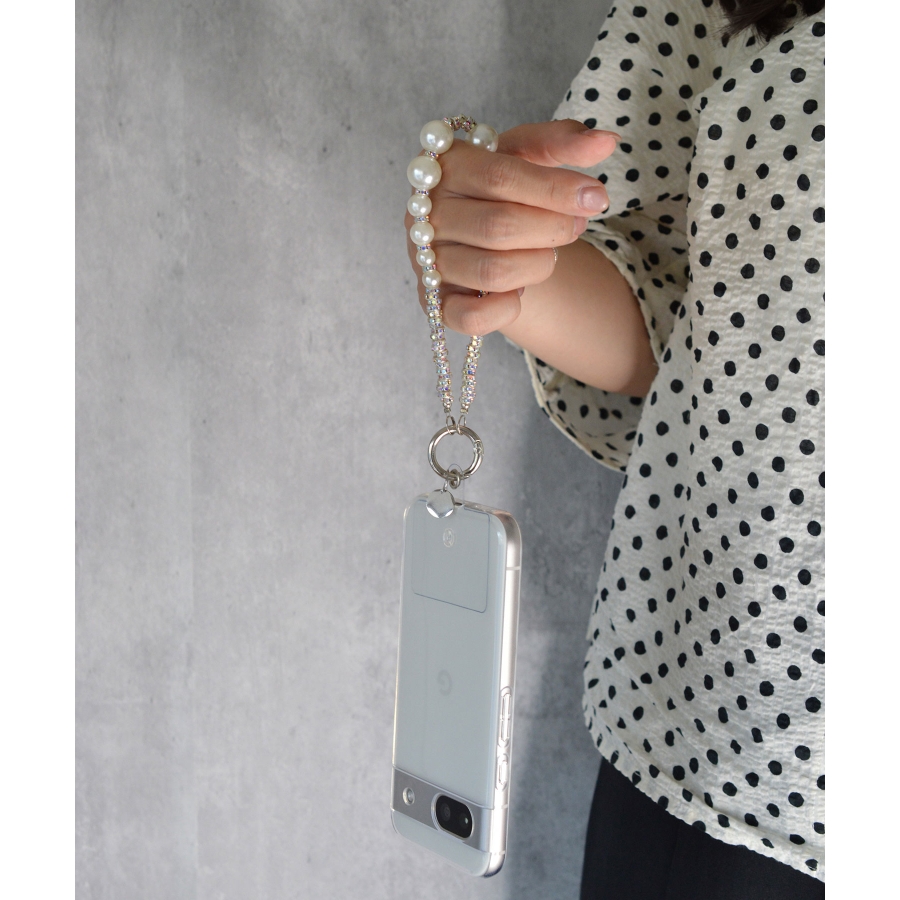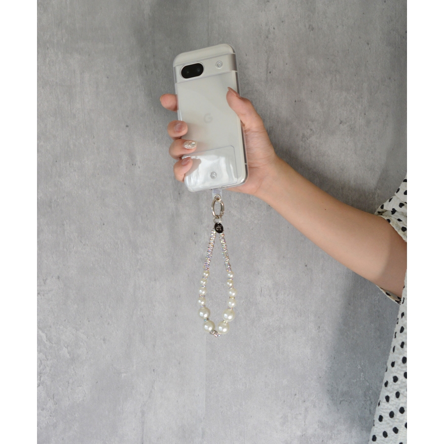 日常使いのアクセサリーに、さりげないラグジュアリーを。艶やかなフェイクパールに、きらめくクリスタルパーツを合わせたデザインは、クラシックさと遊び心を両立。メタルリングとクリアタグがモダンなアクセントとなり、スマホやポーチ、ミニバッグに華やかさをプラスしてくれます。