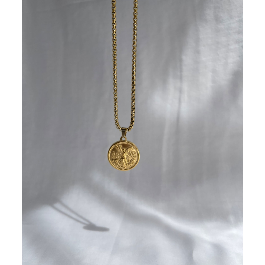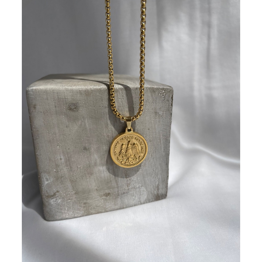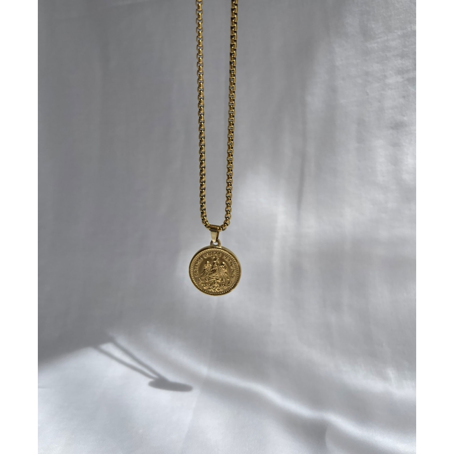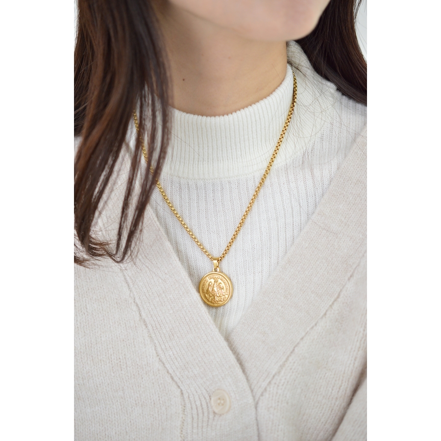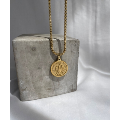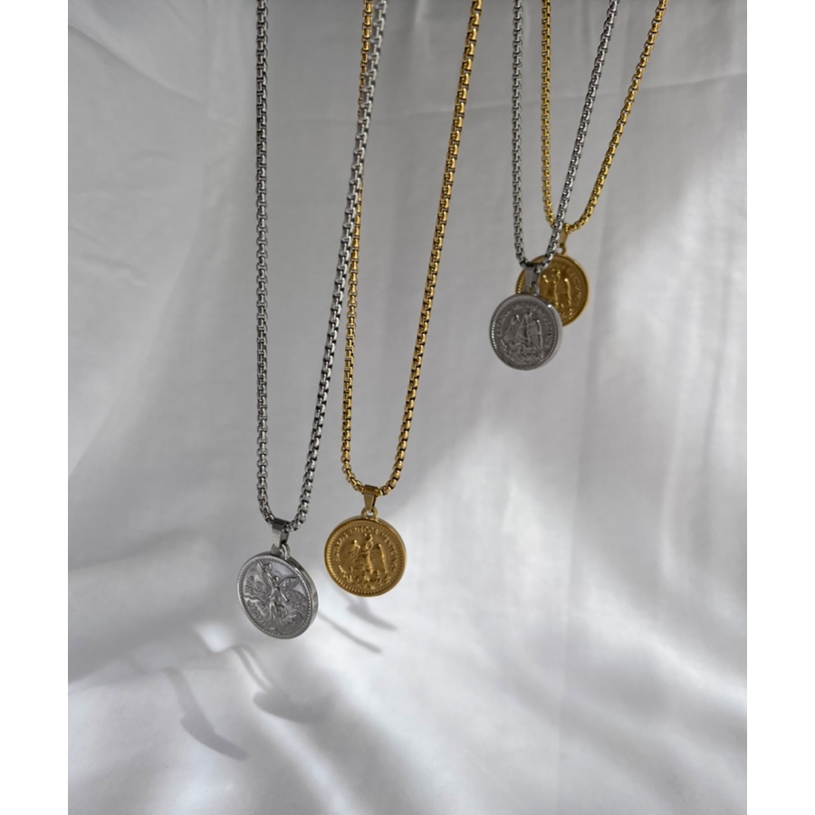 珍しいメキシコ50ペソのデザインが施されたコインネックレス。耐久性に優れており、長期間使用しやすい製品を探している方にぴったりです。2.5×2.5cmとインパクトがあるサイズのトップがポイント。トップを繋ぐのは、重厚感のある「ベネチアンチェーン」、大人っぽさを演出したい方にも適しています。トップを取り外し、チェーンのみ首からさげるといった使い方も可能。服や気分に合わせてコインを着脱できるおすすめの製品です。