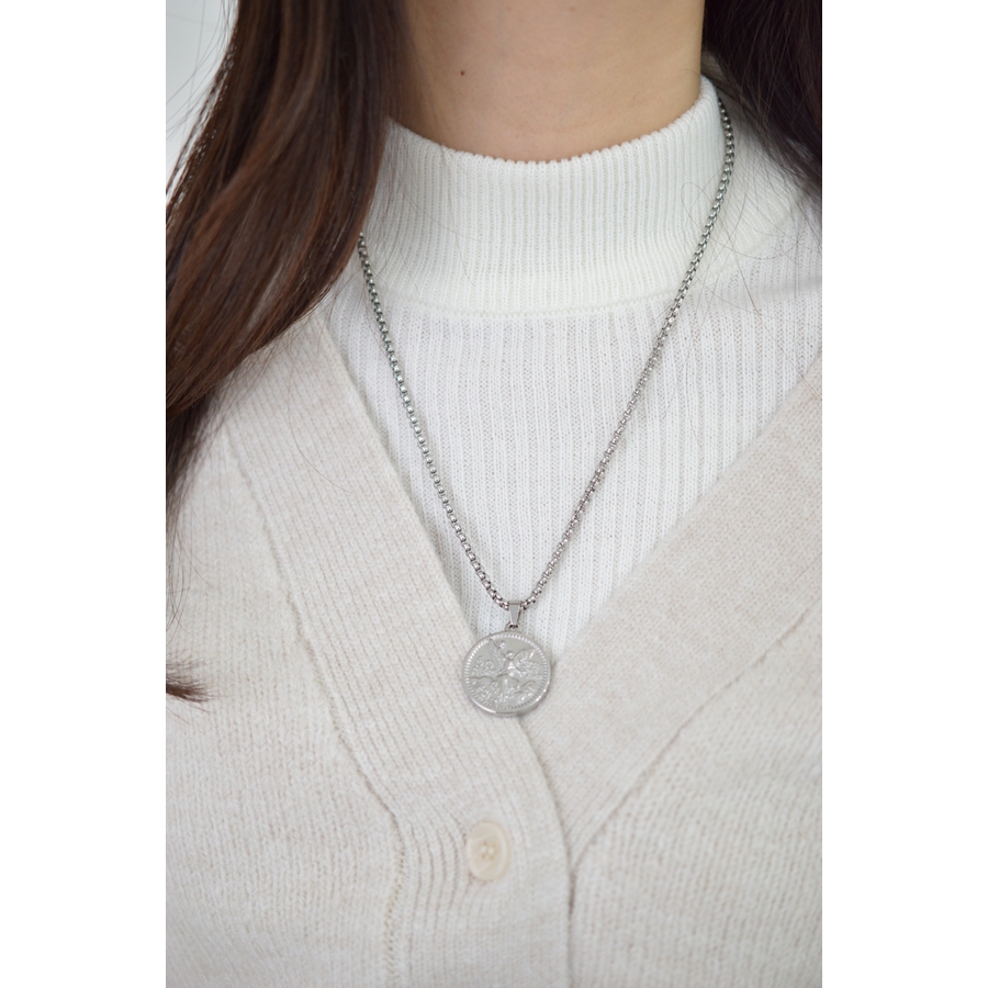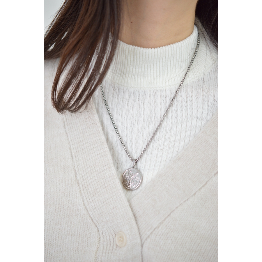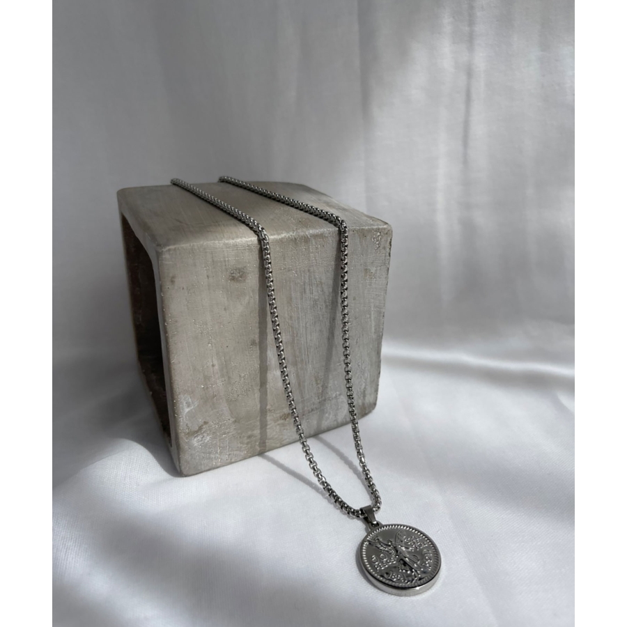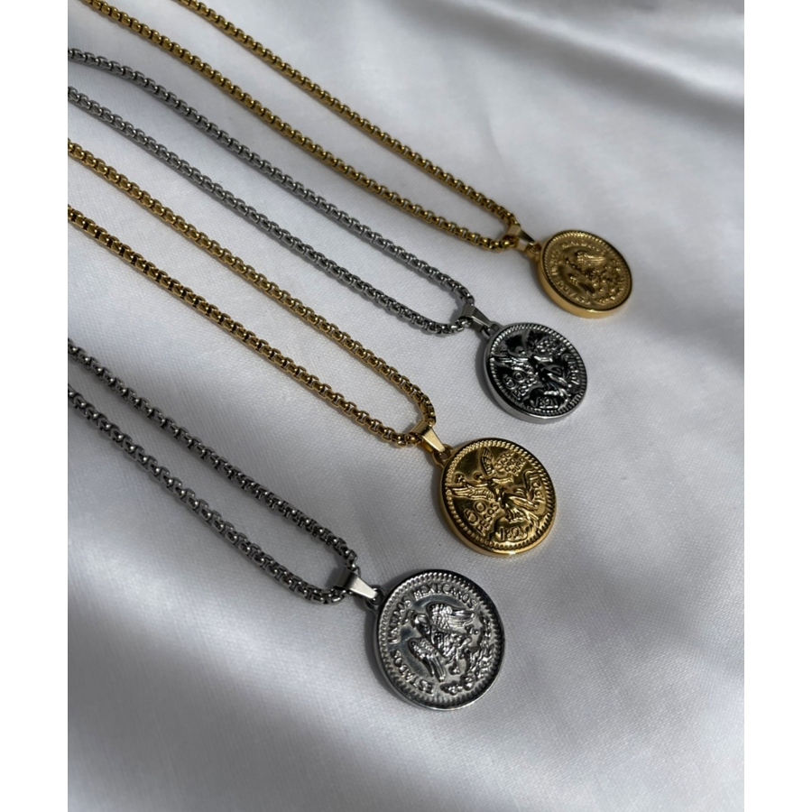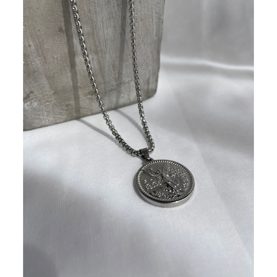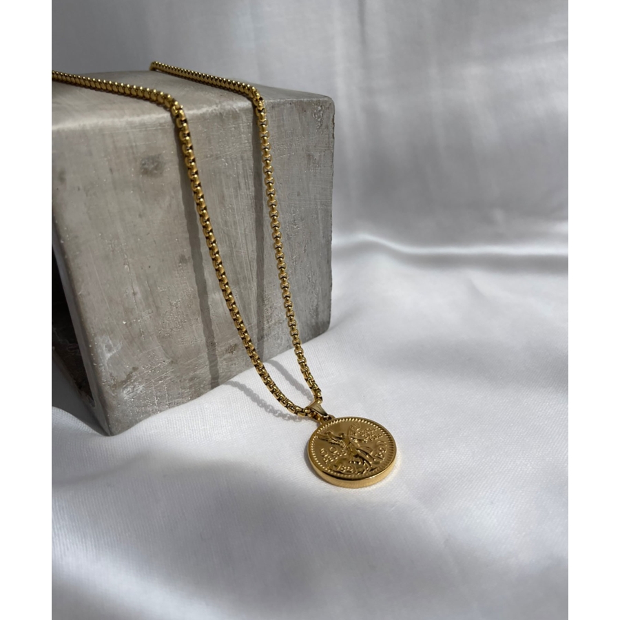 珍しいメキシコ50ペソのデザインが施されたコインネックレス。耐久性に優れており、長期間使用しやすい製品を探している方にぴったりです。2.5×2.5cmとインパクトがあるサイズのトップがポイント。トップを繋ぐのは、重厚感のある「ベネチアンチェーン」、大人っぽさを演出したい方にも適しています。トップを取り外し、チェーンのみ首からさげるといった使い方も可能。服や気分に合わせてコインを着脱できるおすすめの製品です。