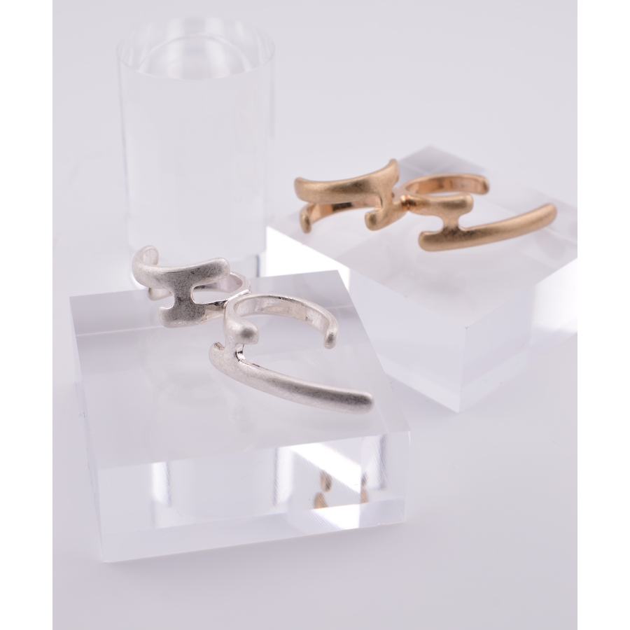2本の指をまたぐダブルフィンガータイプに、曲線美を活かしたバー状パーツを融合。滑らかなカーブとミニマルなラインが手元に彫刻的な存在感をもたらし、指先をアートのように飾ります。幾何学的でありながら有機的なフォルムが、日常のスタイリングに静かなエッジを添える一本。他にはないバランス感で、シンプルながらも印象に残るアクセントに。