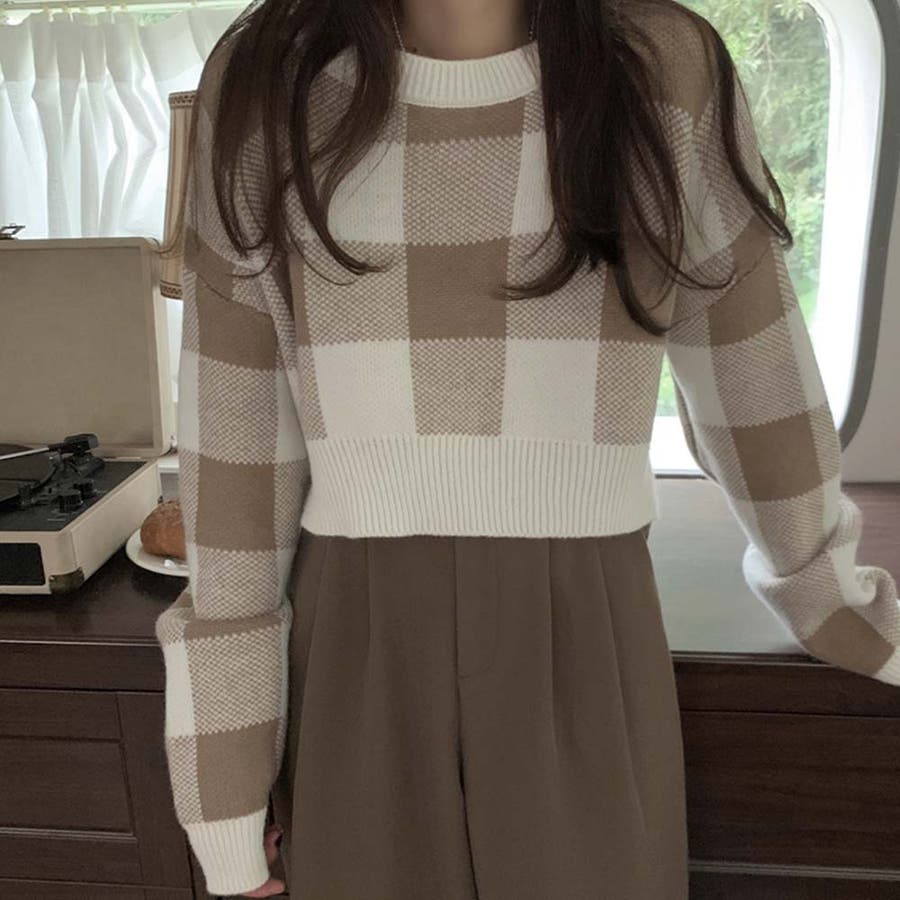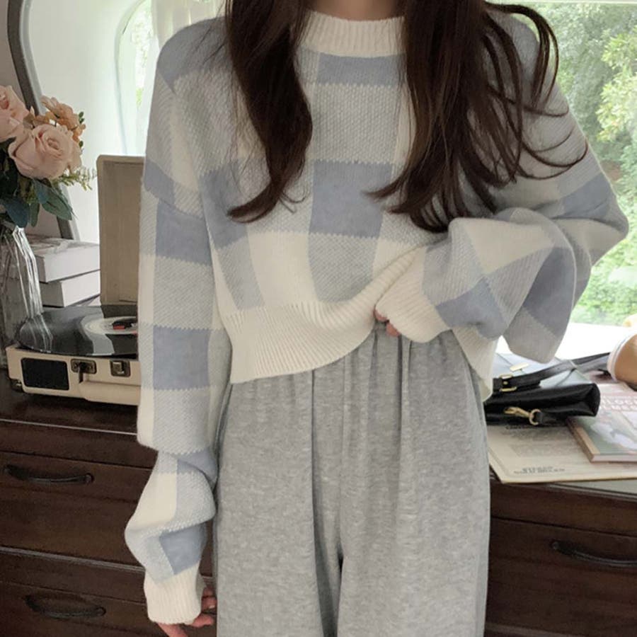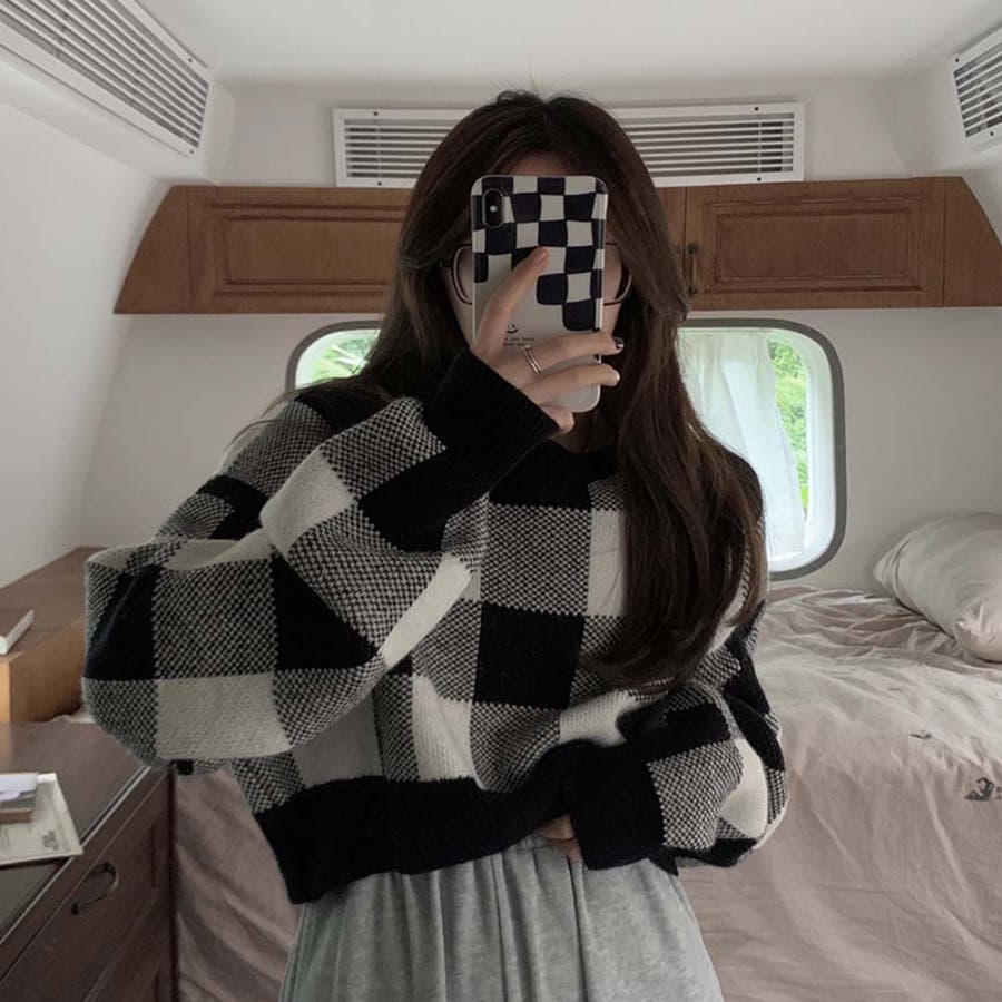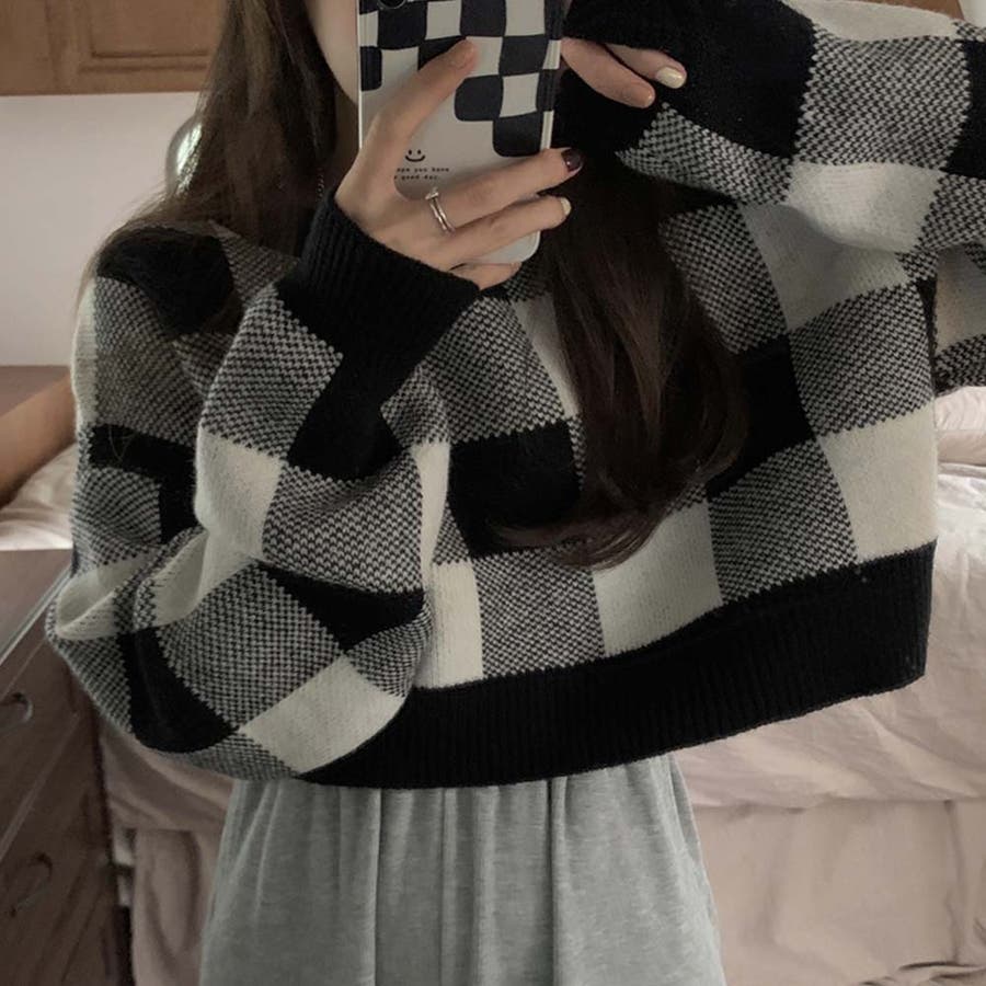 ギンガムチェックニットトップス【韓国ファッション】