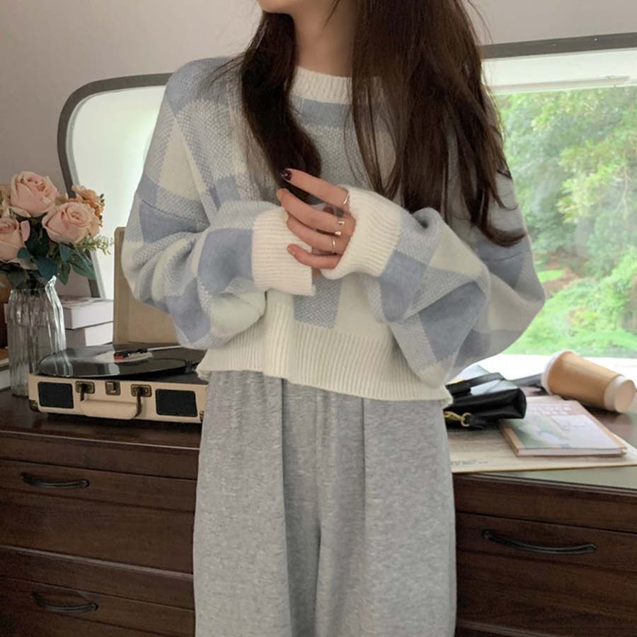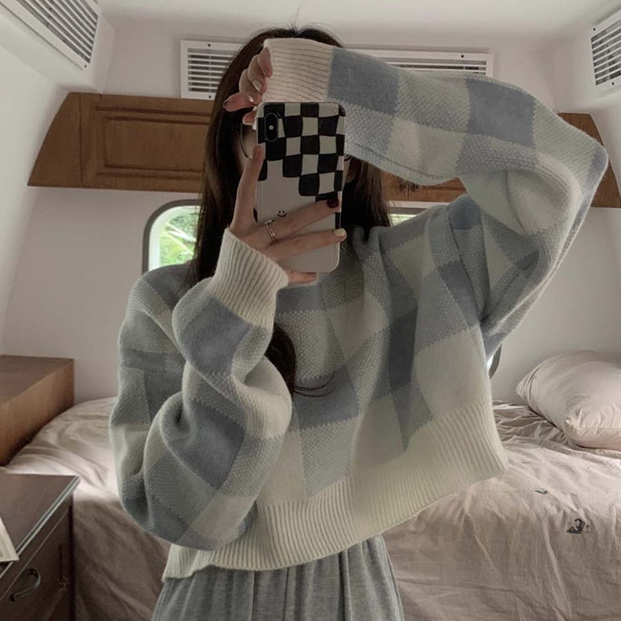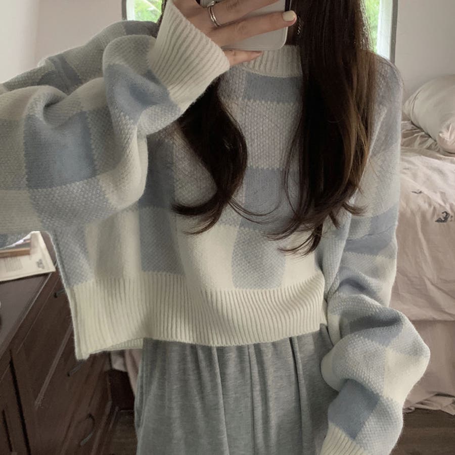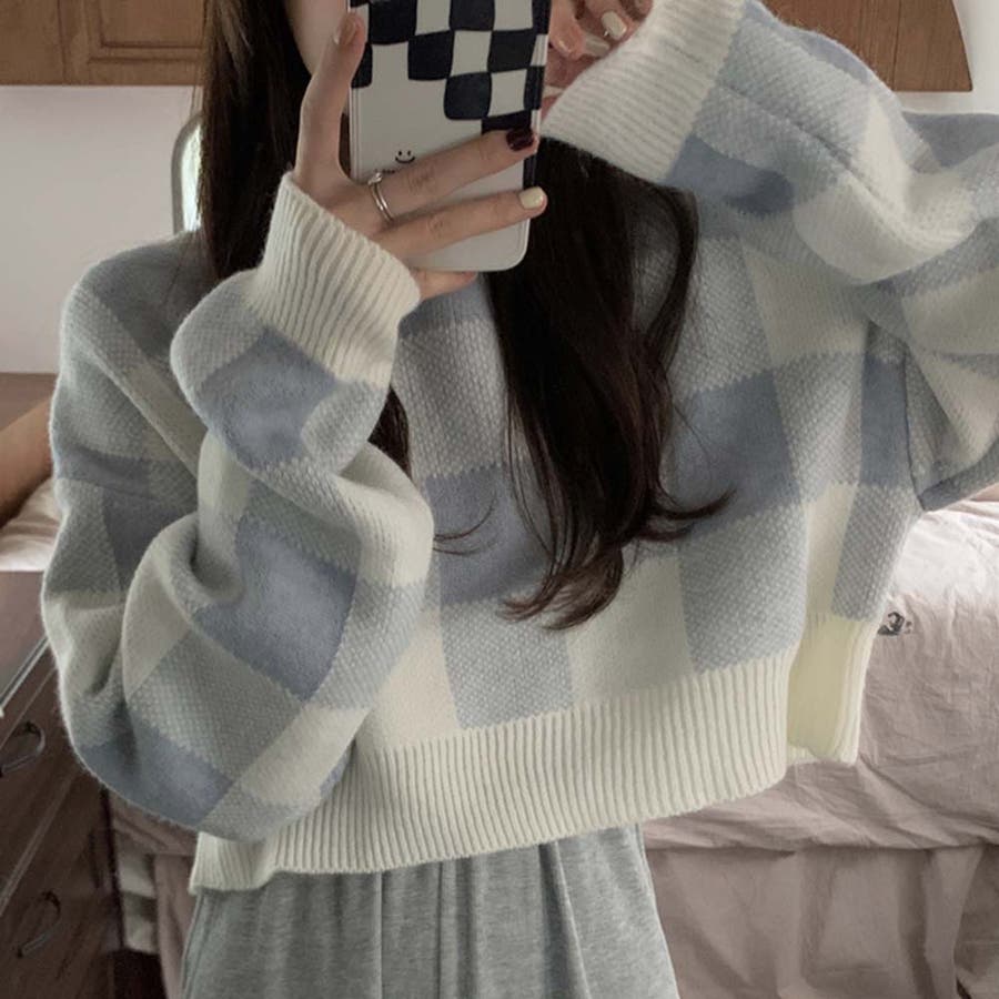 ギンガムチェックニットトップス【韓国ファッション】