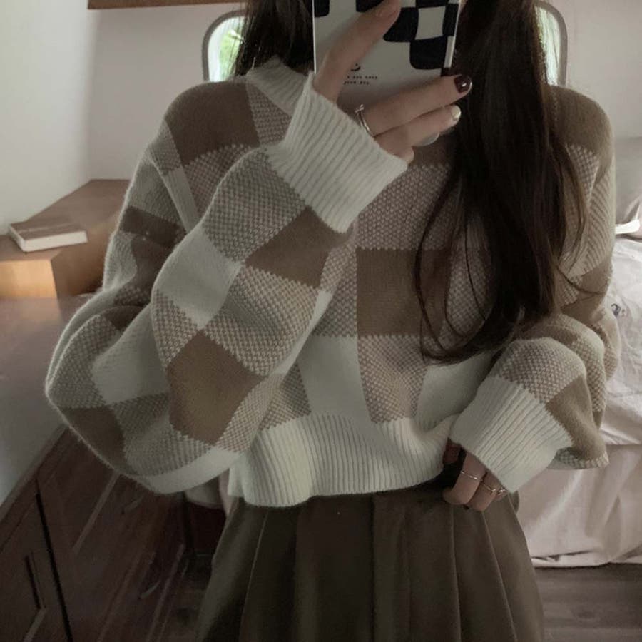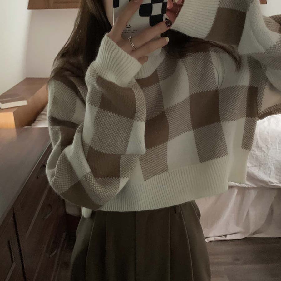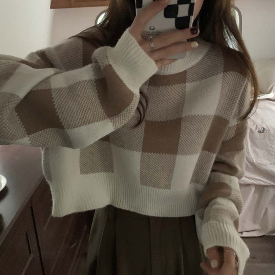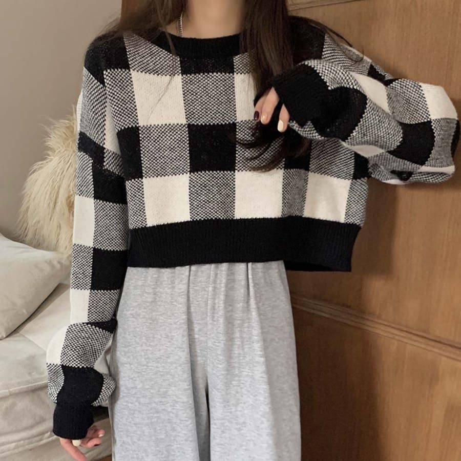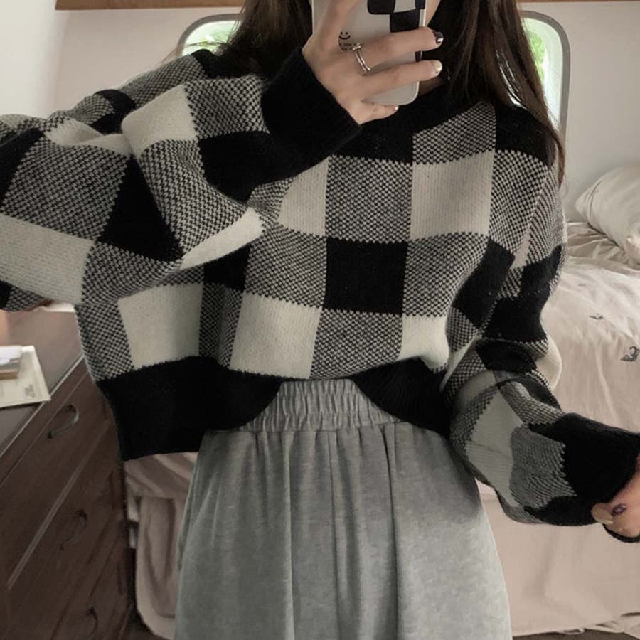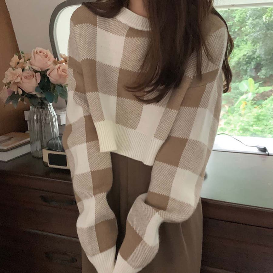大きいギンガムチェック柄が目を引くニットトップス。