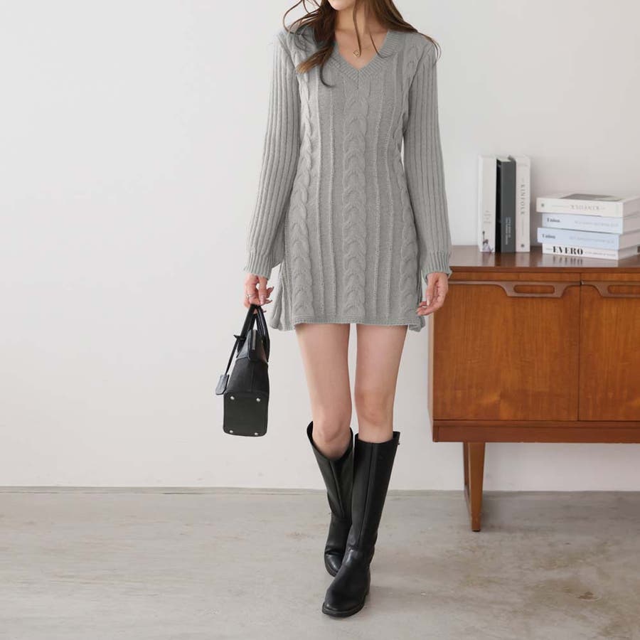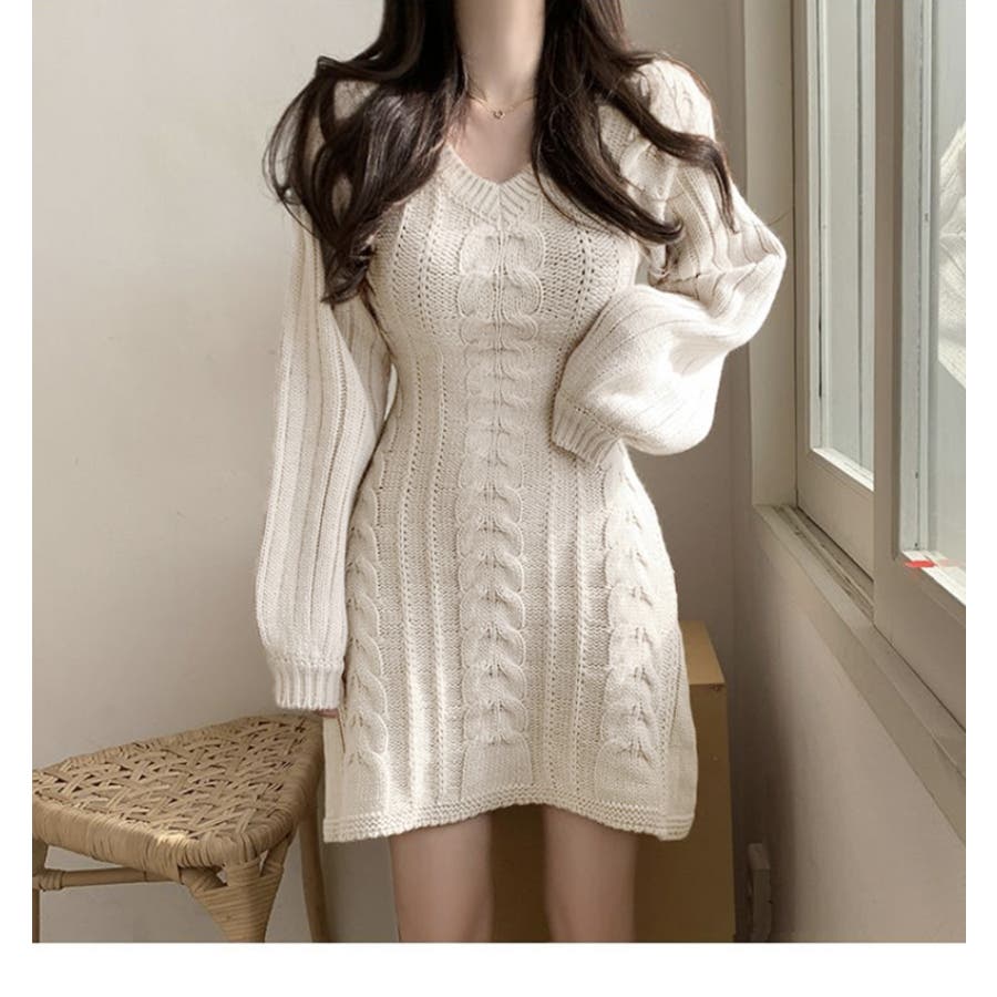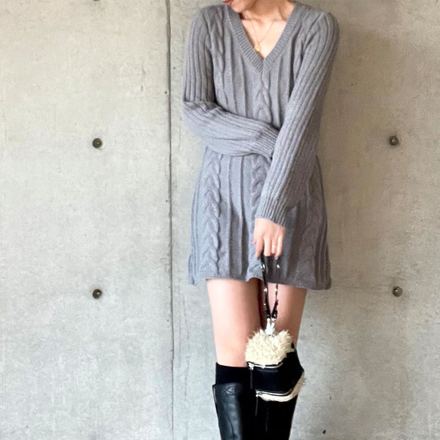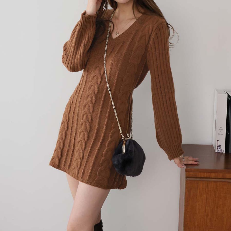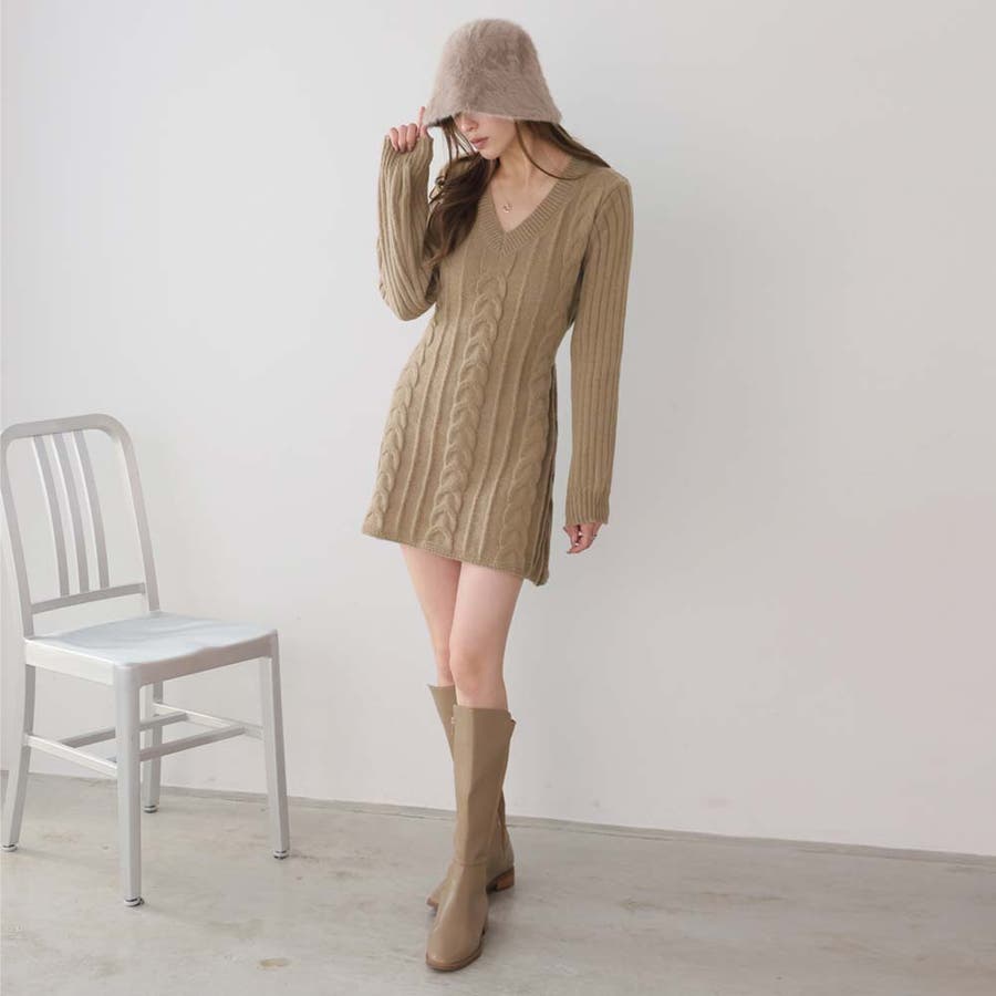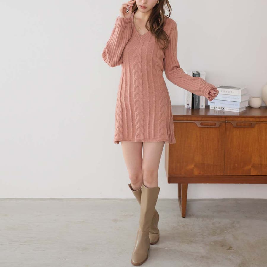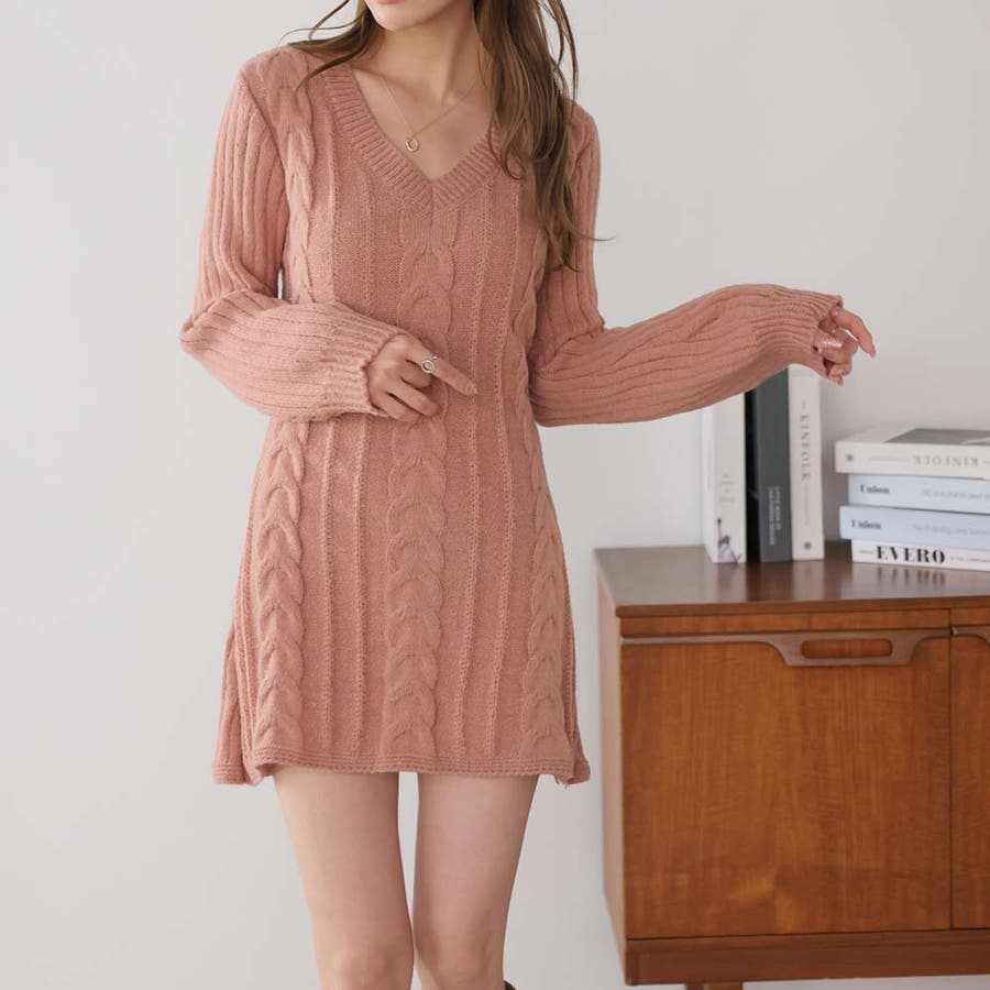 Vネックケーブルニットミニワンピース【韓国ファッション】