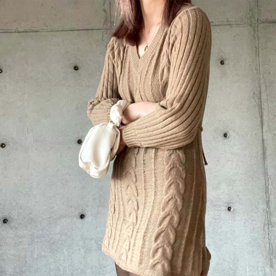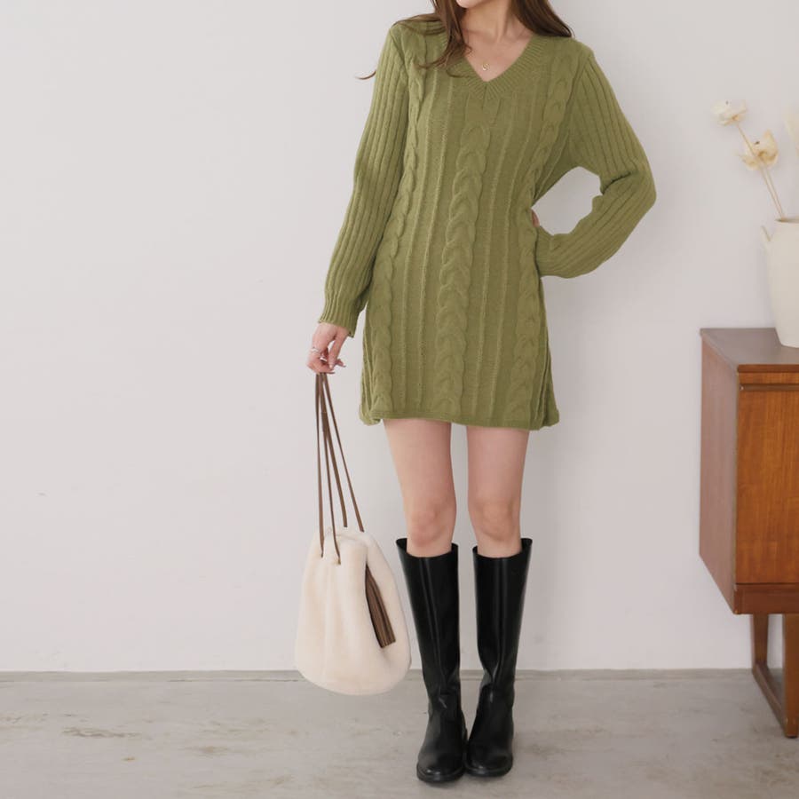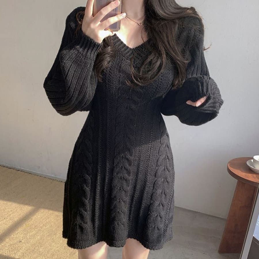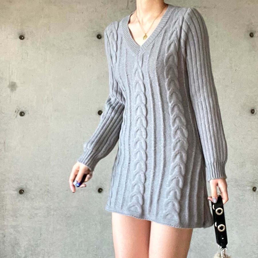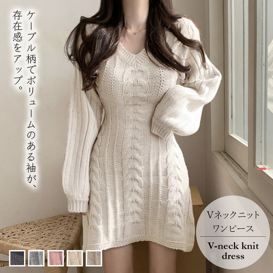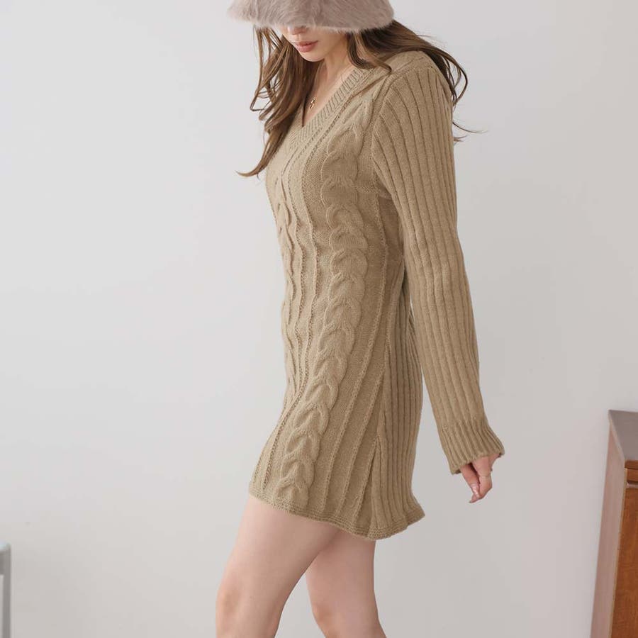 Vネックケーブルニットミニワンピース【韓国ファッション】