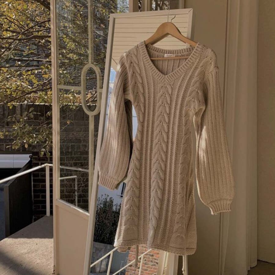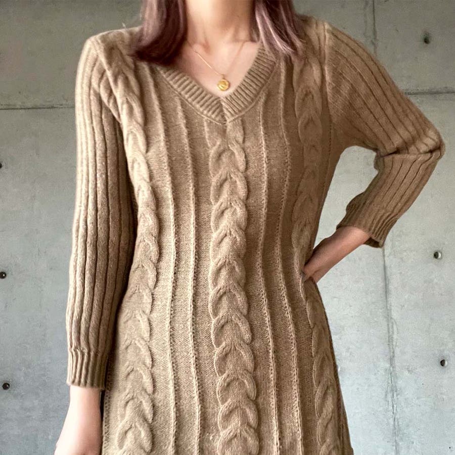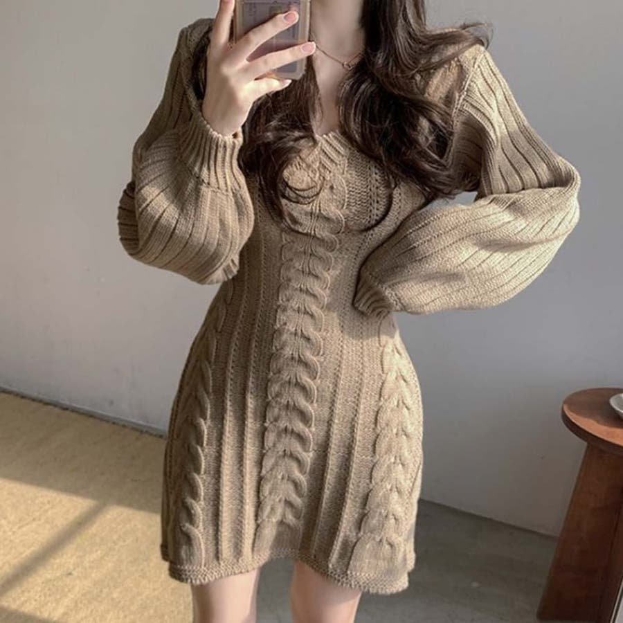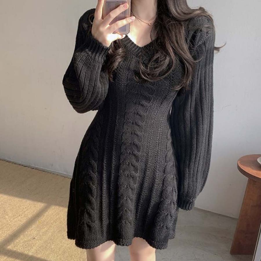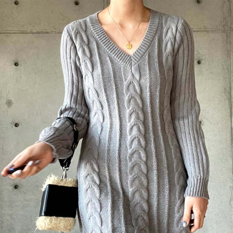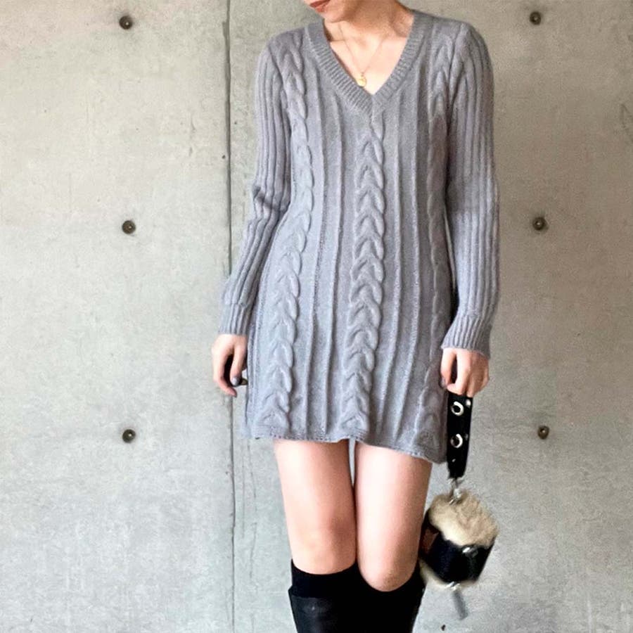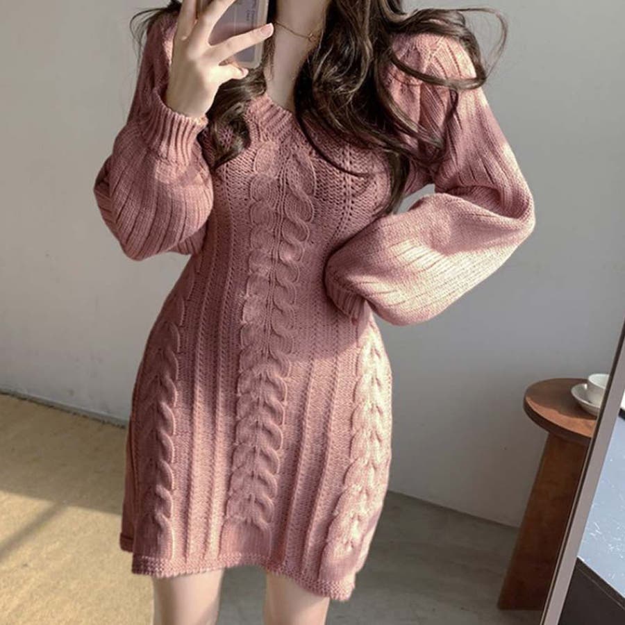 Vネックケーブルニットミニワンピース【韓国ファッション】